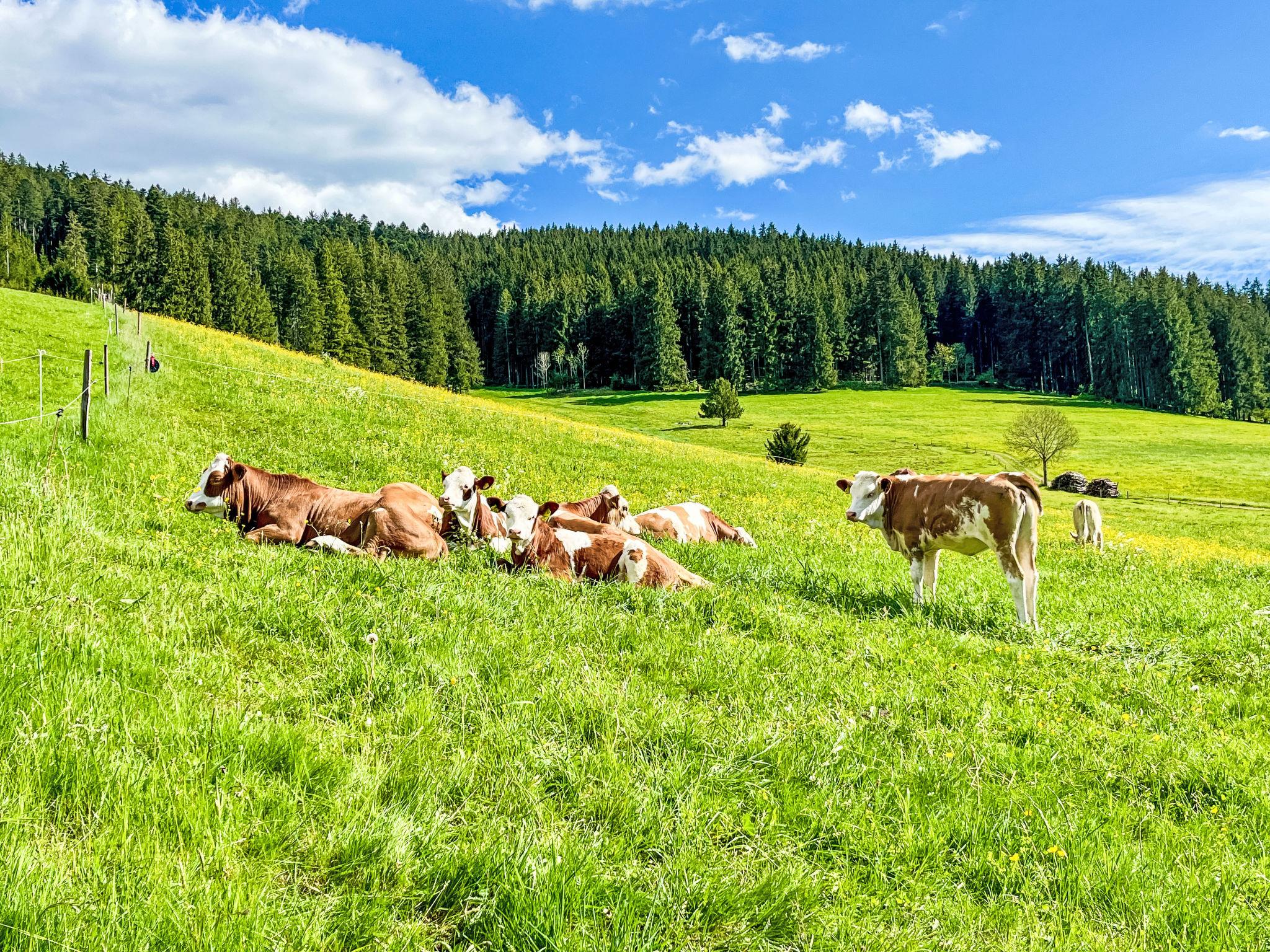 The outdoor area of our accommodation promises wonderful moments in the fresh air. You can relax on the sunny terrace and let your gaze wander over the calming landscape while savouring a glass of wine. The captivating natural beauty with fresh air, rolling hills and dense forests surrounding the flat provides the perfect setting for an escape from everyday life.