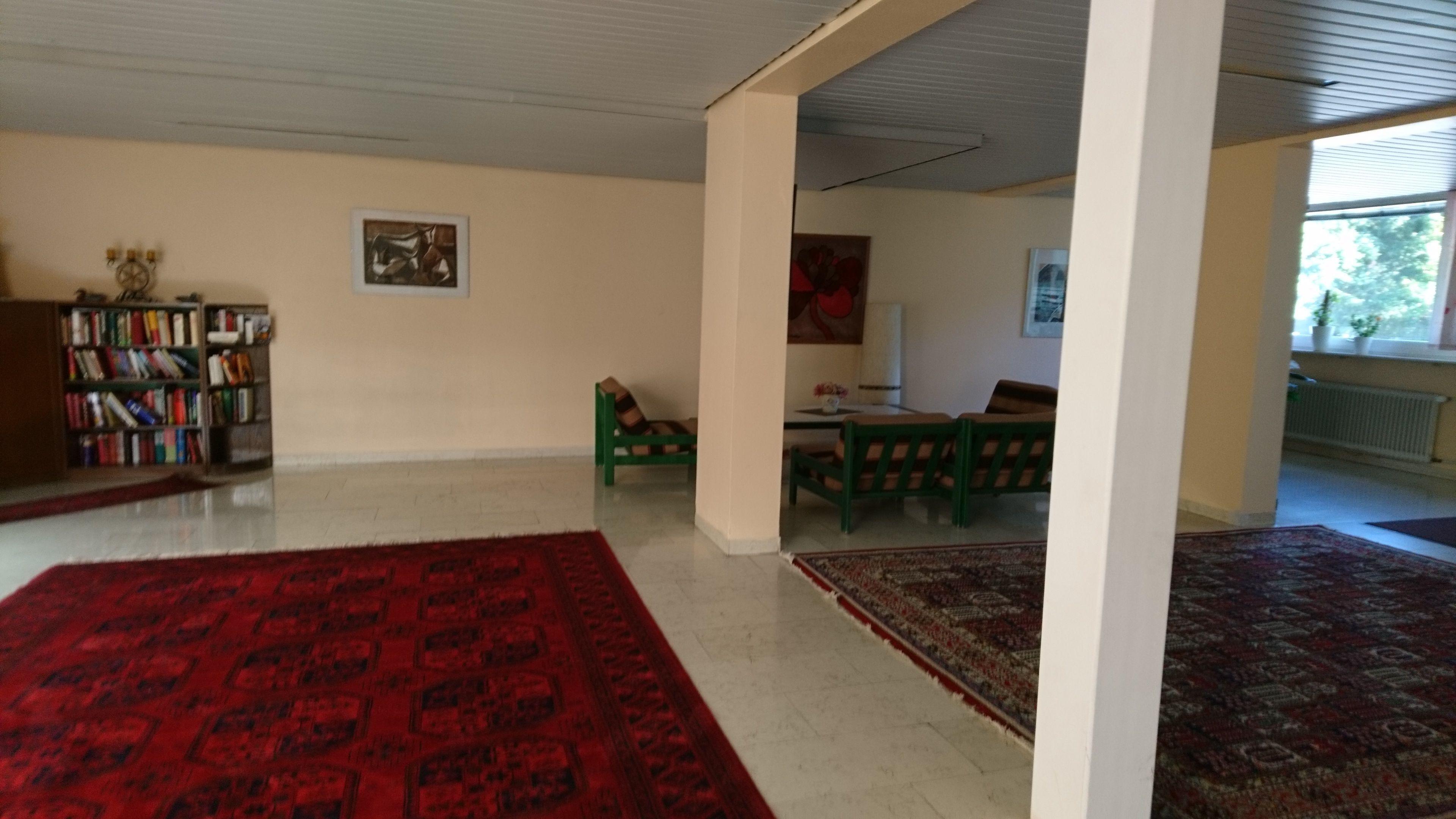Der Außenbereich bietet genügend Parkmöglichkeiten. Jede Wohnung hat einen fest zugewiesenen Parkplatz. Eine große Liege- und Spielwiese schließt sich ans Hallenbad an. Auch ein Bach fließt am Haus und an der Spielwiese vorbei.