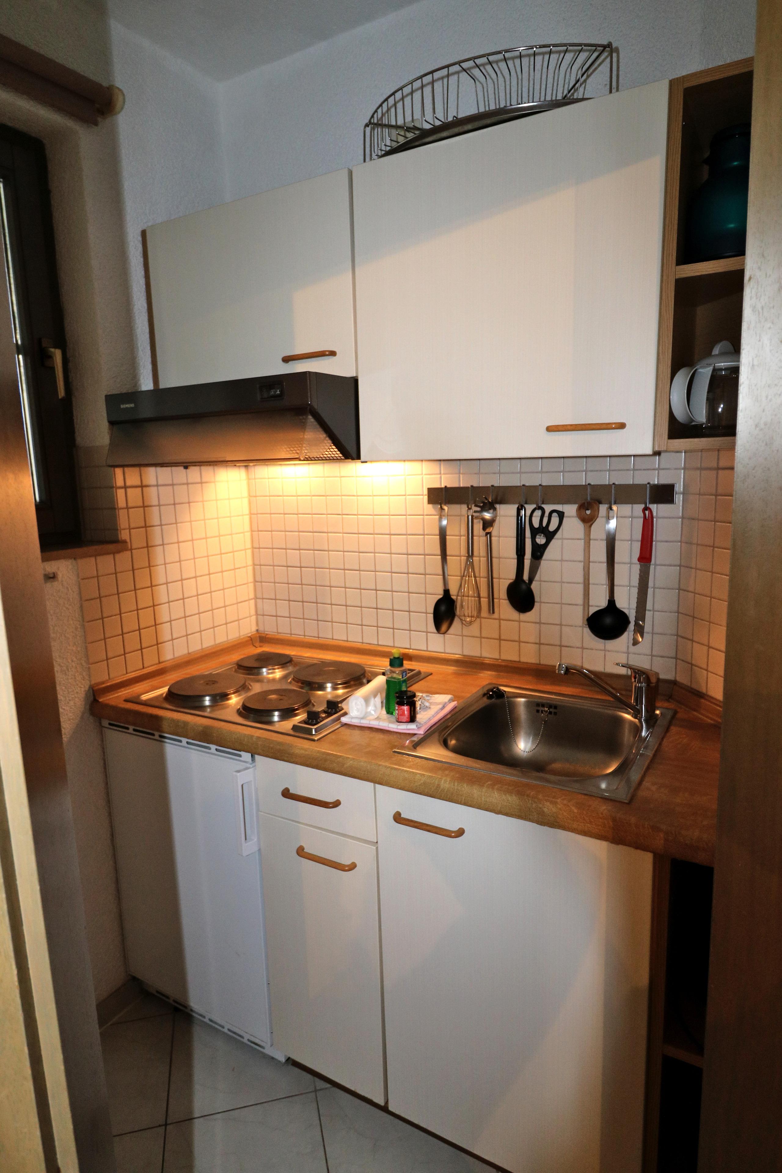Die komplett ausgestattete Küche verfügt über ein Kochfeld.
