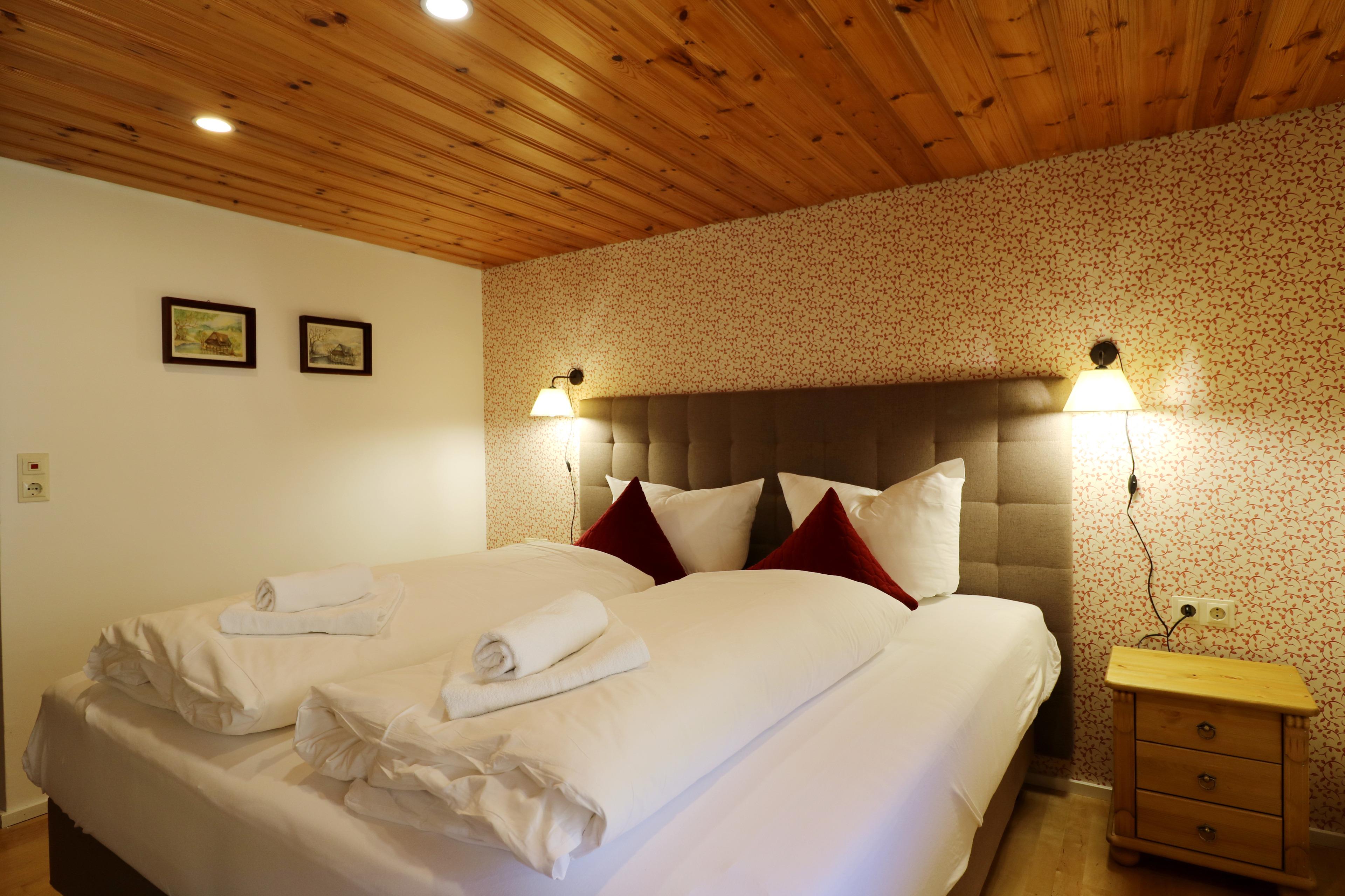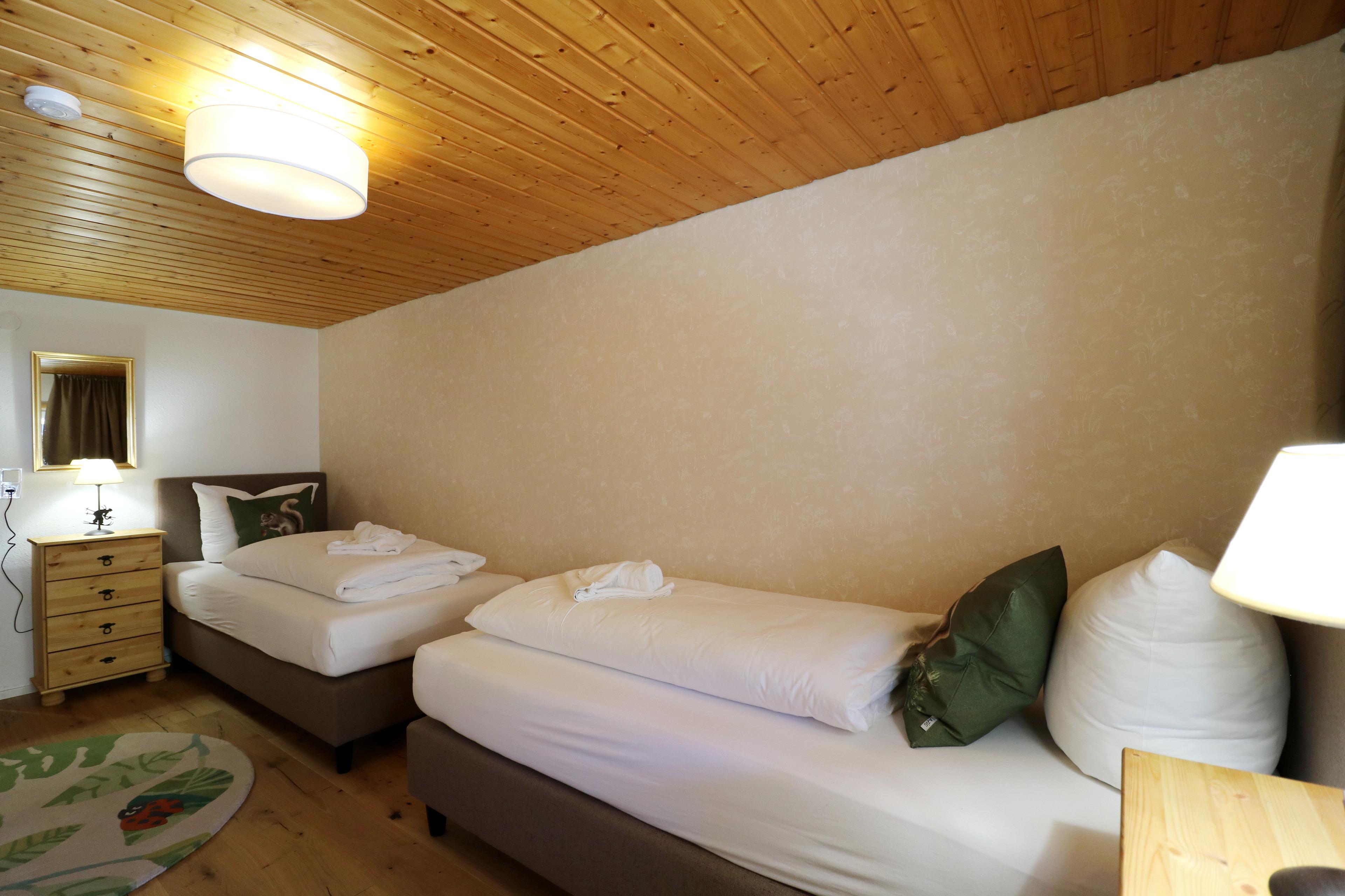 Im Erdgeschoss befindet sich ein Doppelzimmer mit angrenzendem Bad und eigenem Balkon. Über eine Treppe stehen im 1. OG vier weitere Schlafzimmer zur Verfügung, drei Doppelzimmer und ein Zimmer mit je zwei Einzelbetten. Auf diesem Stockwerk gibt es zwei weitere Duschbäder. Das "Hüsli" bietet Platz für maximal 10 Personen.