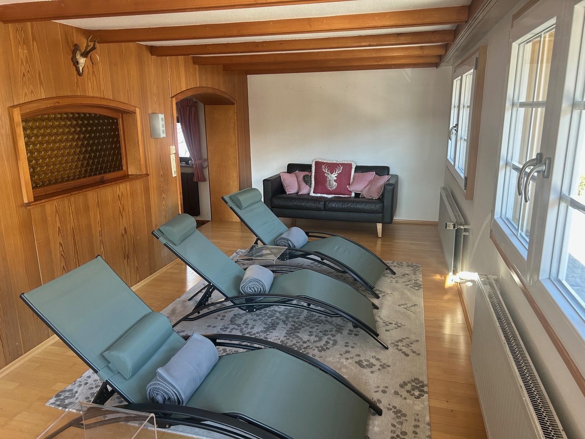 In summer, the garden offers plenty of sunshine, play opportunities for children and a view of the Swiss Alps. Inside the house, you can relax in the communal sauna or unwind in the cosy living room. The large corner bench offers space for cosy evenings with a snack and table games.