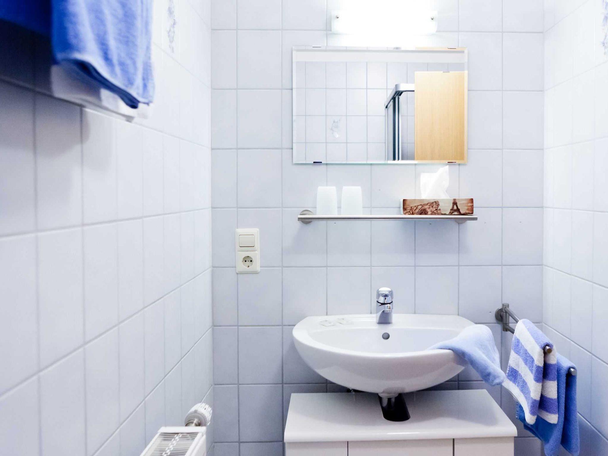 • Dusche, Toilette, Waschbecken mit Spiegel und Ablage, Handtuchhalter und Föhn