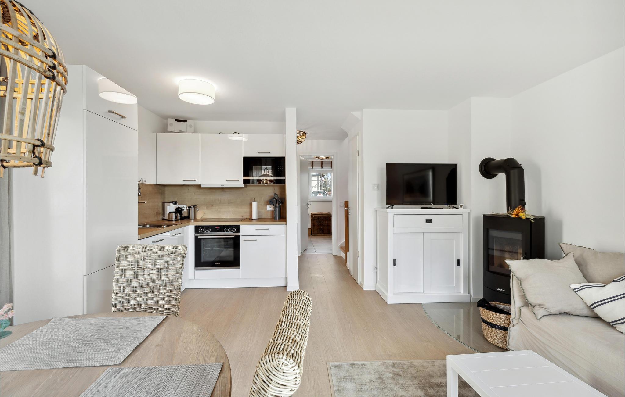 Ihr Haus erstreckt sich über zwei Etagen. Im Erdgeschoss befindet sich ein offener, gemütlicher Wohnbereich mit angrenzender Gartenterrasse und einer modernen Einbauküche, welche durch bodentiefe Fenster zum Verweilen einlädt. An kalten Tagen können Sie es sich vor dem eingebauten Kamin gemütlich machen. Neben dem Wohnbereich befindet sich ein helles Badezimmer mit Duschkabine und Infrarotsauna.