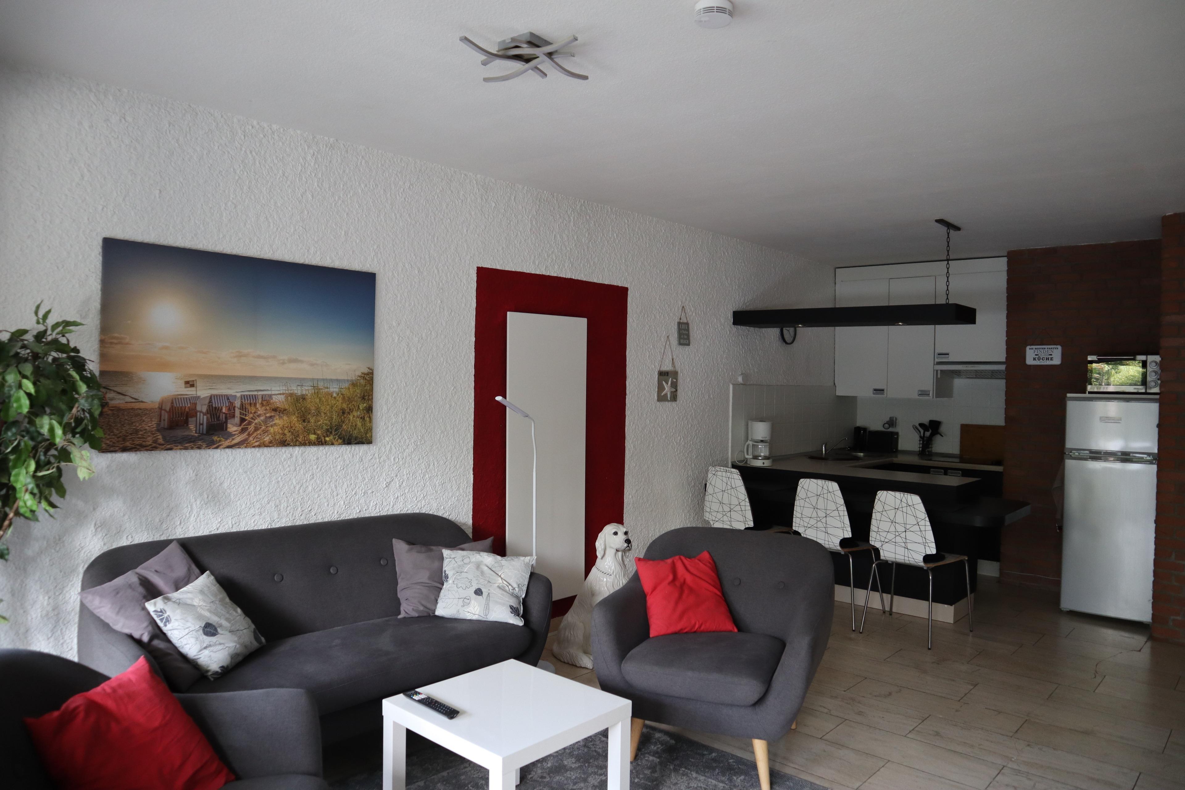 Die schöne und helle Nichtraucher-Ferienwohnung bietet Platz für bis zu 5 Personen (max. 4 Erwachsene). Die Wohnung befindet sich im Hochparterre mit Südbalkon. Der großzügig gestaltete offene Wohn-, Ess- und Küchenbereich bietet viel Platz für gemeinsame Stunden. Für die Kleinsten gibt es einen Hochstuhl. Das Wohnzimmer ist mit Sat-TV, Bluray-Player und CD-Radio-Player ausgestattet. Im Wohnzimmerschrank sind zwei weitere herausklappbare Betten verstaut.