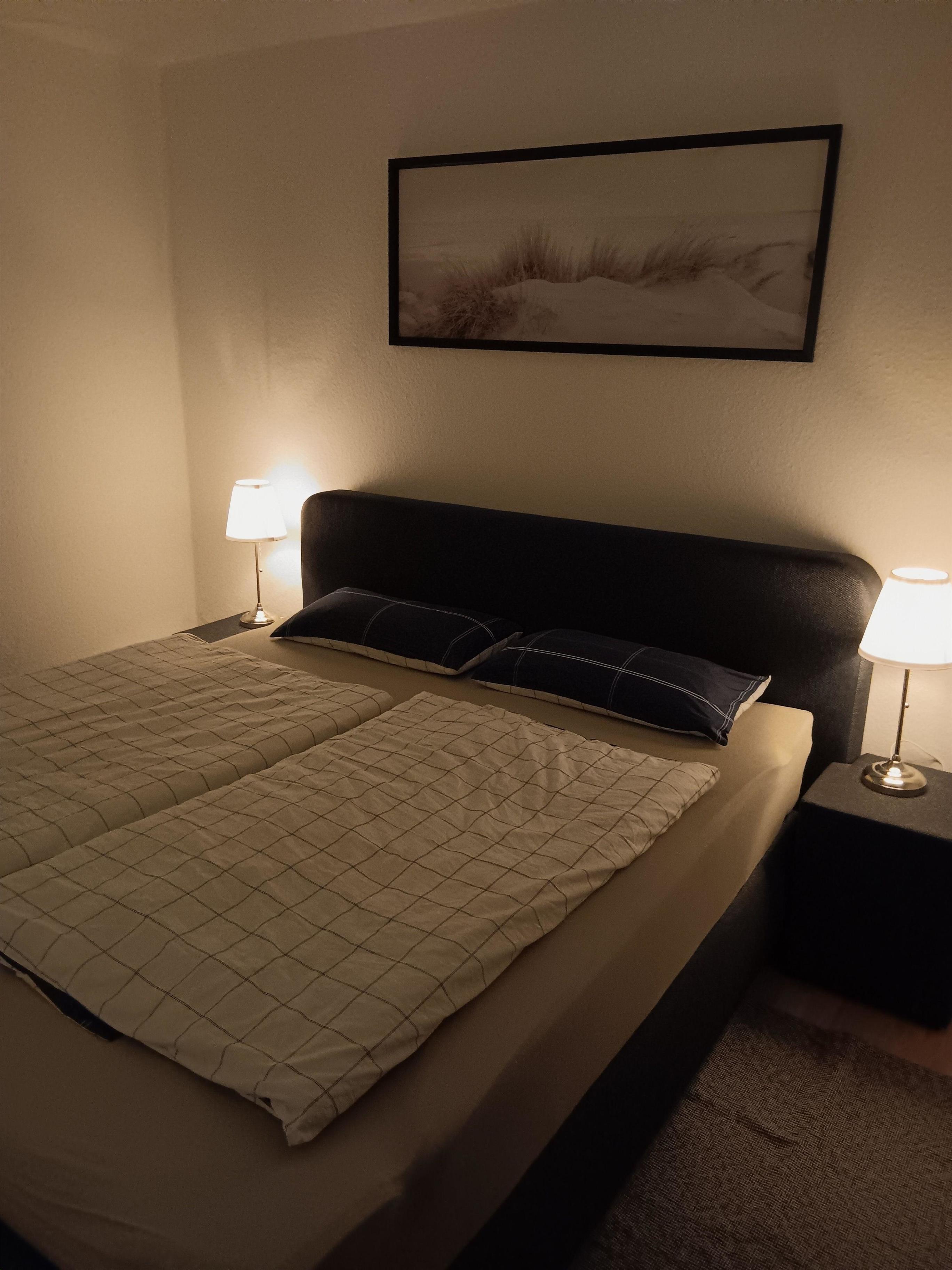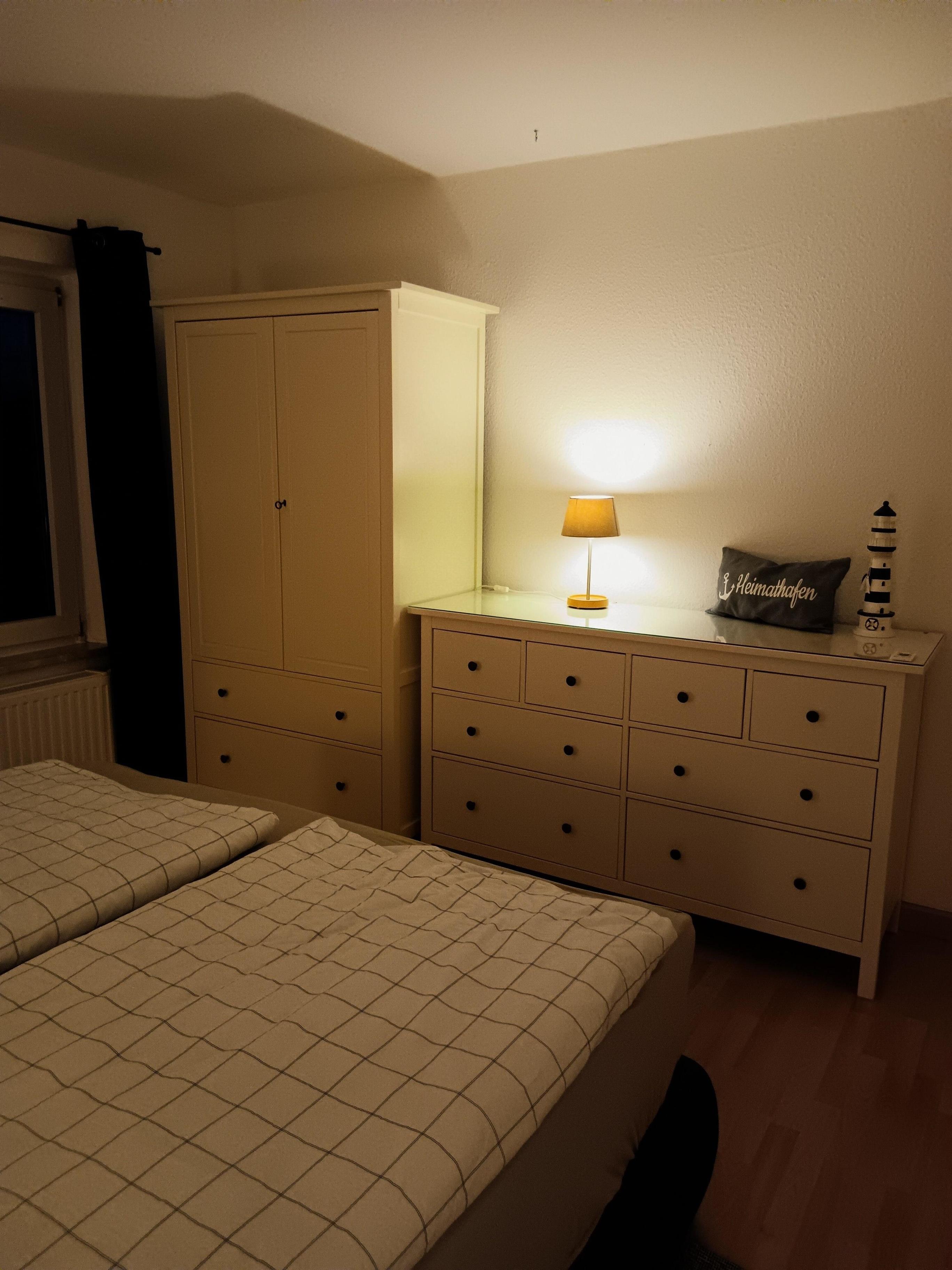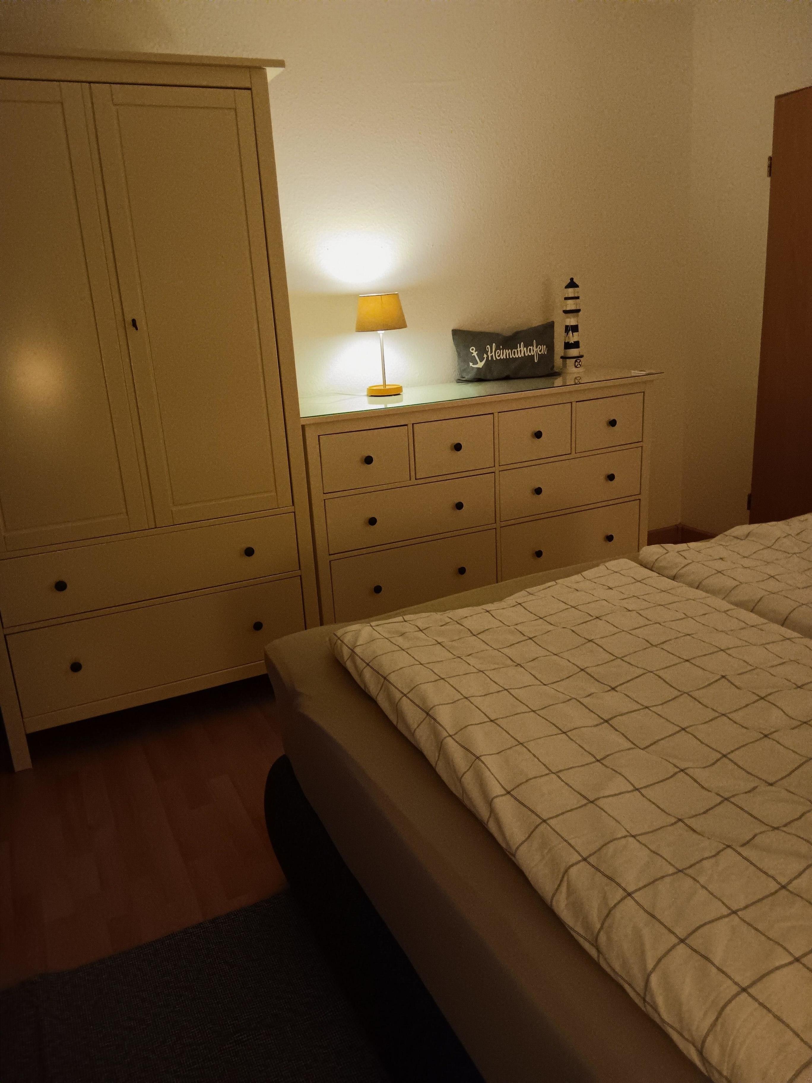 Im Schlafzimmer finden Sie ein 180cm x 200cm großes Bett und einen Kleiderschrank mit ausreichend Platz für die Kleidung während Ihres gesamten Aufenthaltes.
