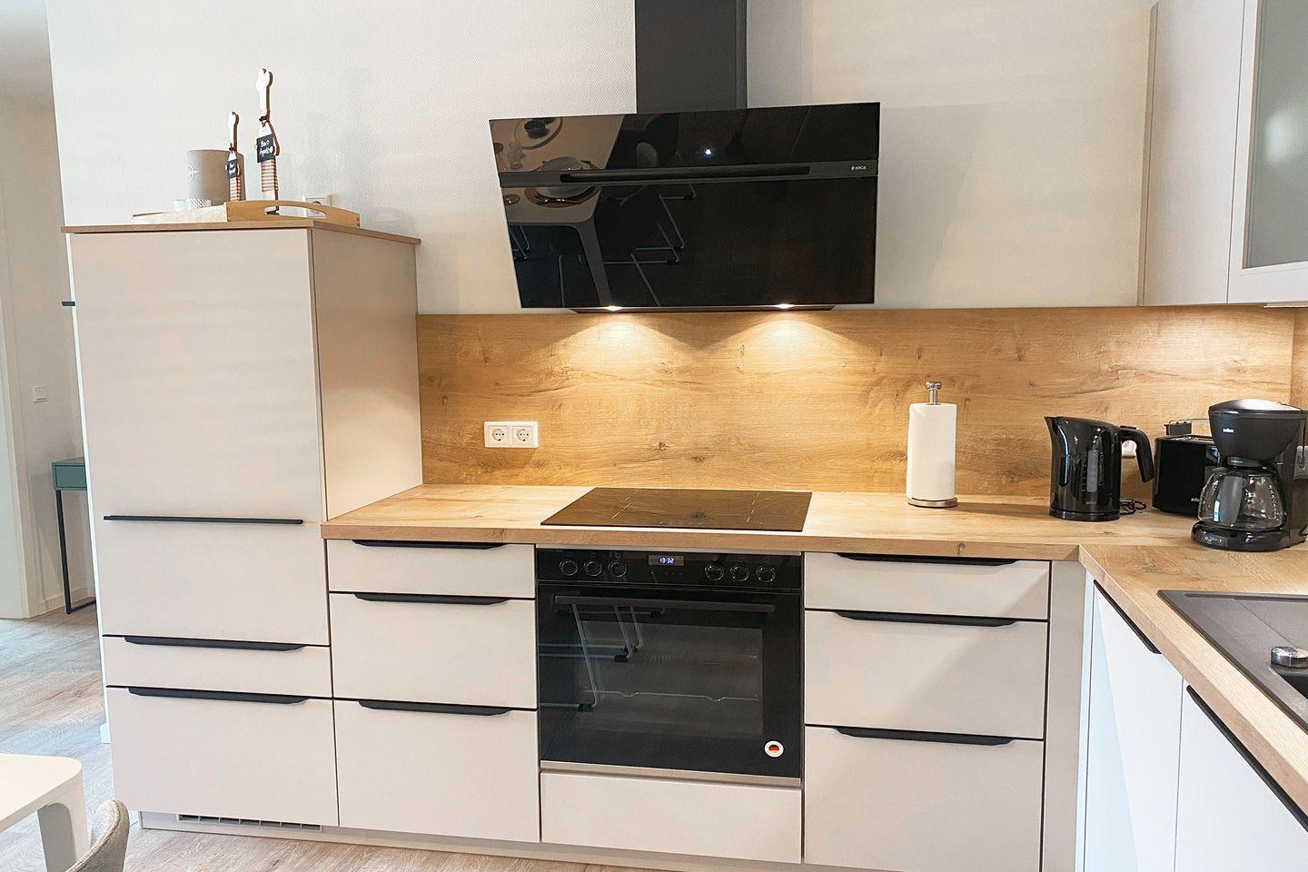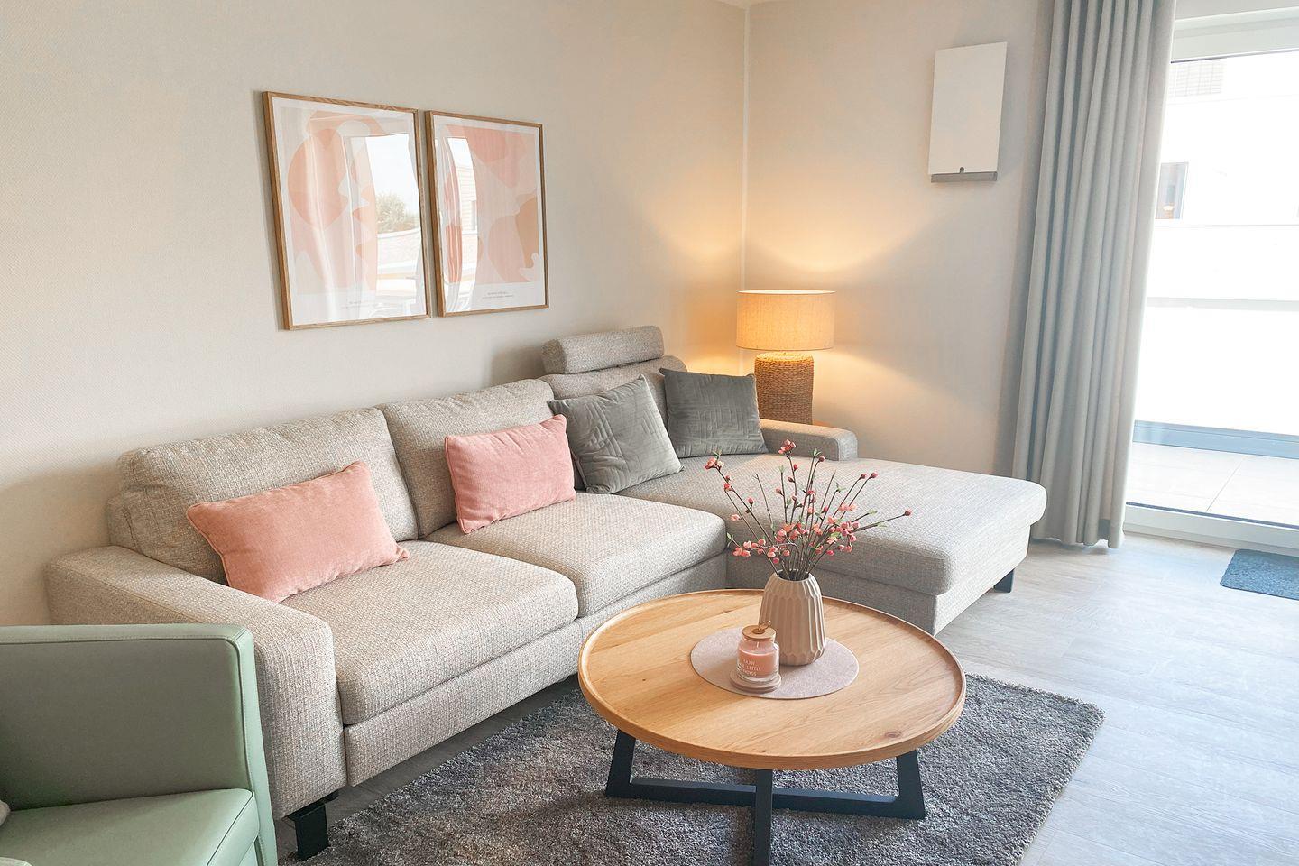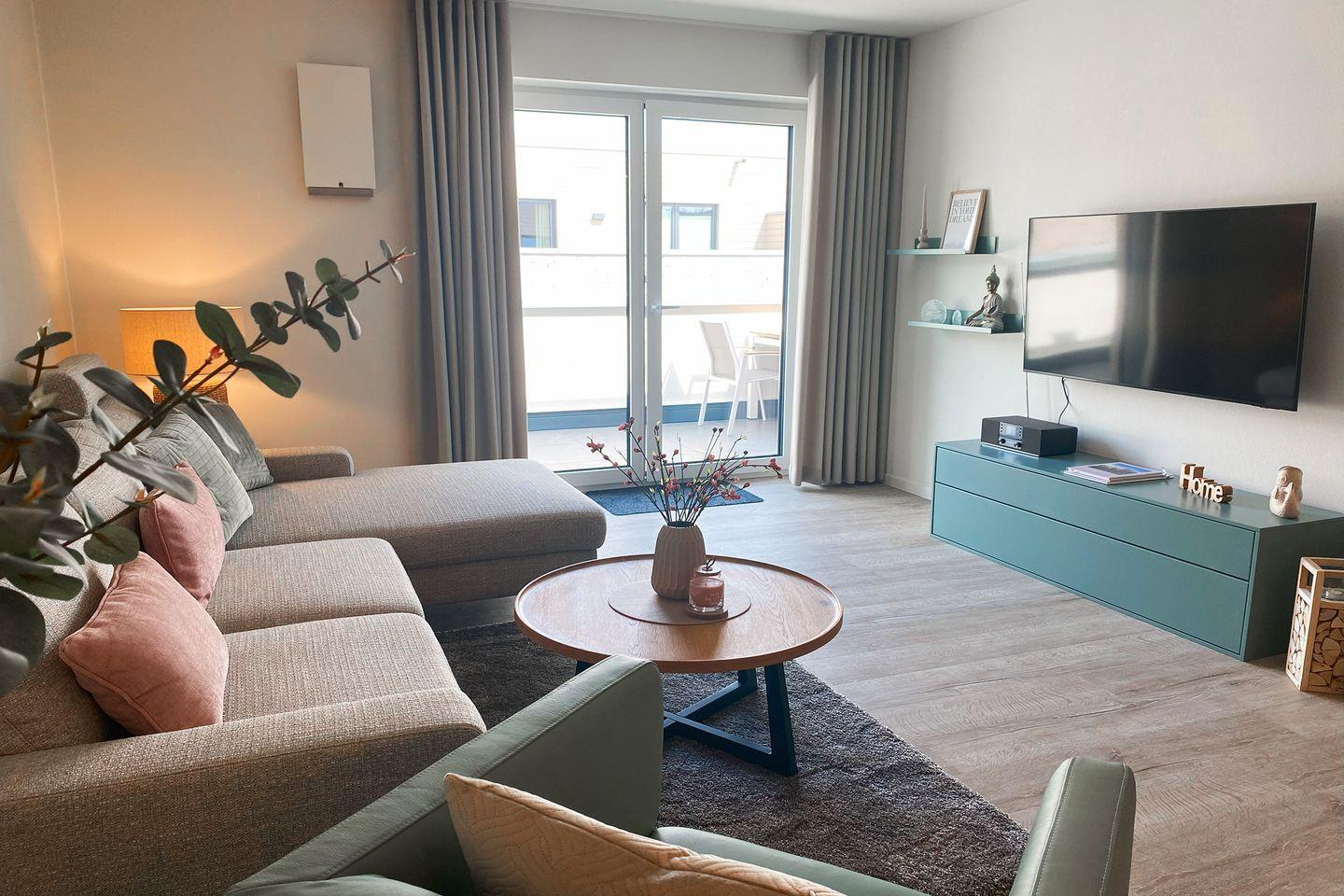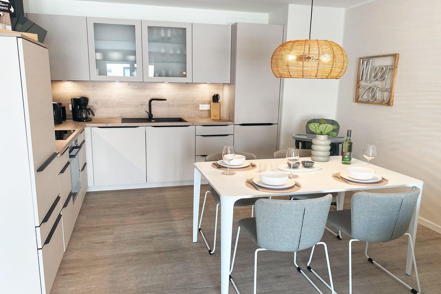 Der helle Wohnbereich mit Zugang zur Dachterrasse ist der perfekte Ort für entspannte Stunden. Ein hochwertiges Schlafsofa bietet Platz für zwei weitere Gäste. Großzügige Fenster sorgen für Licht und Weitblick, ein Smart-TV für Unterhaltung. Die offene Küche ist voll ausgestattet – ideal für gemeinsame Mahlzeiten und Spieleabende.