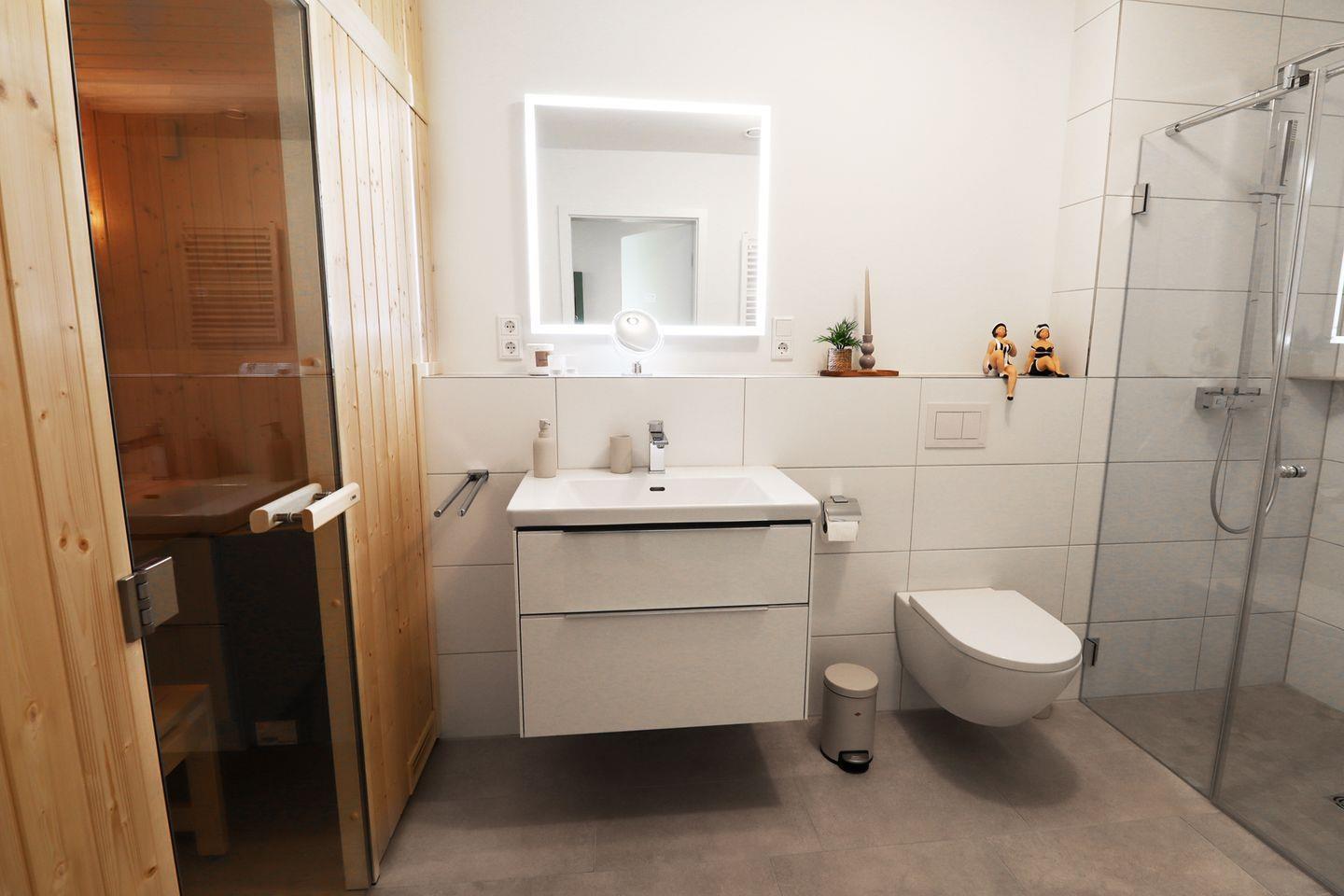 Im modernen Badezimmer erwarten dich eine private Sauna und eine komfortable, bodengleiche Dusche – dein perfekter Rückzugsort zum Entspannen und Wohlfühlen.