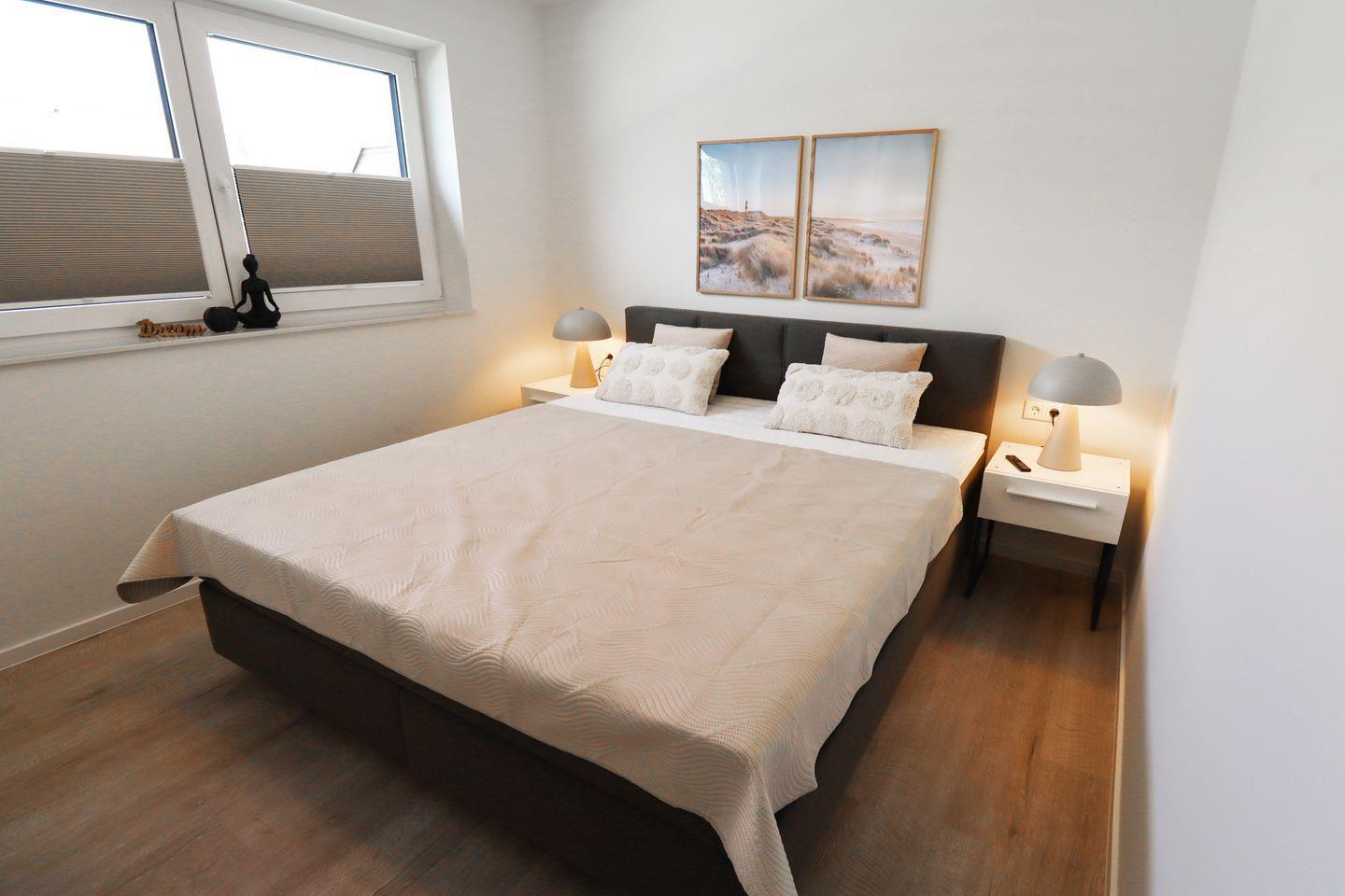 Das separate Schlafzimmer ist mit einem hochwertigen Boxspringbett (180 × 200?cm) und Smart-TV ausgestattet. Vom Schlafzimmer gelangt ihr direkt auf die Dachterrasse. Verdunkelungsplissees sorgen für eine ruhige und gemütliche Schlafatmosphäre.