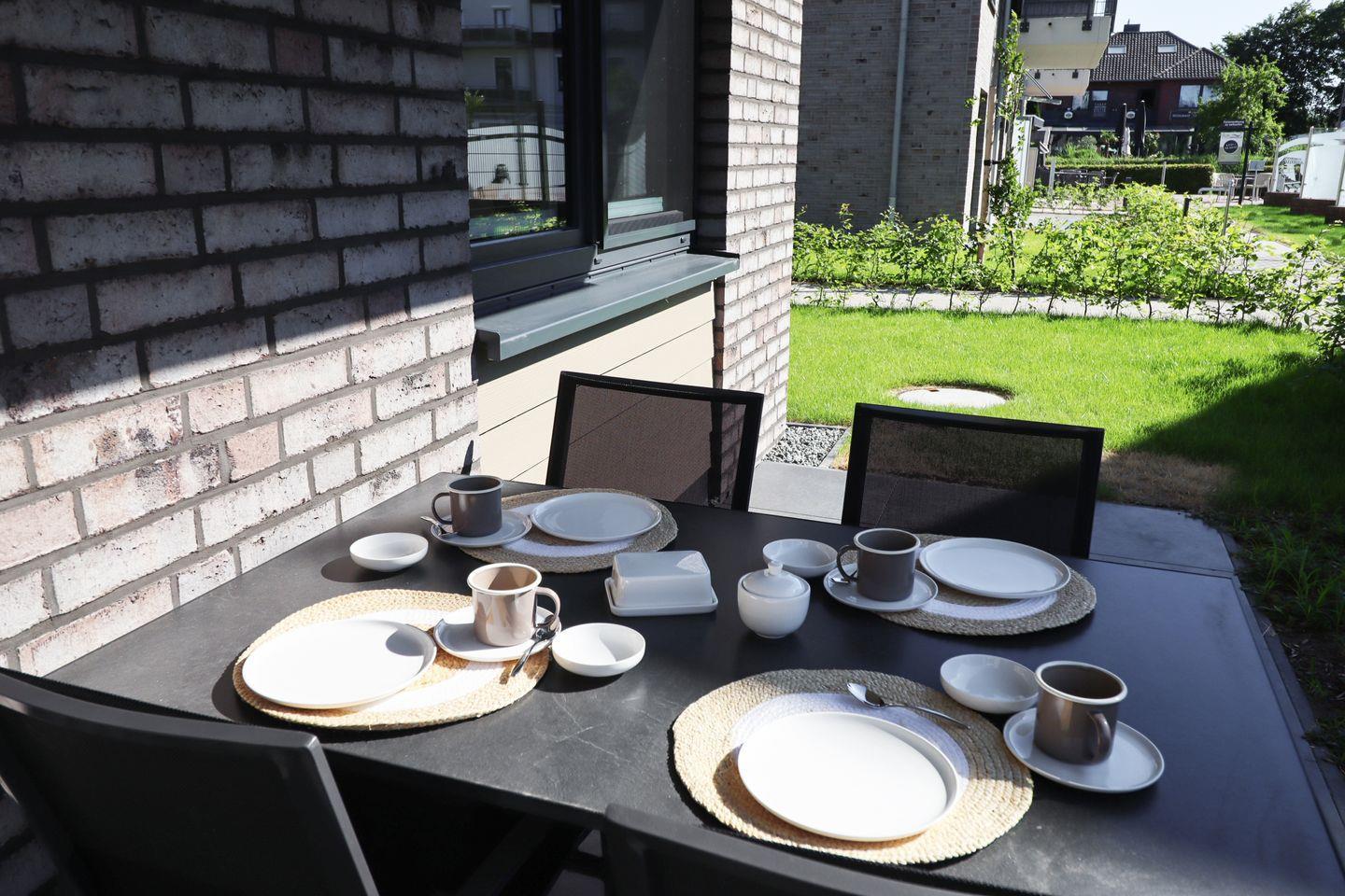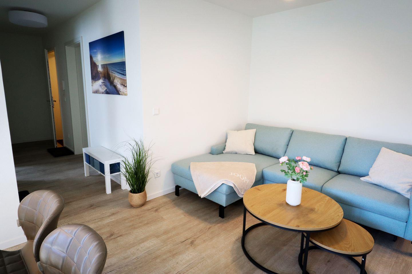 Der helle Wohnbereich lädt mit gemütlichem Sofa, Smart-TV und bodentiefen Fenstern zum Entspannen ein. Vom Wohnzimmer aus gelangst du direkt auf die möblierte Terrasse – ideal für dein Frühstück an der frischen Nordseeluft oder einen entspannten Abend im Freien.