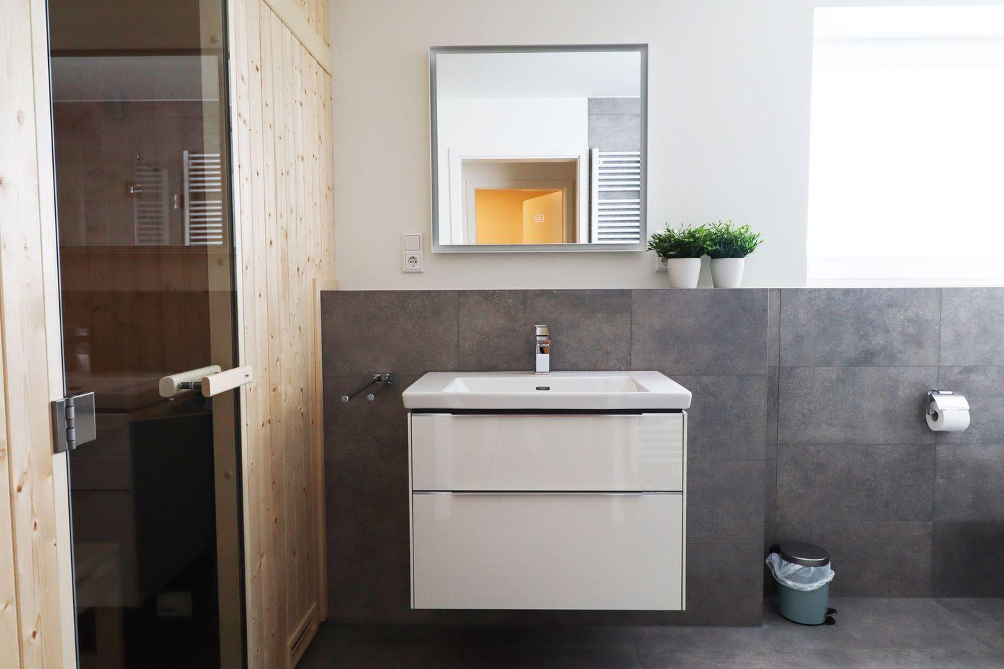 Ein echtes Highlight ist die private Sauna direkt in deiner Wohnung – perfekt für entspannte Auszeiten bei jedem Wetter. Dazu bietet dir das moderne Wellnessbad eine bodengleiche Dusche mit Regenduschkopf – Wellness pur direkt im Urlaub.