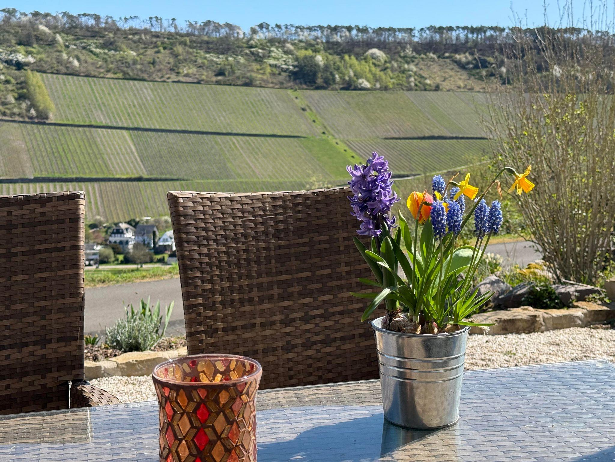 Großzügige Ferienwohnung (55 m²) mit unverbautem Moselblick und geschmackvoller Einrichtung. Wohn-/Essbereich mit Einbauküche incl. Spülmaschine und Mikrowelle; SAT-TV; WLAN; separates Schlafzimmer mit Doppelbett.