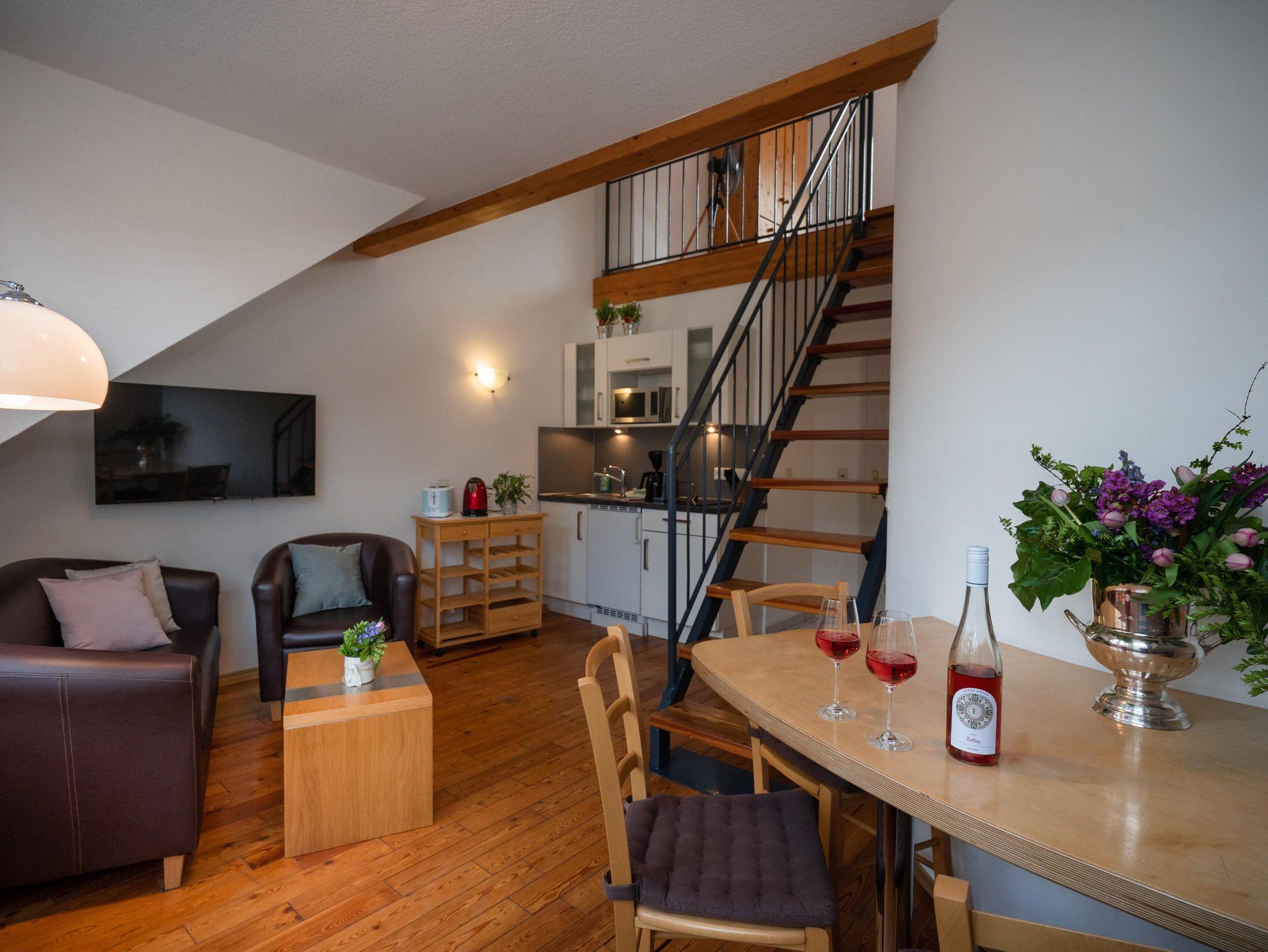 In unseren liebevoll restaurierten Apartments erwartet Sie Ruhe und Entspannung. Mit einem offenen Wohn- und Essbereich, ruhig gelegenem Schlafzimmer und einem Bad mit moderner Ausstattung fällt es leicht die Seele baumeln zu lassen. Zudem bietet ein Balkon oder unsere große idyllische Terrasse Gelegenheit die Sonnenstunden auszunutzen, sich sportlich zu betätigen z.B. beim Tischtennis spielen, oder in geselliger Runde zu Grillen und das leckere Essen zu genießen. Unsere gemütlichen Liegestühle laden dazu ein, z. B. bei einem unterhaltsamen Buch oder spannender Lektüre eine Zeit lang zu verweilen. Bei all dem dürfen unsere beliebten Weine nicht fehlen, die in jeder Ferienwohnung bereit stehen und nur darauf warten zu dem einen oder anderen Anlass getrunken zu werden, denn: