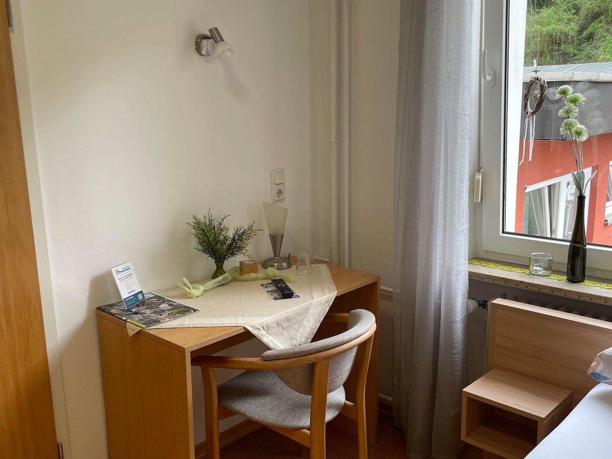 ruhiges, helles Zimmer, großer Schreibtisch, SAT-TV