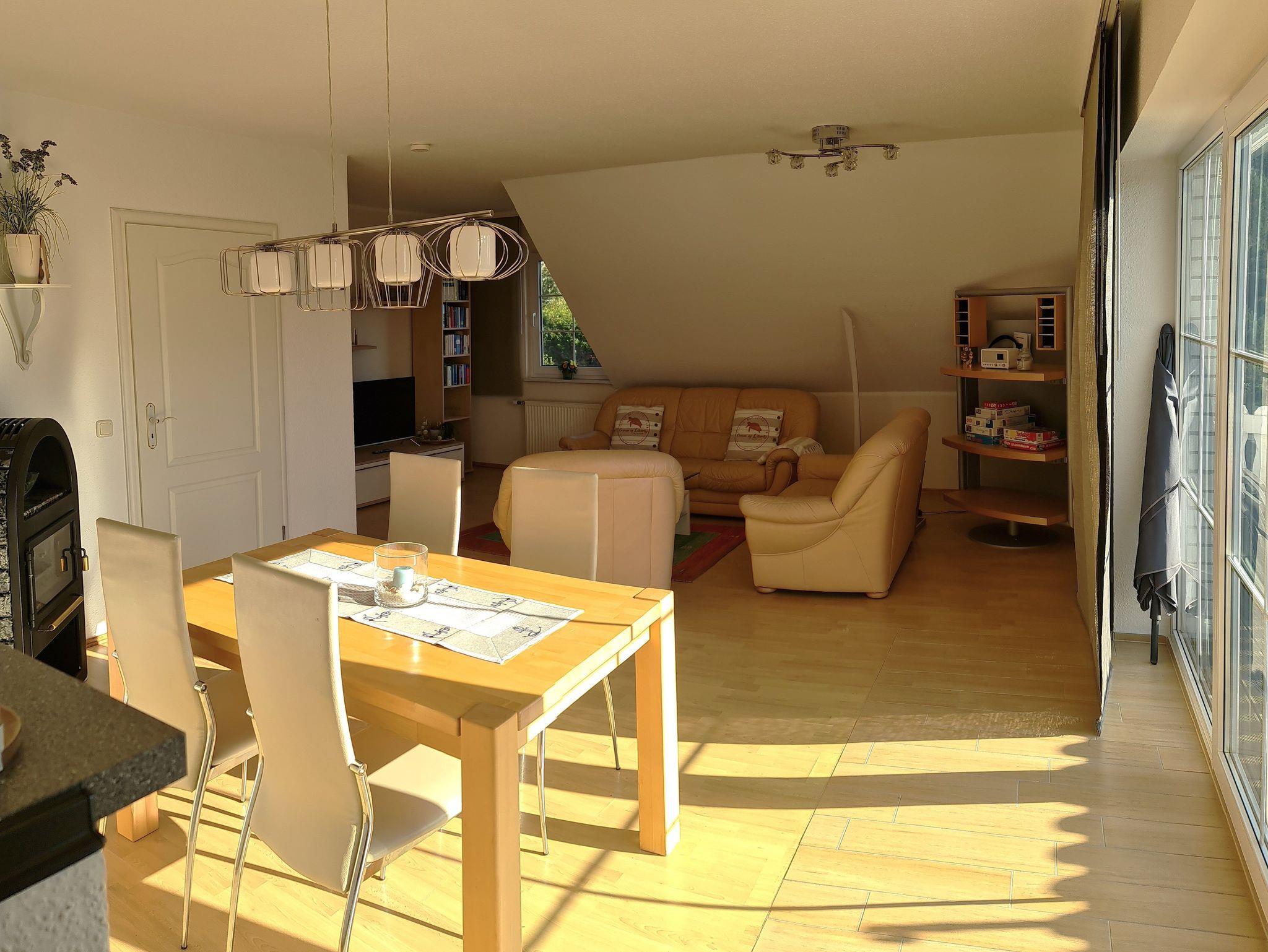 Wohnraum mit Essecke, Sofa, Kaminofen (nicht nutzbar), Tisch, Schränken