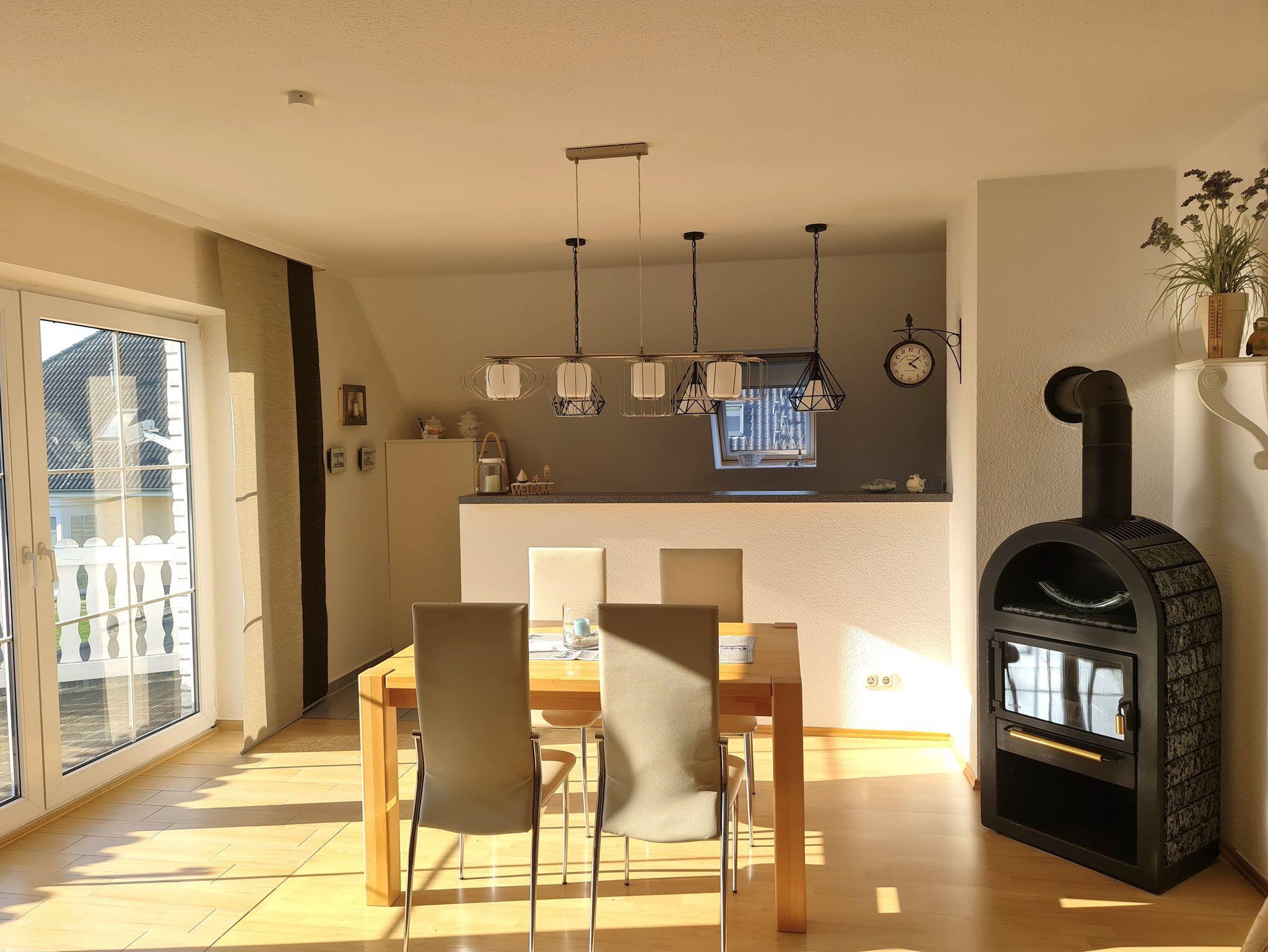 ? Wohnraum mit Essecke, Sofa, Kaminofen (nicht nutzbar), Tisch, Schränken