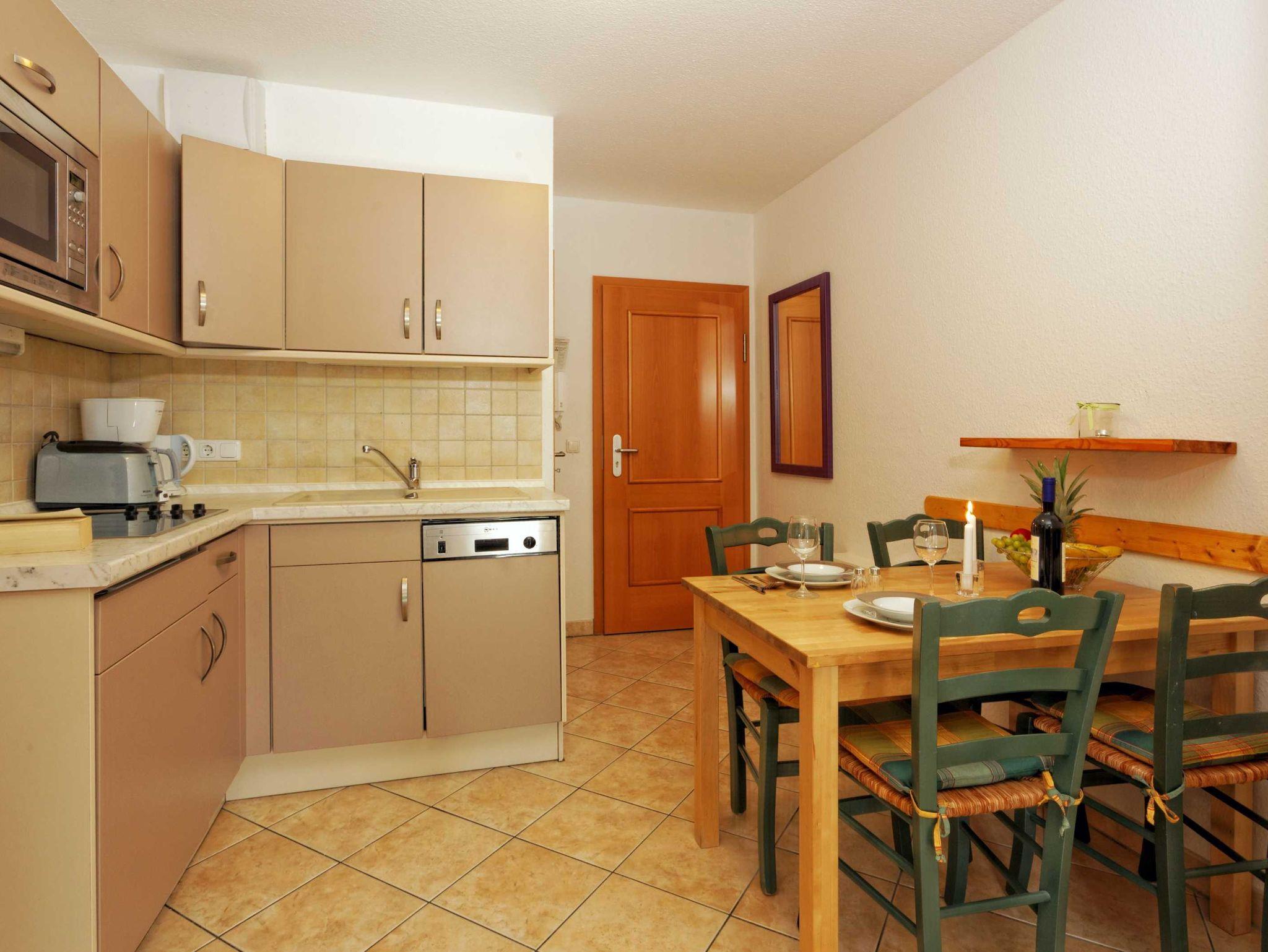 • Küchenzeile mit Geschirrspüler, Mikrowelle, Kühlschrank mit Gefrierfach, Cerankochfeld, Kaffeemaschine, Wasserkocher und Toaster