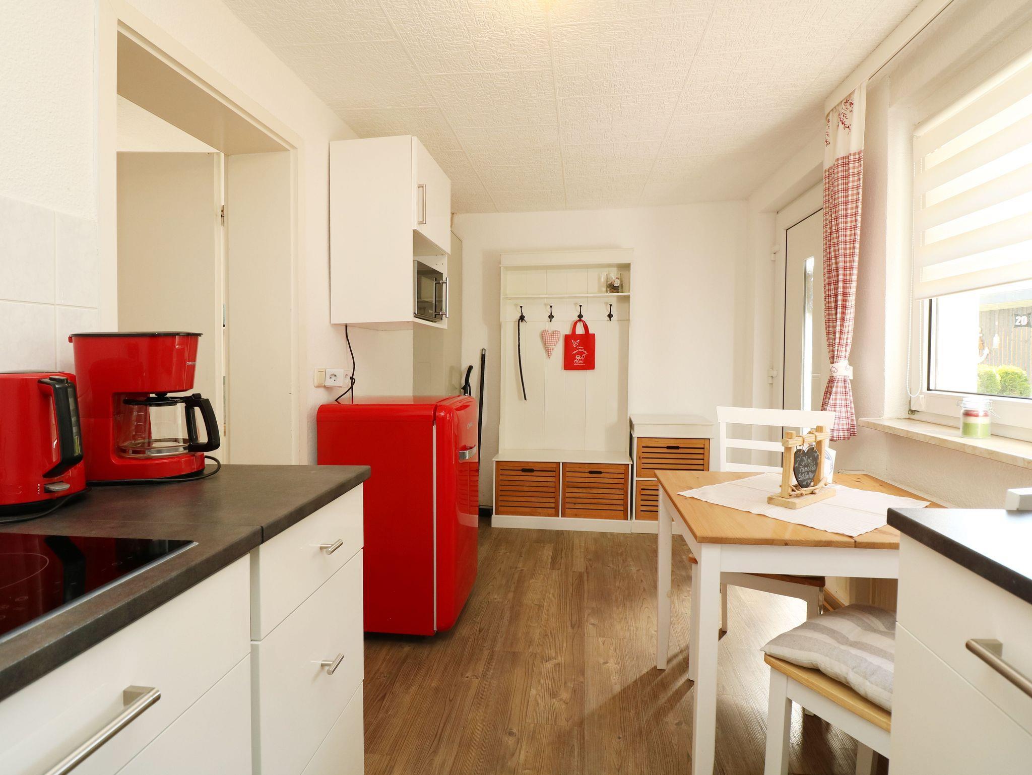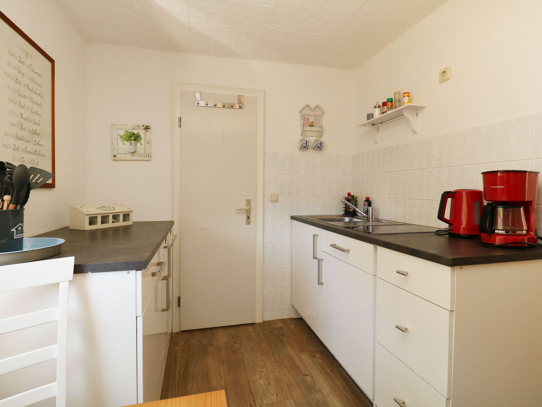 wie ein Cerankochfeld, ein Kühlschrank und einer kompletten Küchenausstattung. Dazu gehören auch Kaffeemaschine, Wasserkocher und Toaster.
