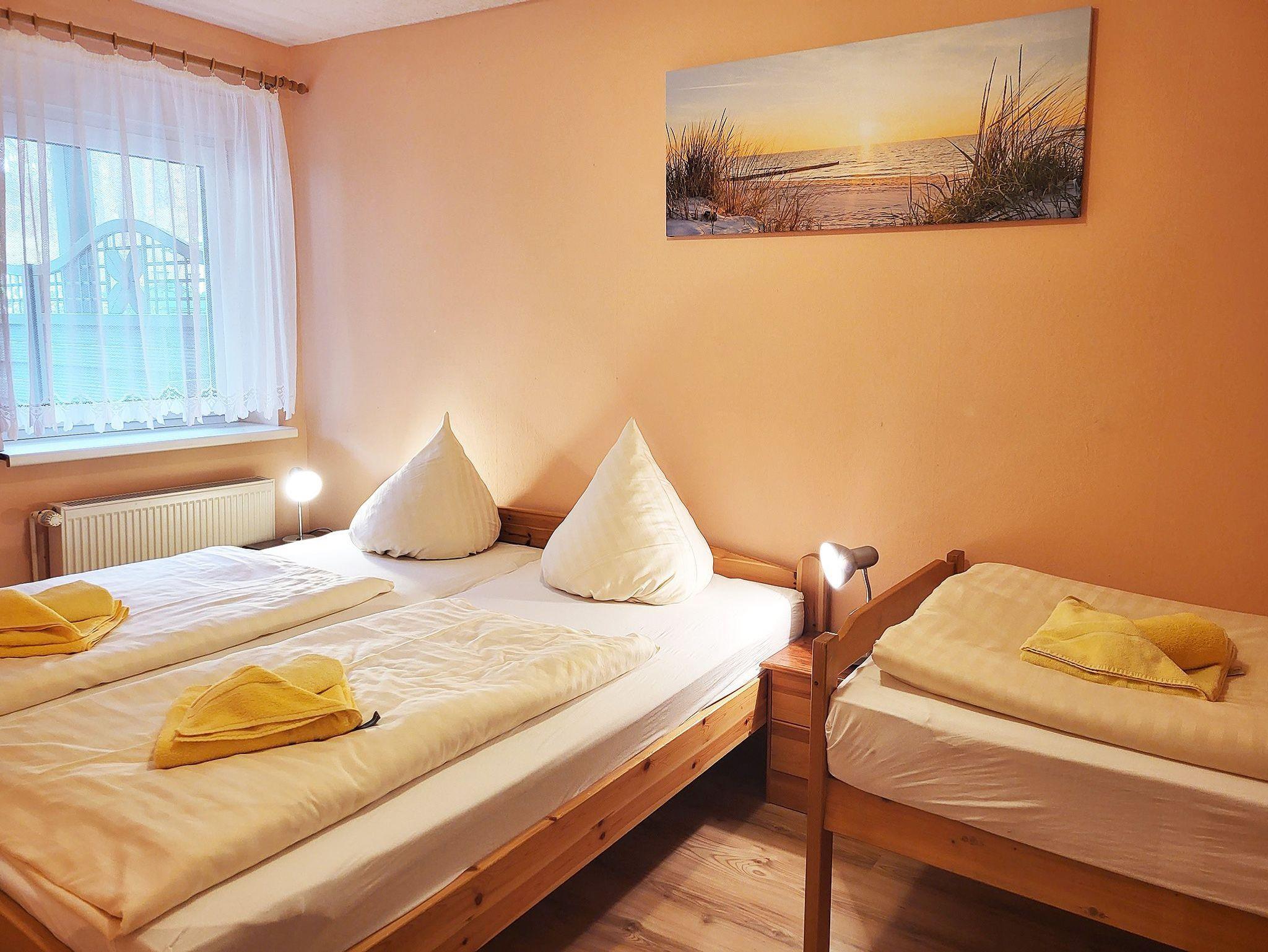 1 Schlafzimmer mit Doppelbett und Einzelbett.