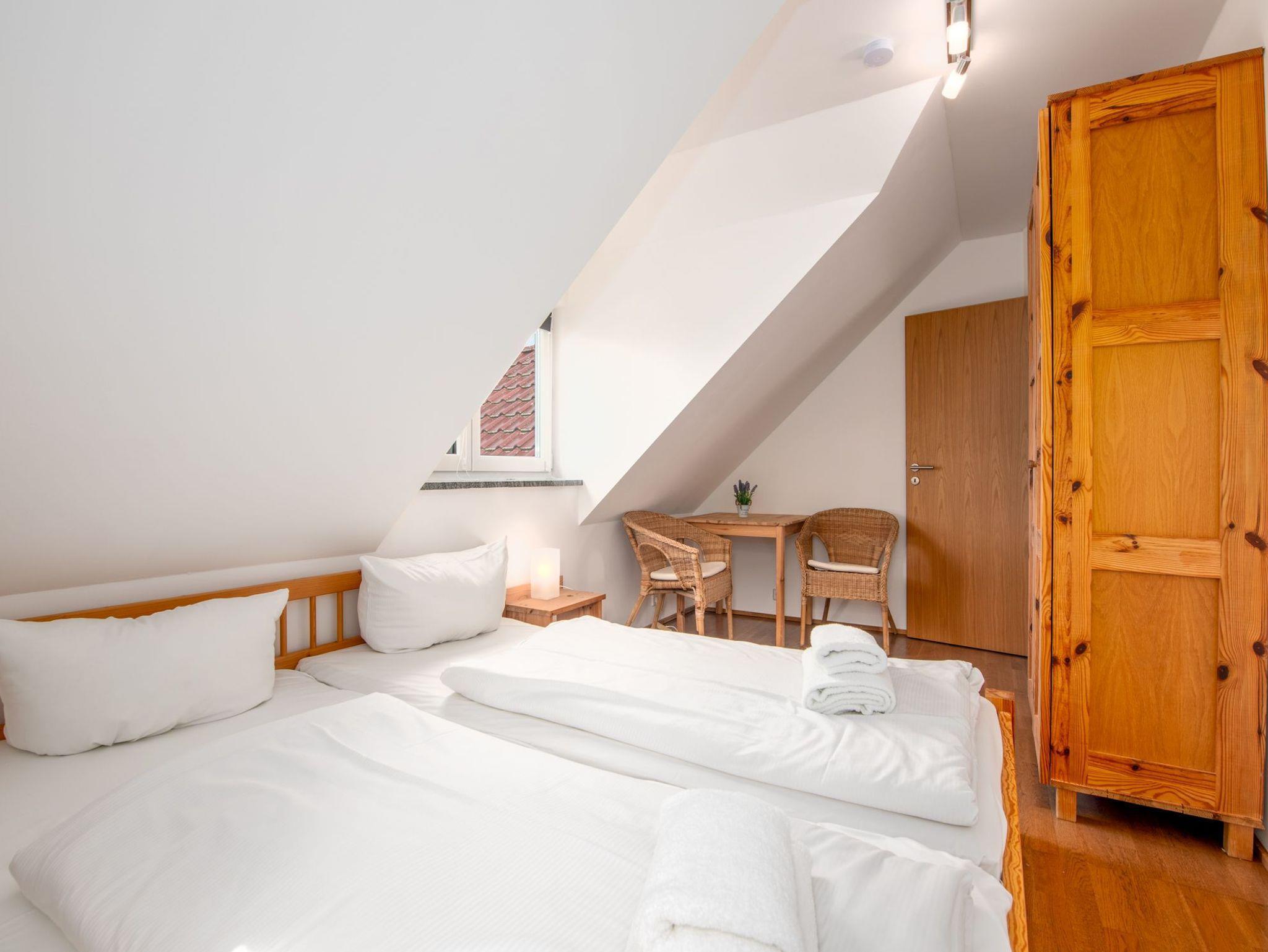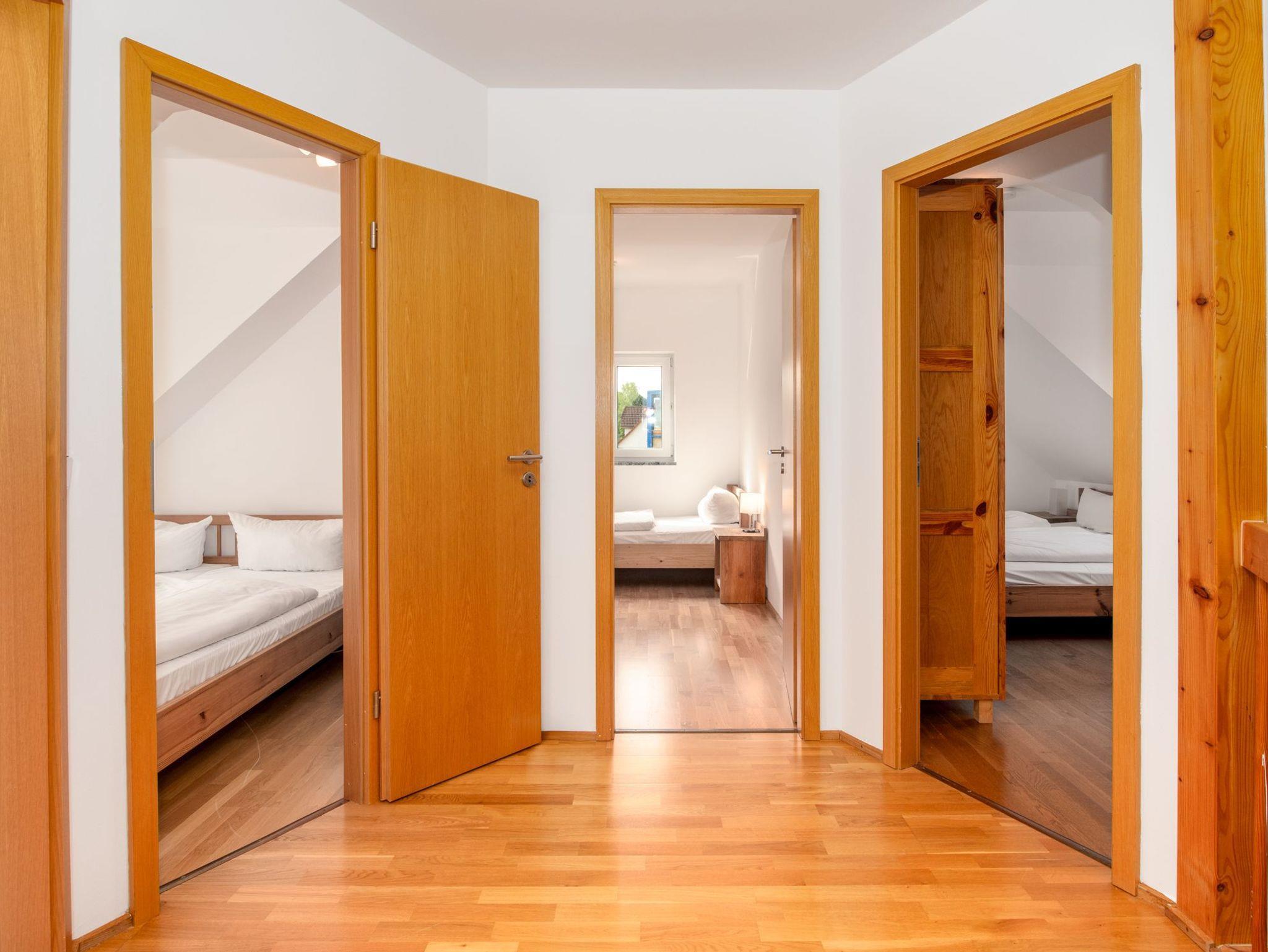 Es stehen Ihnen drei separate Schlafzimmer mit Echtholzmöbeln sowie ein zweites Badezimmer im Dachgeschoss zur Verfügung.