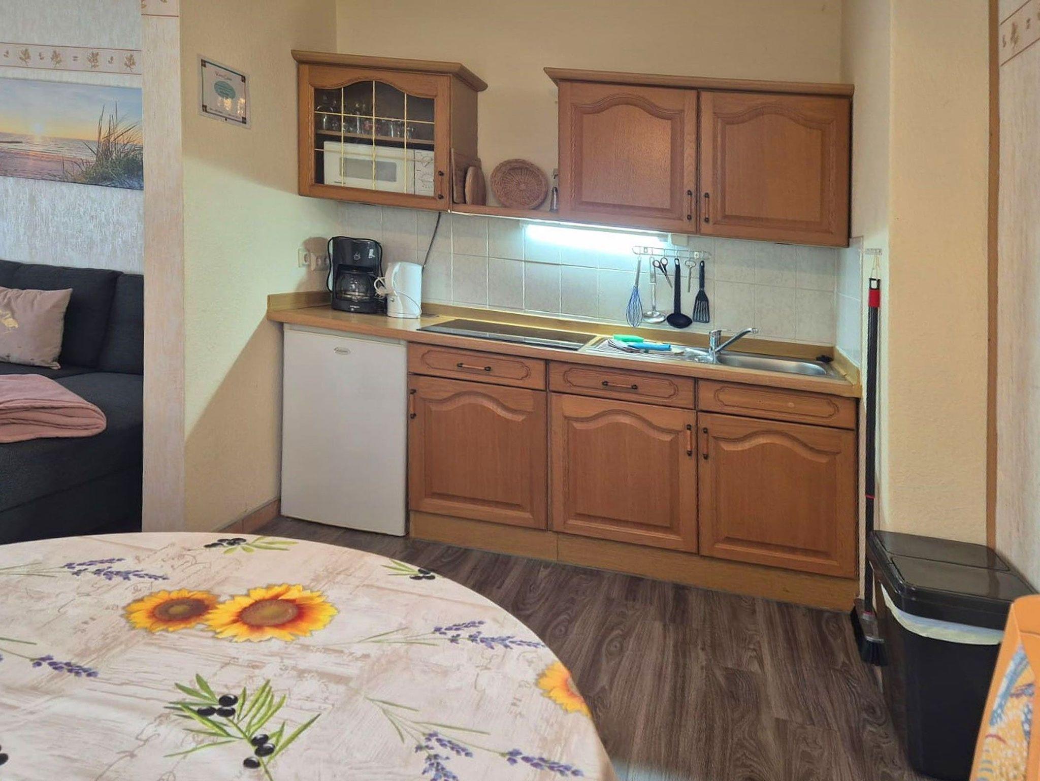 Küchenzeile mit 4 Plattenherd, Mikrowelle, Kühlschrank, Kaffeemaschine, Toaster, Eßtisch