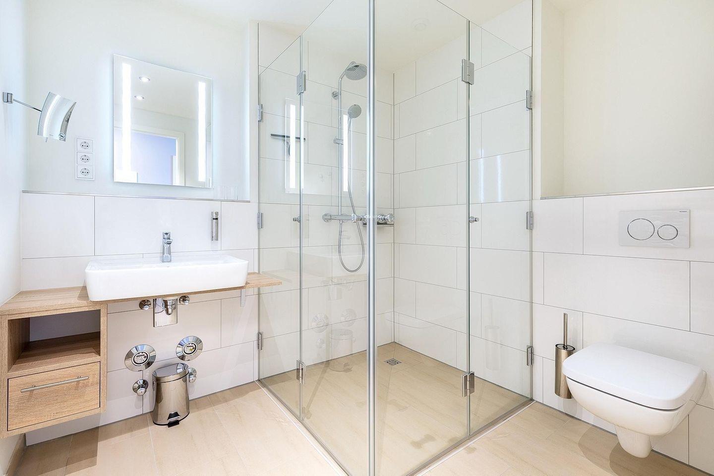 Das stilvoll gestaltete Badezimmer ist mit einer ebenerdigen Dusche, WC, einem Waschtisch mit Föhn, Kosmetikspiegel, Handtuchheizkörper und Fußbodenheizung ausgestattet – funktional, hochwertig und komfortabel. Und auch Hunde sind in diesem Apartment herzlich willkommen.