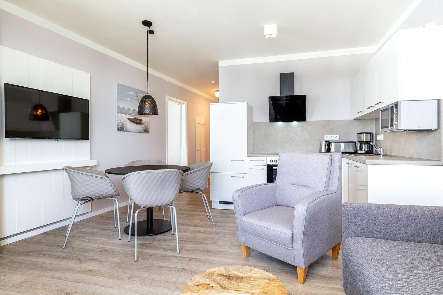 Das Godewindpark Travemünde Apartment 3.03 bietet Ihnen modernen Komfort auf 52 m² im 3. Stock nahe dem Sandstrand. Die Unterkunft verfügt über ein Schlafzimmer, einen offenen Wohn- und Essbereich mit voll ausgestatteter Küche, bodengleiche Dusche, Balkon mit Gartenmöbeln, WLAN, zwei TVs sowie Zugang zur Sauna und Dampfbad. Haustiere sind willkommen. Ein Privatparkplatz und eine Ladestation für Elektroautos stehen bereit.