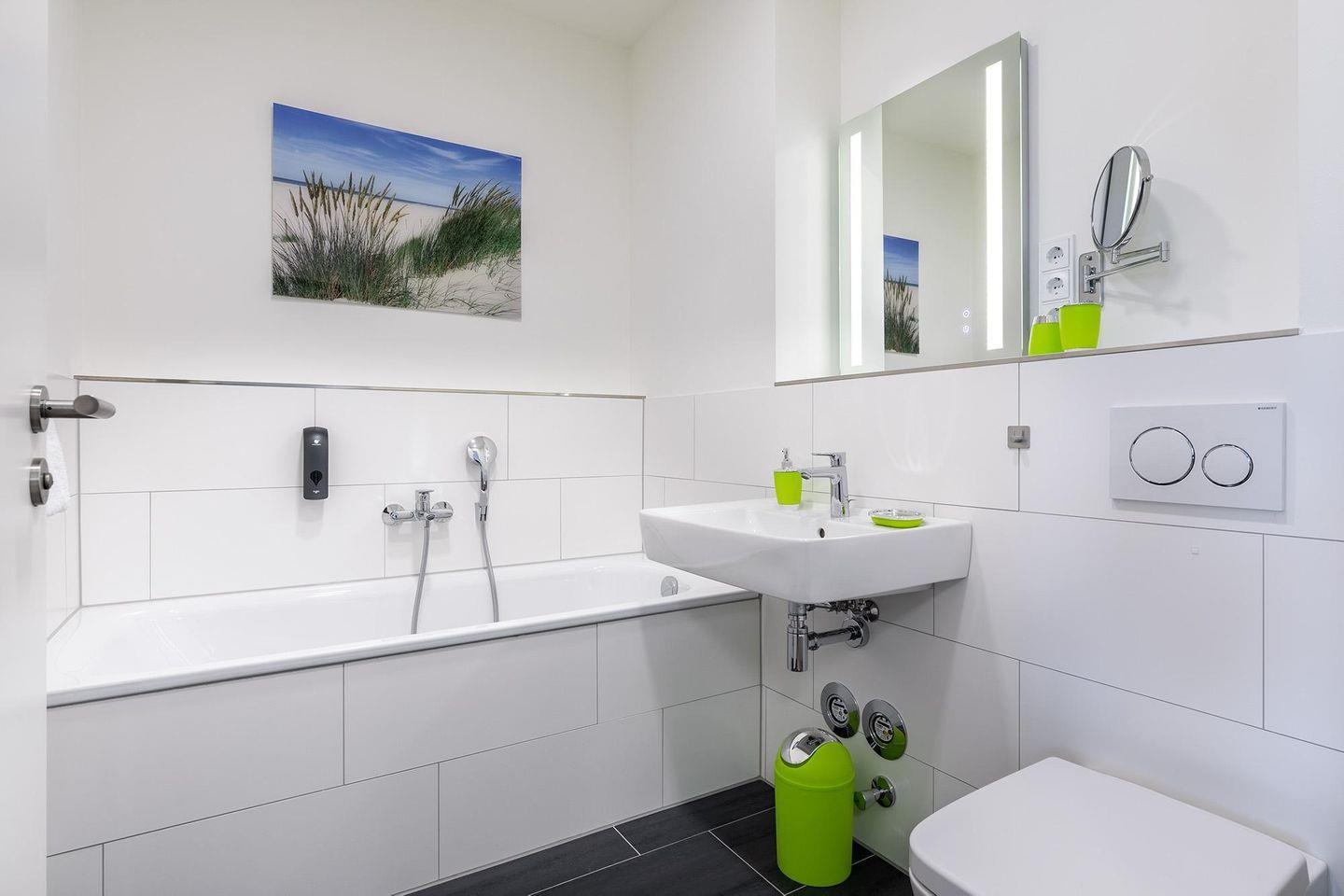 Zur Ausstattung der Ferienanlage gehören außerdem eine Rezeption mit Lobby und Kamin-Lounge, eine Tiefgarage mit inkludiertem Stellplatz (max. Höhe 2 m) sowie gemeinschaftlich nutzbare Waschräume auf jeder Etage. Zwei Aufzüge sorgen für barrierefreien Zugang zu allen Apartments. Fahrräder lassen sich sicher im abschließbaren Kellerraum unterbringen, und vor dem Haus steht eine öffentliche Ladestation für E-Autos zur Verfügung, die gegen Gebühr genutzt werden kann.