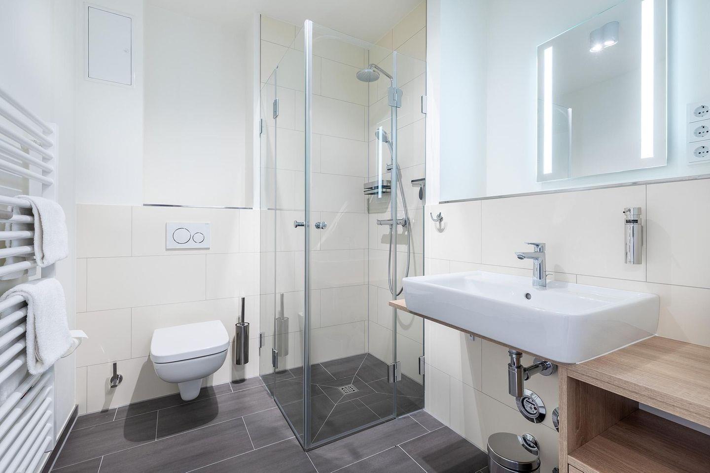Ein besonderes Highlight ist die großzügige Wellnesslandschaft: Finnische Sauna, Biosauna, Dampfbad, Fußbäder, Erlebnisduschen, Eisbrunnen sowie Ruhezonen mit Kamin laden zum Entspannen ein. Während der Öffnungszeiten steht Ihnen der Spa-Bereich kostenfrei zur Verfügung. Wer keinen Bademantel dabei hat, kann sich diesen ebenso wie Saunatücher bequem gegen eine geringe Gebühr leihen. Ein Aufzug verbindet den Wellnessbereich mit allen Etagen, sodass Sie bequem zu Ihrer Wohnung gelangen können.
