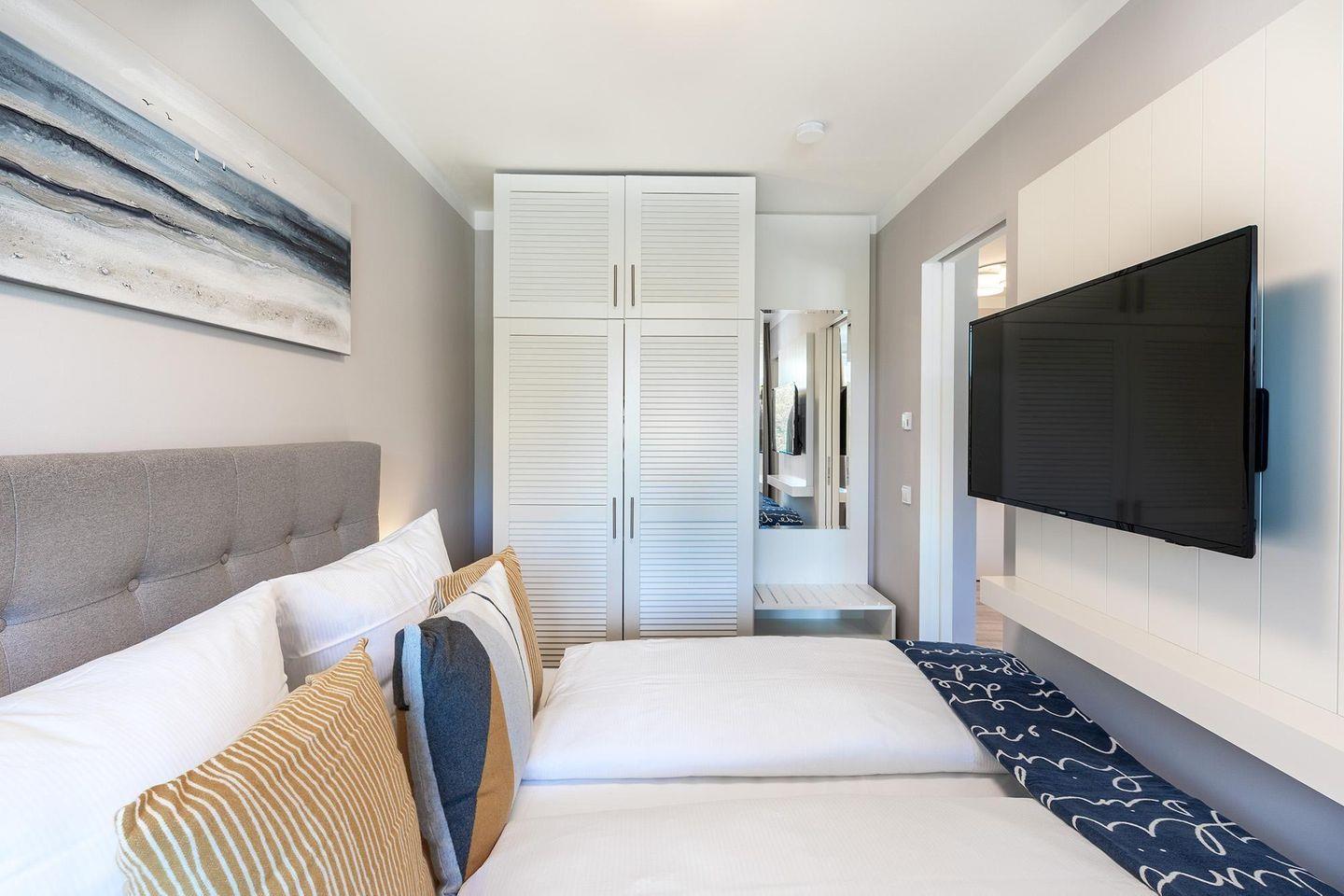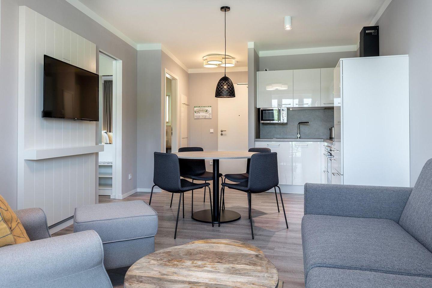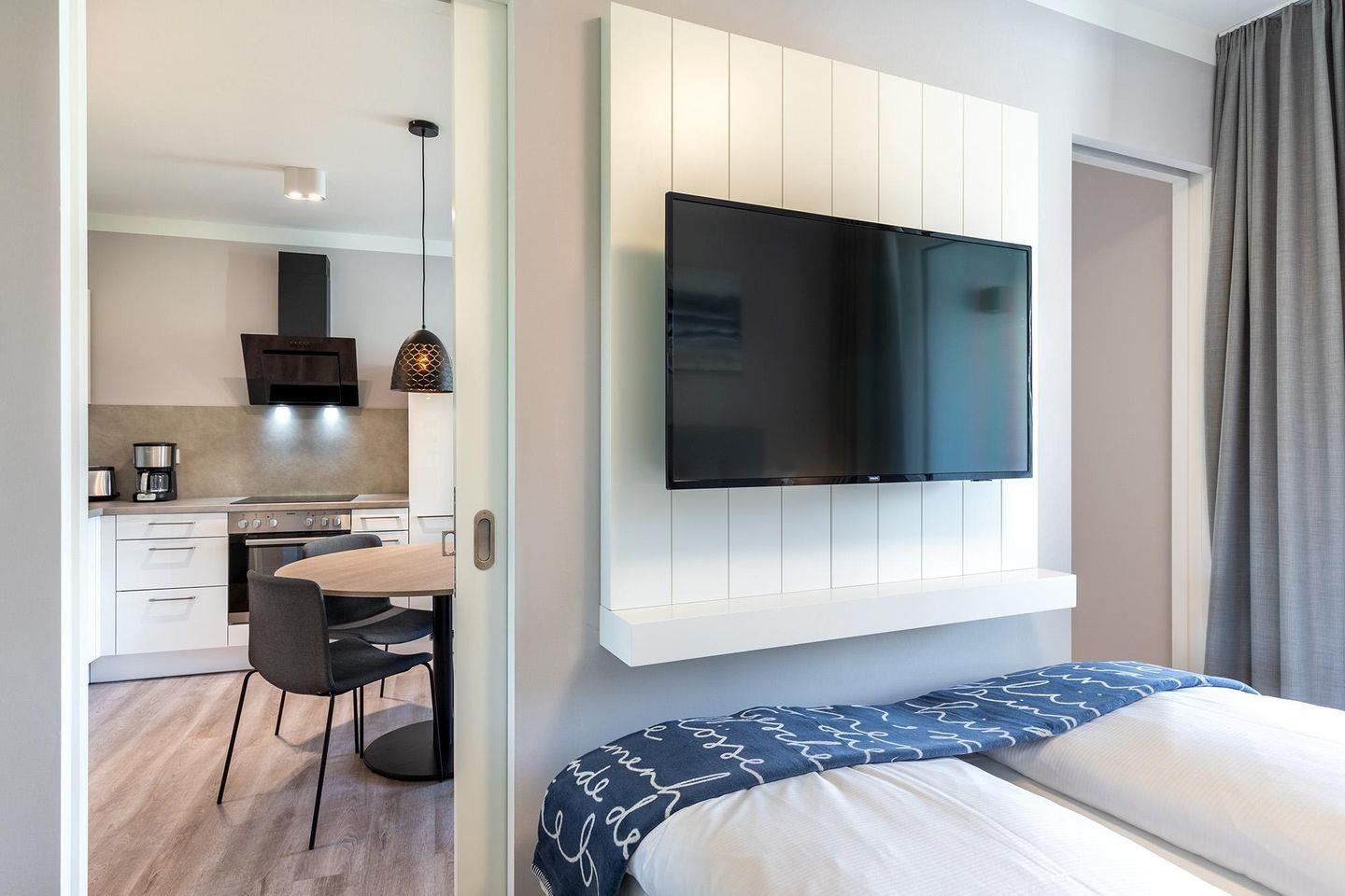 Das lichtdurchflutete Apartment besticht durch eine offene, voll ausgestattete Küche mit Geschirrspüler, Kaffeemaschine, Mikrowelle, Herd und Backofen sowie einen Wohnbereich mit Doppelschlafcouch und SMART-TV. Der Schlafbereich mit Boxspringbett ist durch Schiebetüren abtrennbar und verfügt ebenfalls über einen TV. Das moderne Bad ist mit ebenerdiger Dusche, Fußbodenheizung, Handtuchheizkörper und Föhn ausgestattet. WLAN ist inklusive, das Apartment ist ein Nichtraucherapartment und Haustiere sind nicht erlaubt.