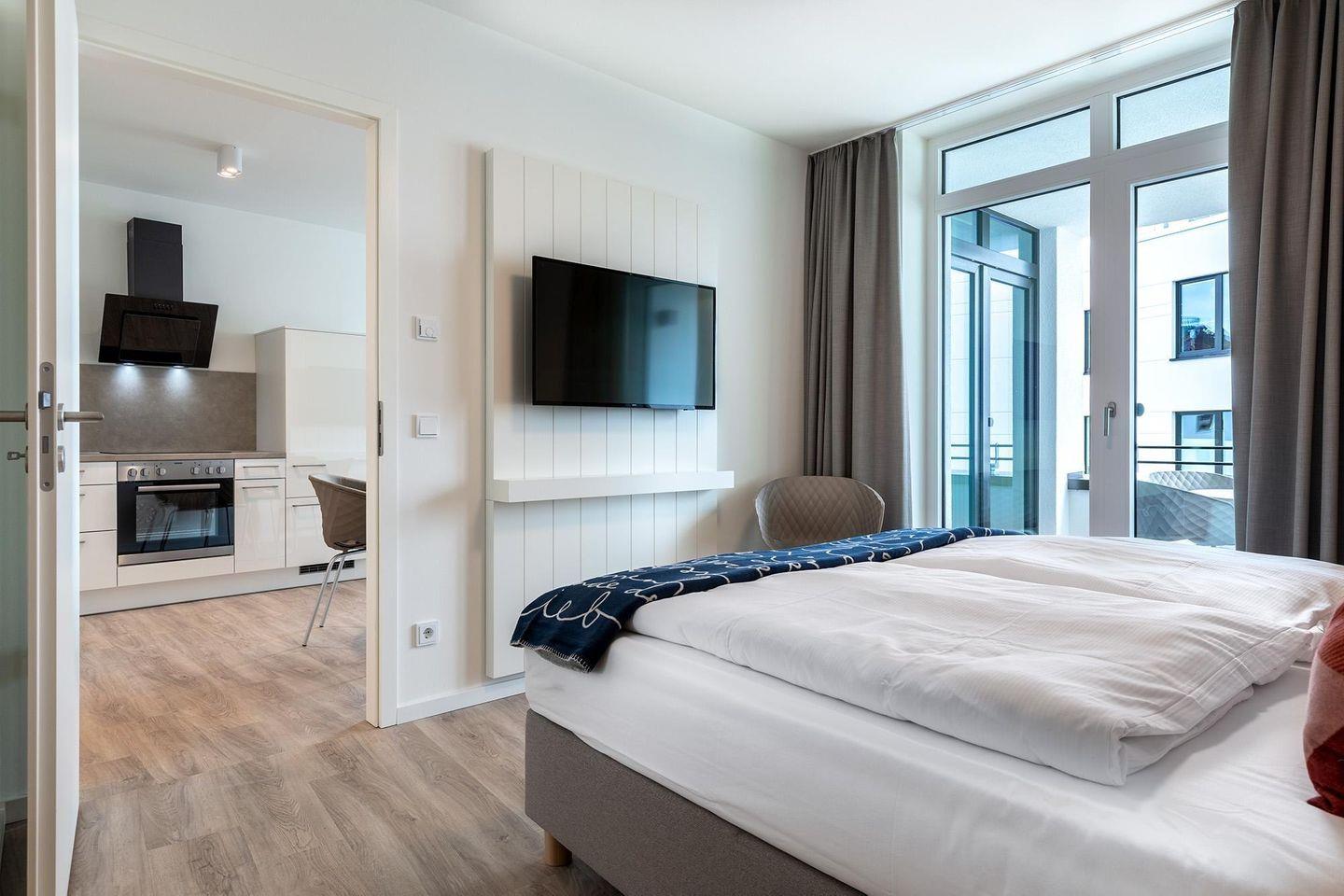 Im Inneren erwartet Sie ein helles, modern eingerichtetes Nichtraucher-Apartment, das mit durchdachtem Komfort punktet: Fußbodenheizung, bodentiefe, sonnenschutzverglaste Fenster und kostenfreies WLAN sorgen für ein angenehmes Wohngefühl zu jeder Jahreszeit.