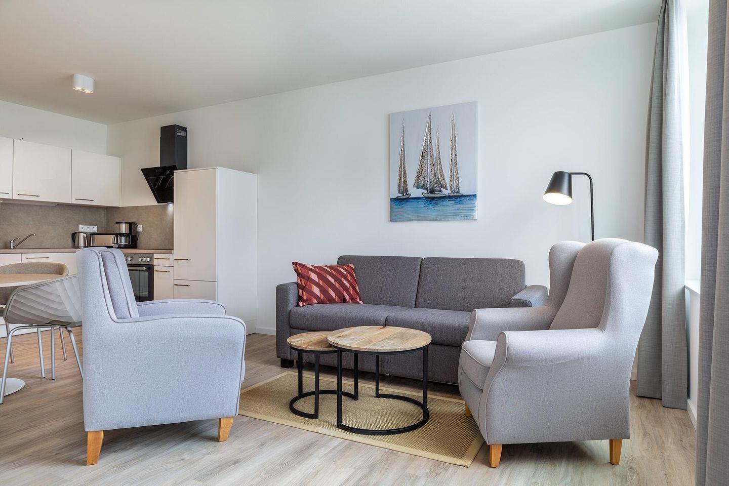 Verbringen Sie unvergessliche Urlaubstage in diesem stilvollen 2-Zimmer-Apartment, das mit ca. 48 m² Wohnfläche Platz für bis zu vier Personen bietet. Die hochwertige Ausstattung, die sonnige Süd-West-Lage und die Nähe zur Ostsee machen diese Unterkunft zu einem idealen Rückzugsort für alle, die Entspannung, Komfort und Natur verbinden möchten.