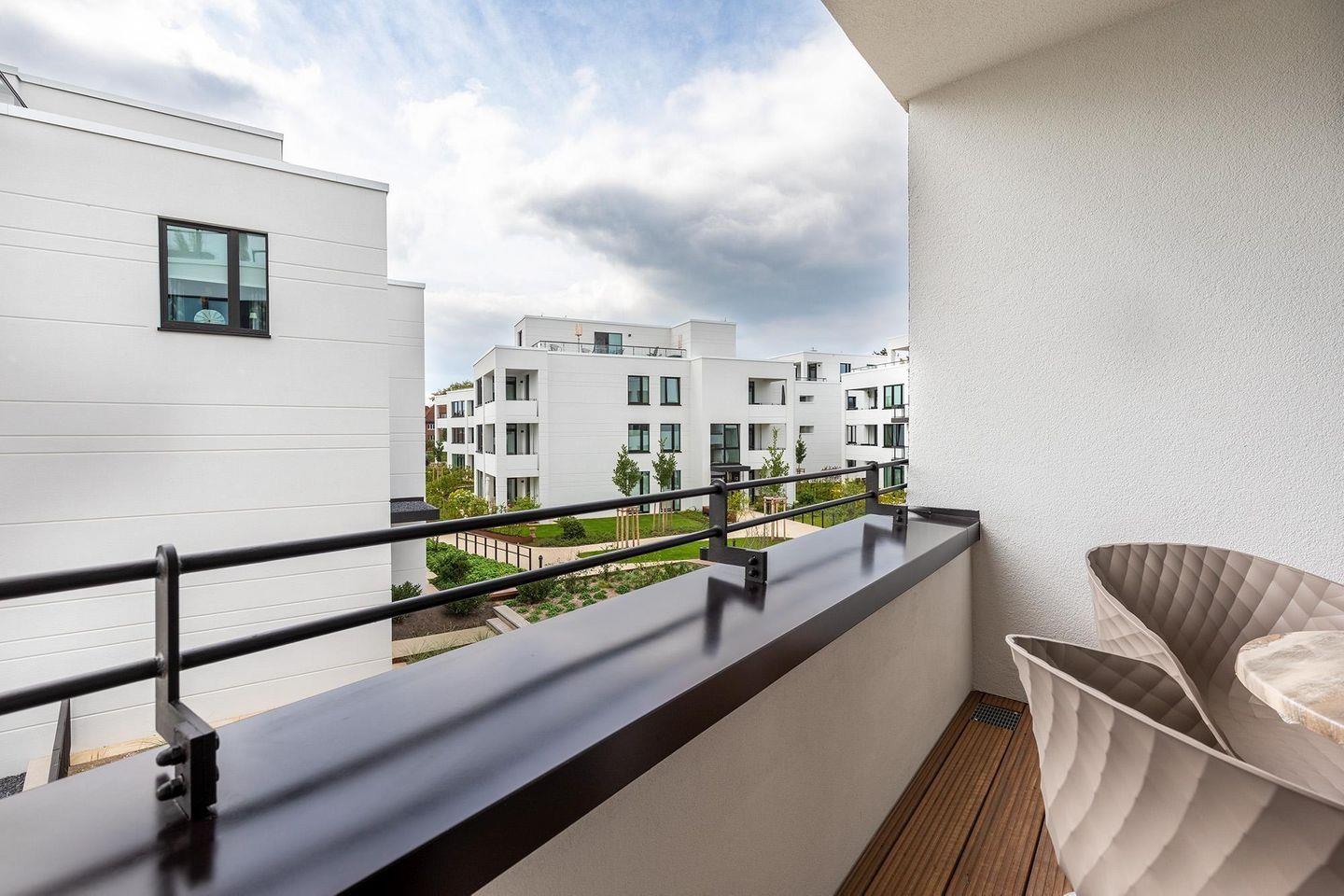 Ein besonderes Highlight ist die überdachte Loggia in sonnenreicher Süd-West-Ausrichtung, die sowohl vom Wohnbereich als auch vom Schlafzimmer aus zugänglich ist. Genießen Sie hier das milde Meeresklima, lassen Sie sich von der Sonne verwöhnen – und das bis in die Abendstunden. Die bequemen Gartenmöbel laden zum Lesen, Essen oder einfach nur zum Durchatmen ein.