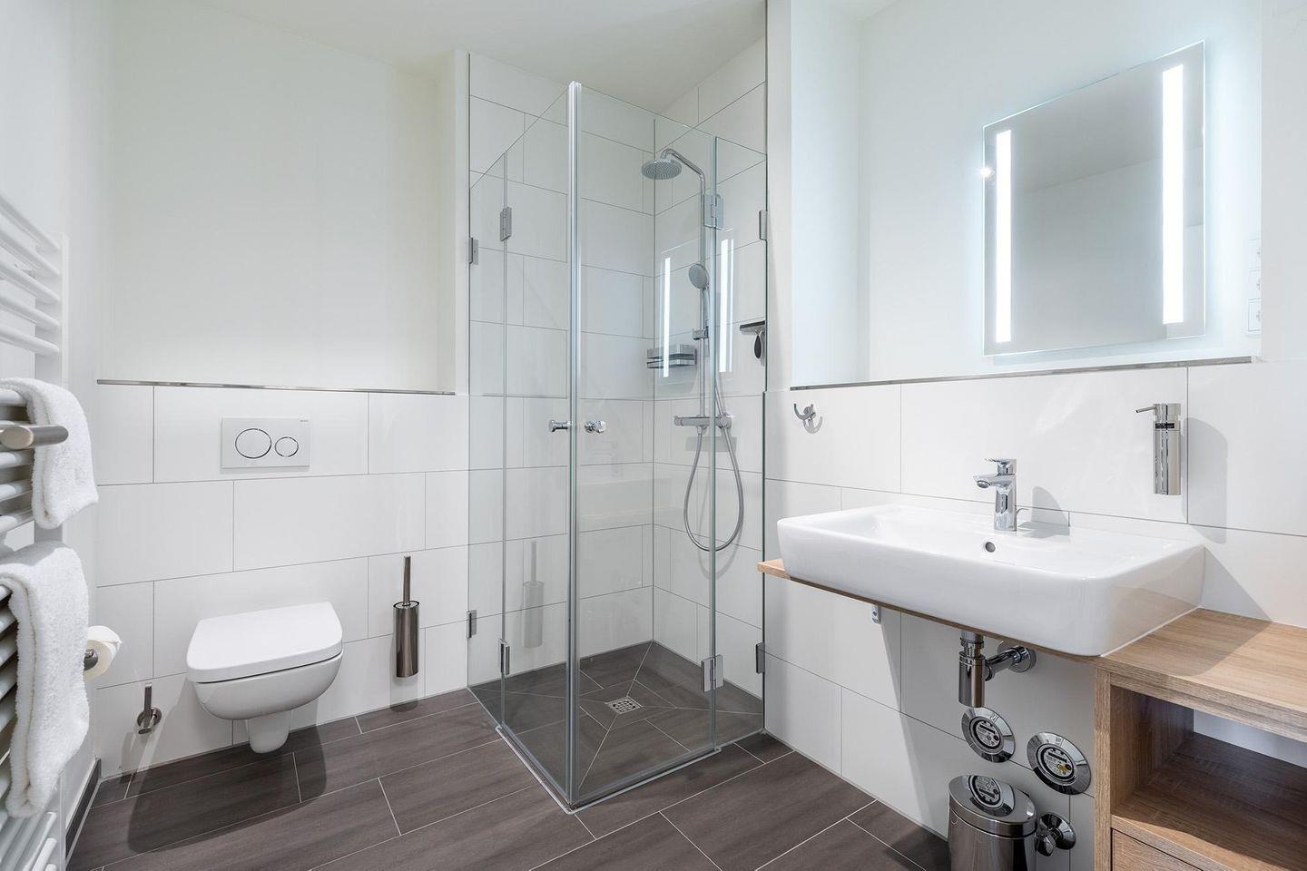 Das Badezimmer überzeugt mit einer bodengleichen Dusche.