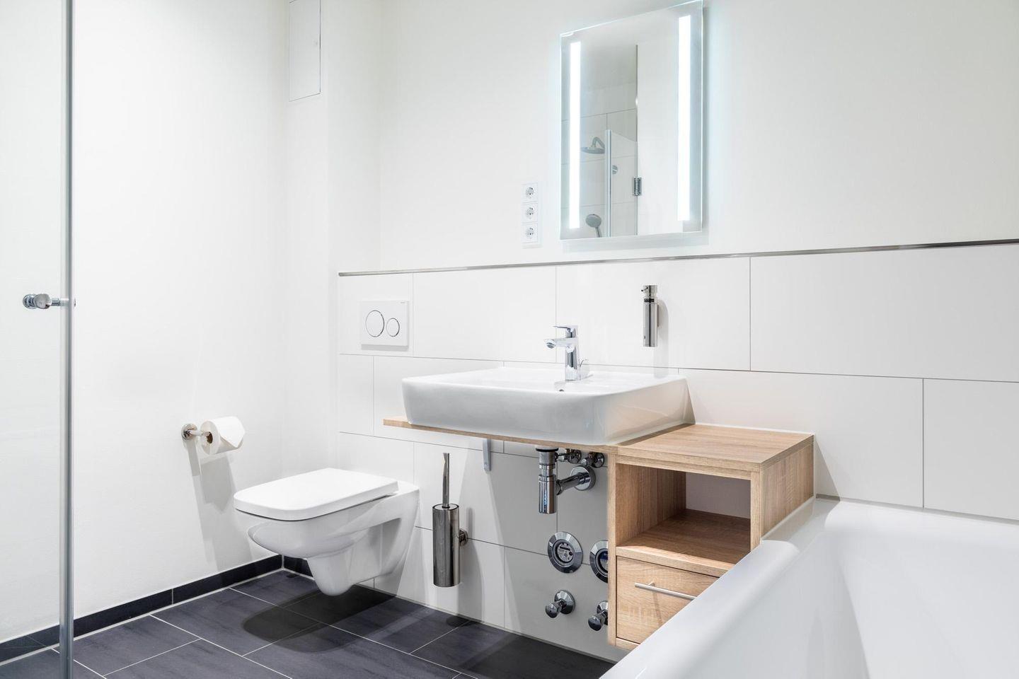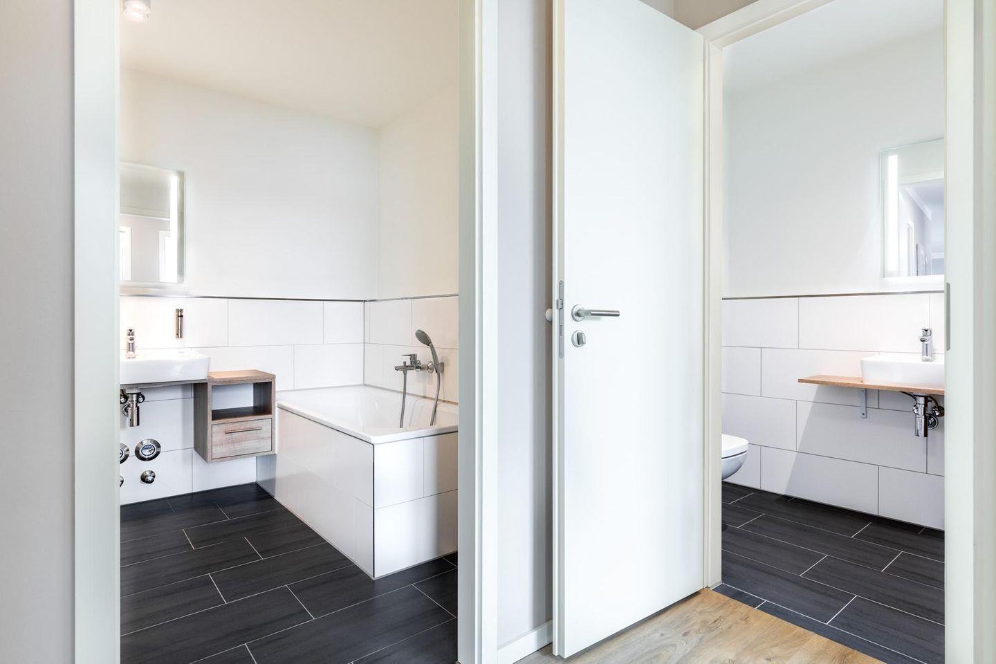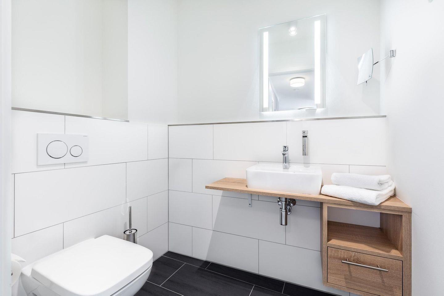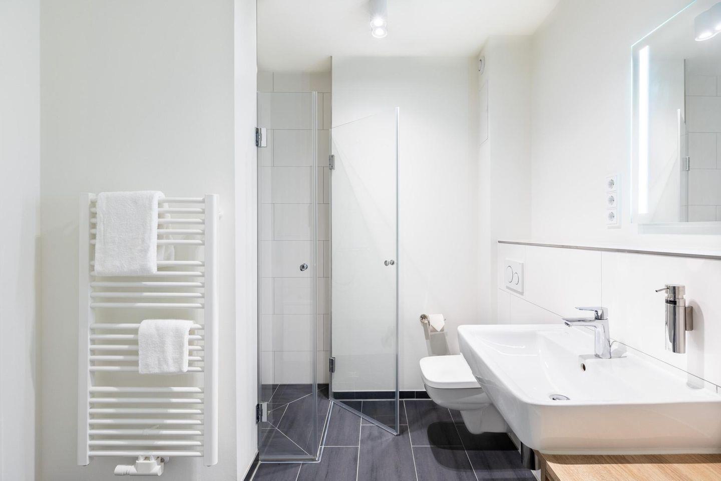 Das Badezimmer ist mit einer bodengleichen Dusche, WC, Waschbecken, Kosmetikspiegel und Haartrockner modern ausgestattet und sorgt für einen komfortablen Start in den Tag.