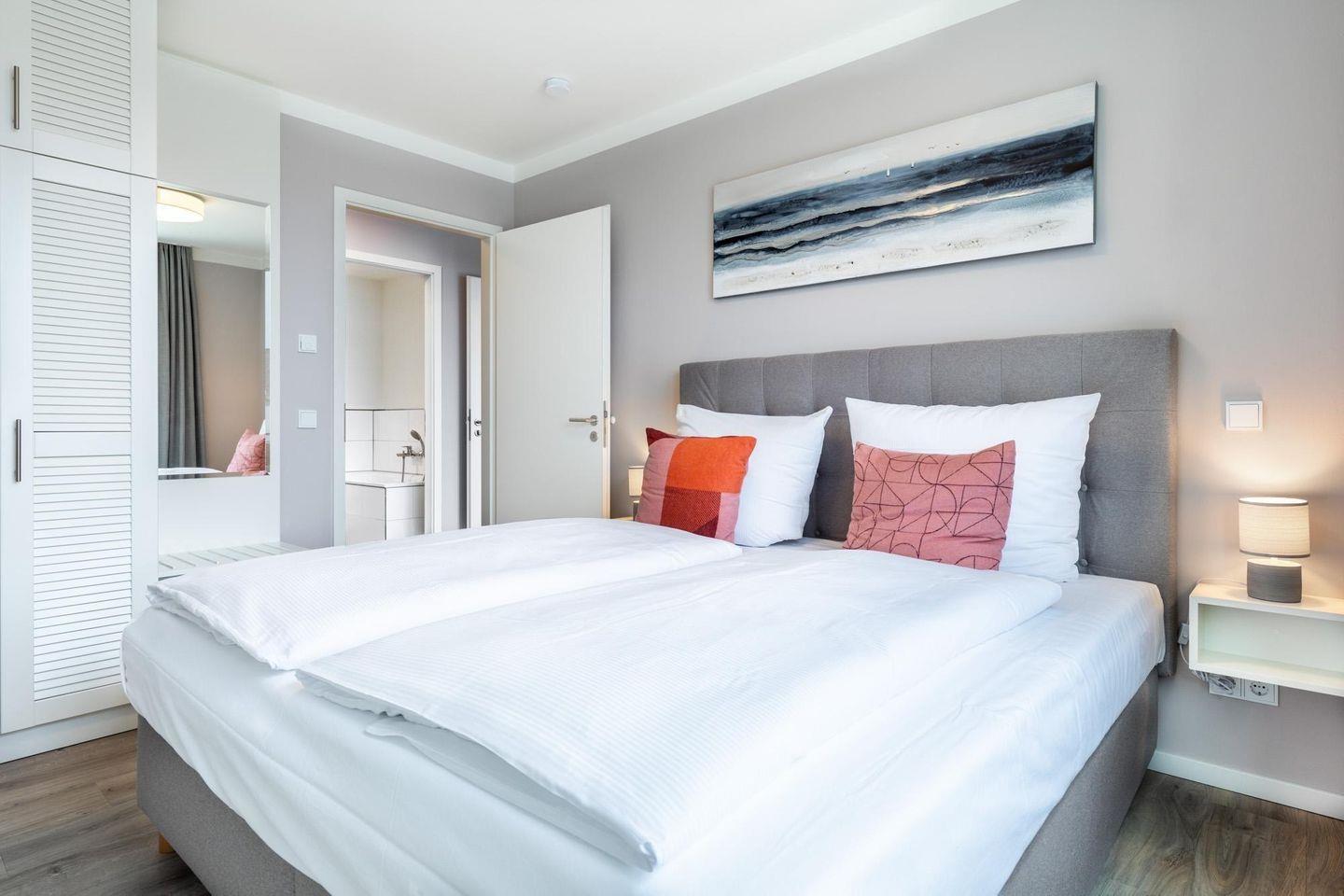 Zur Ausstattung der Ferienanlage gehören außerdem eine Rezeption mit Lobby und Kamin-Lounge, eine Tiefgarage mit inkludiertem Stellplatz (max. Höhe 2 m) sowie gemeinschaftlich nutzbare Waschräume auf jeder Etage. Zwei Aufzüge sorgen für barrierefreien Zugang zu allen Apartments. Fahrräder lassen sich sicher im abschließbaren Kellerraum unterbringen, und vor dem Haus steht eine öffentliche Ladestation für E-Autos zur Verfügung, die gegen Gebühr genutzt werden kann.