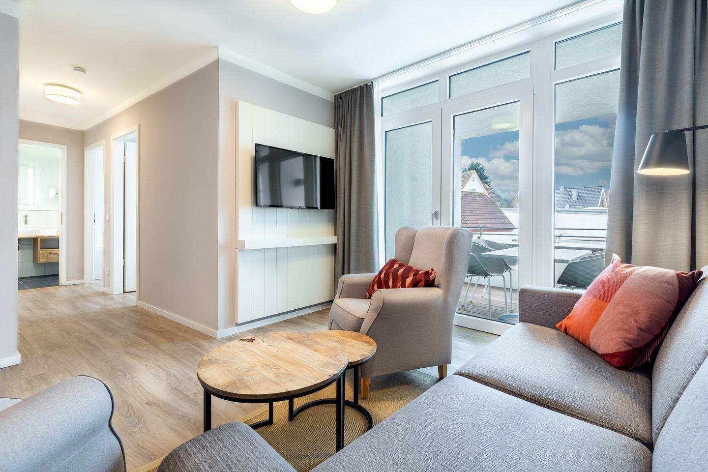 Im Apartment stehen zwei Zimmer zur Verfügung: ein gemütliches Schlafzimmer für erholsame Nächte sowie ein moderner Wohnbereich mit offen gestalteter Küche. Insgesamt finden bis zu fünf Personen dank komfortabler Schlafmöglichkeiten Platz. Der Wohnbereich ist mit einem großen TV und kostenfreiem WLAN ausgestattet und bietet somit beste Voraussetzungen für gesellige Abende oder entspannte Stunden nach einem Tag an der Ostsee. Eine zusätzliche Besonderheit ist der überdachte Balkon, der mit Gartenmöbeln zum Verweilen einlädt und einen angenehmen Ausblick ins Grüne gewährt.