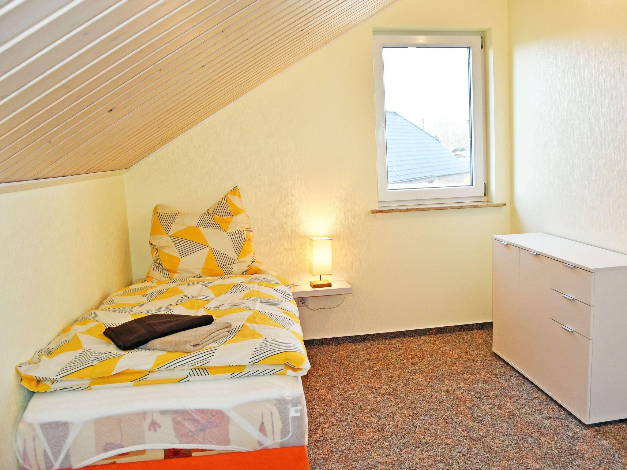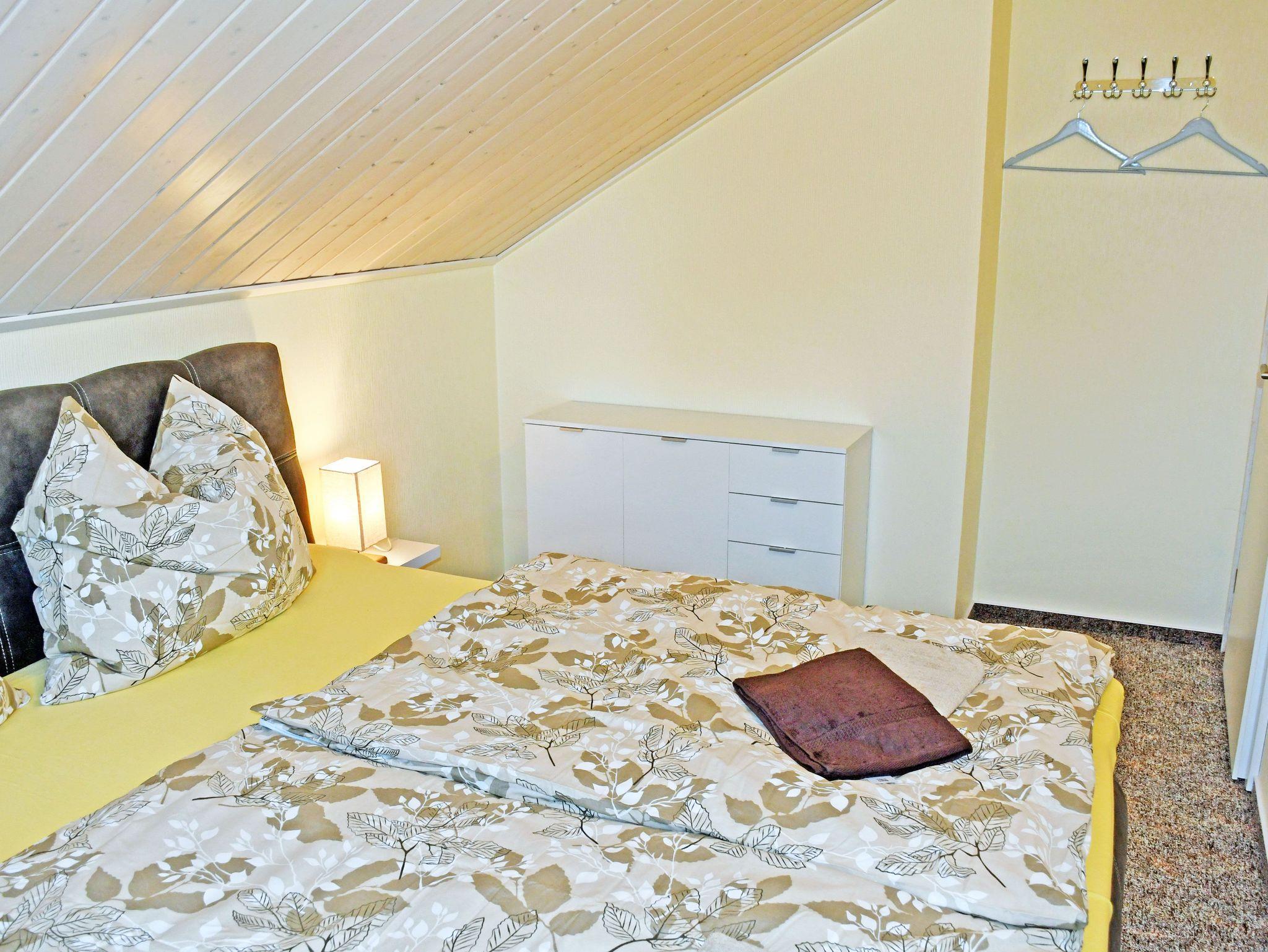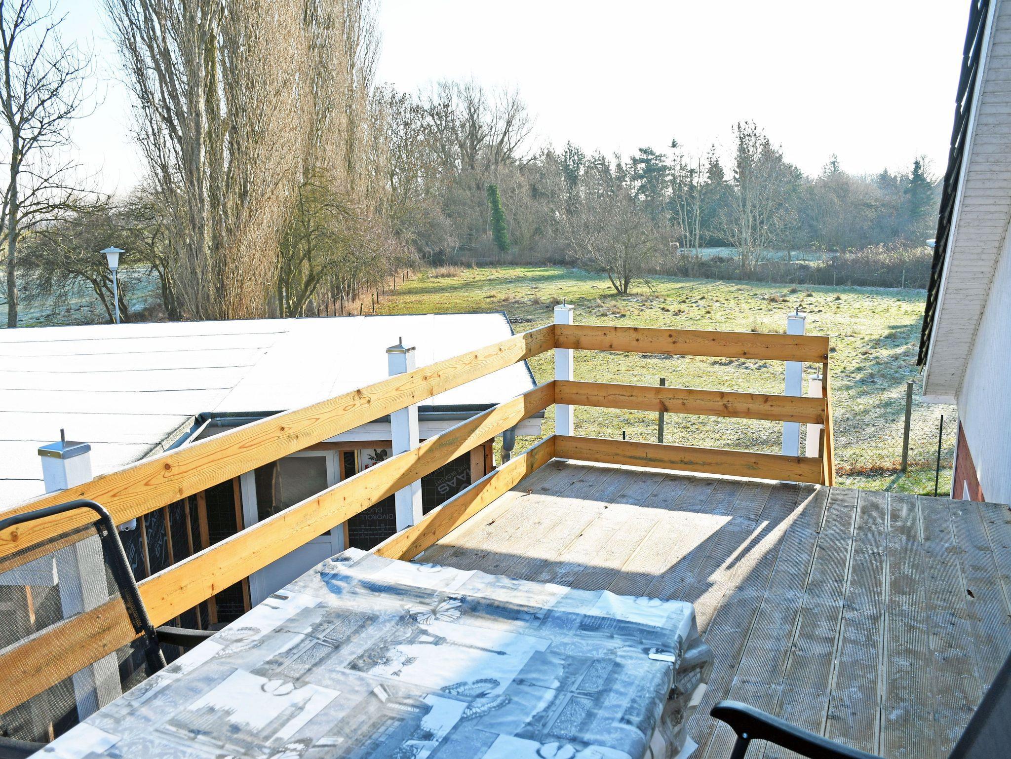 Die Ferienwohnung (60 qm, max. 5 Erwachsene und 1 Kind bis 3 Jahre im Kinderreisebett, Wohnzimmer mit Küchenzeile, 3 Schlafzimmer, Bad/Dusche, Terrasse, WLAN) befindet sich im Obergeschoss eines Wohnhaus. Sie ist über eine Außentreppe erreichbar. Zur Ferienwohnung gehört auch eine schöne Balkonterrasse mit Gartenmöbeln und Grillmöglichkeit.