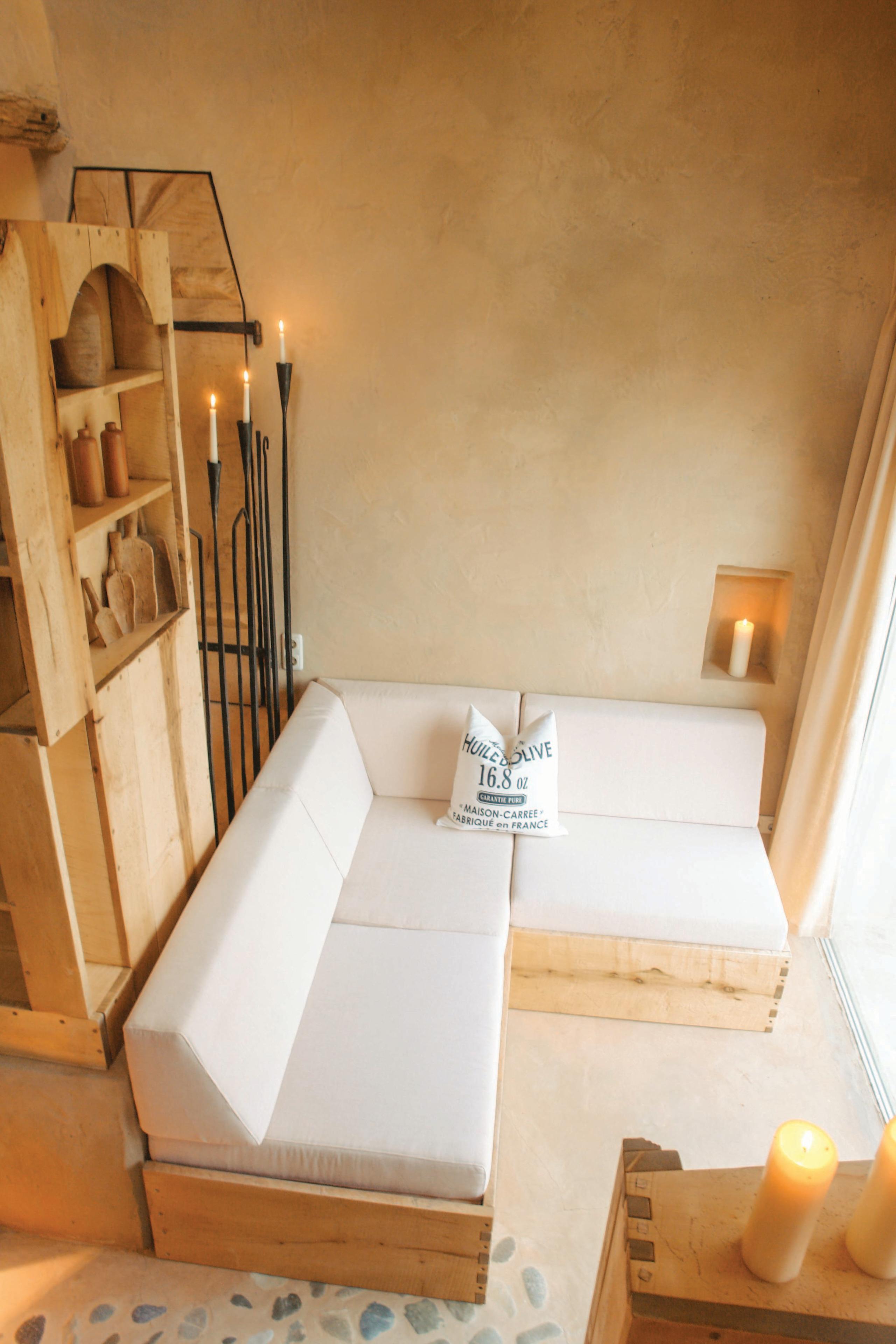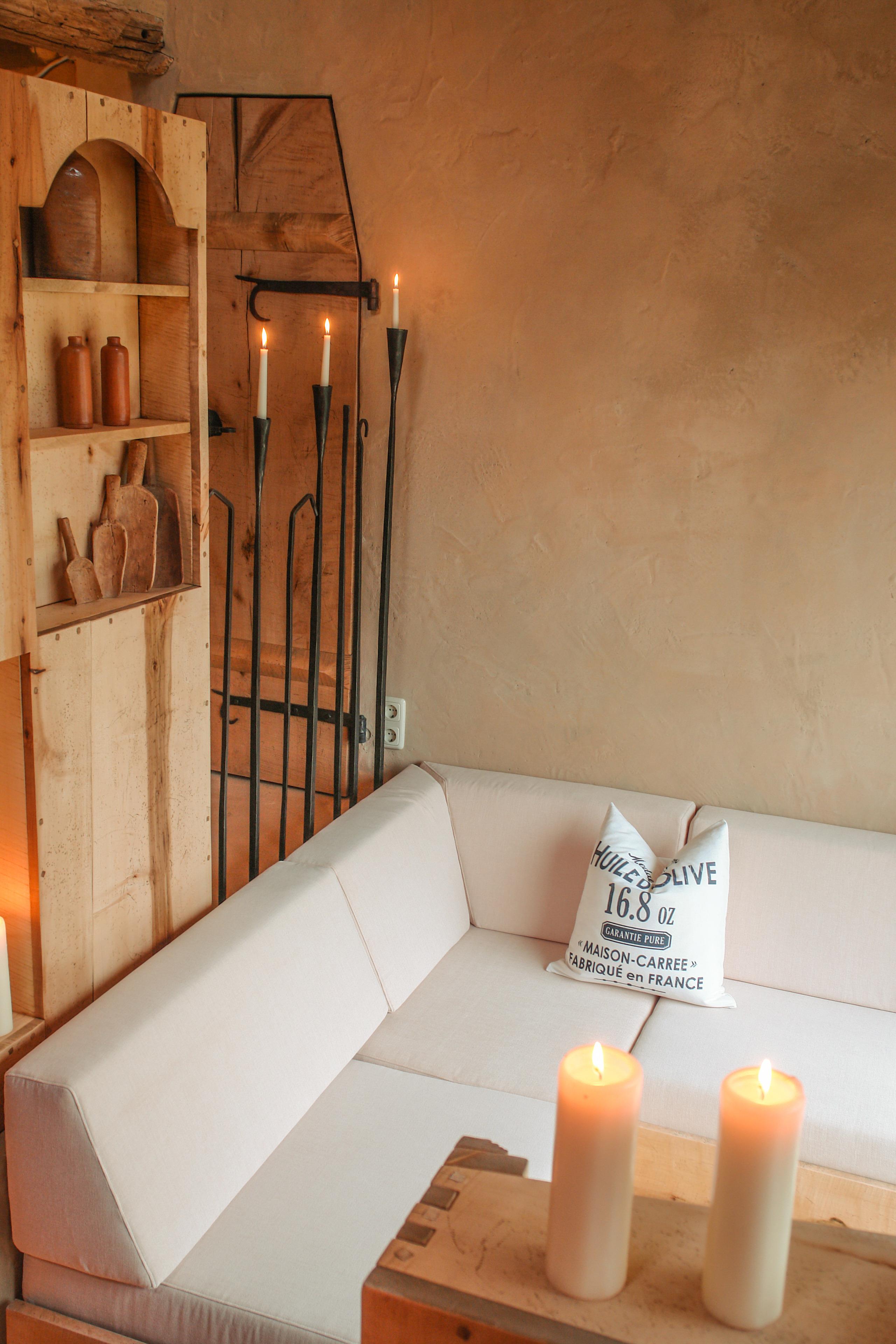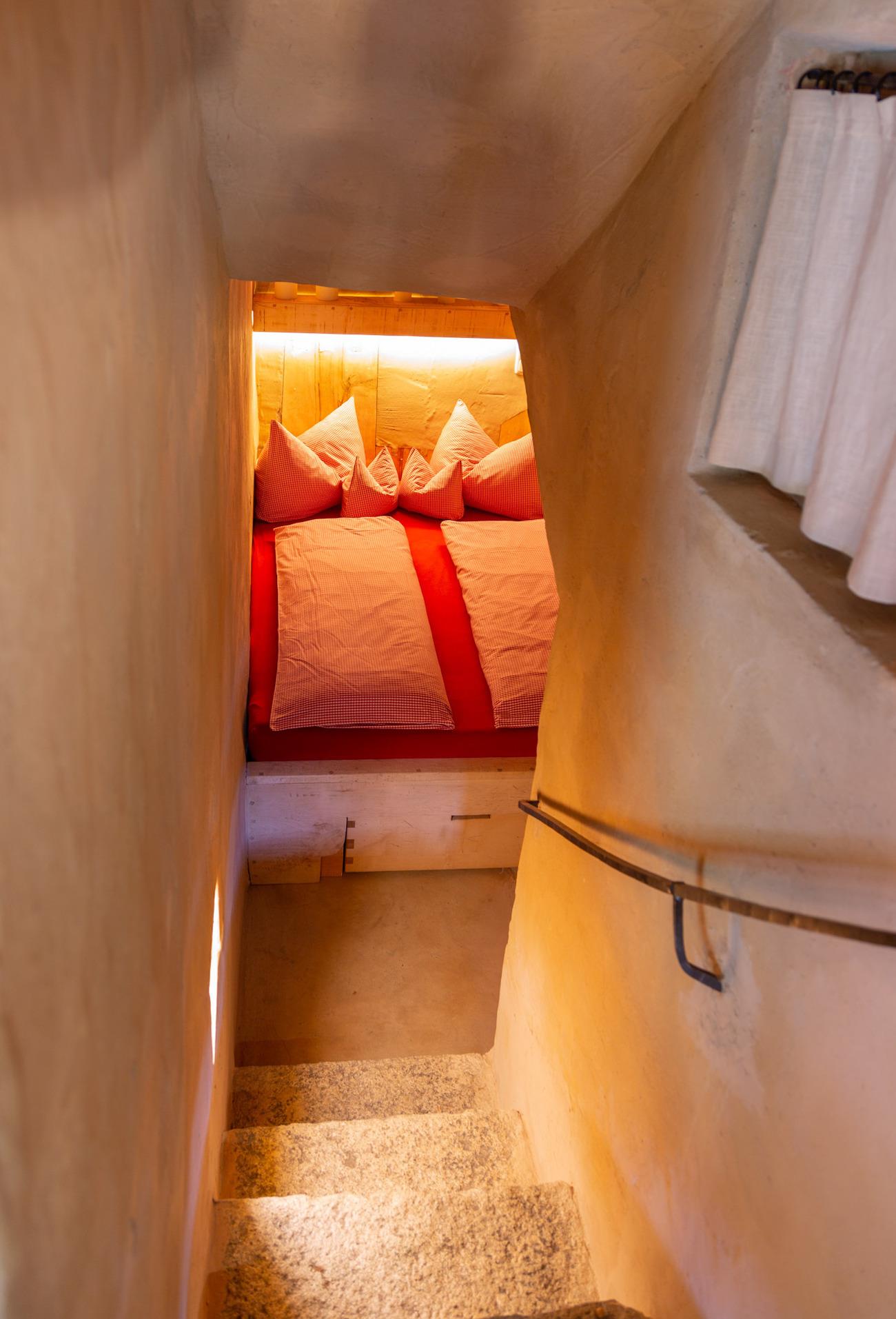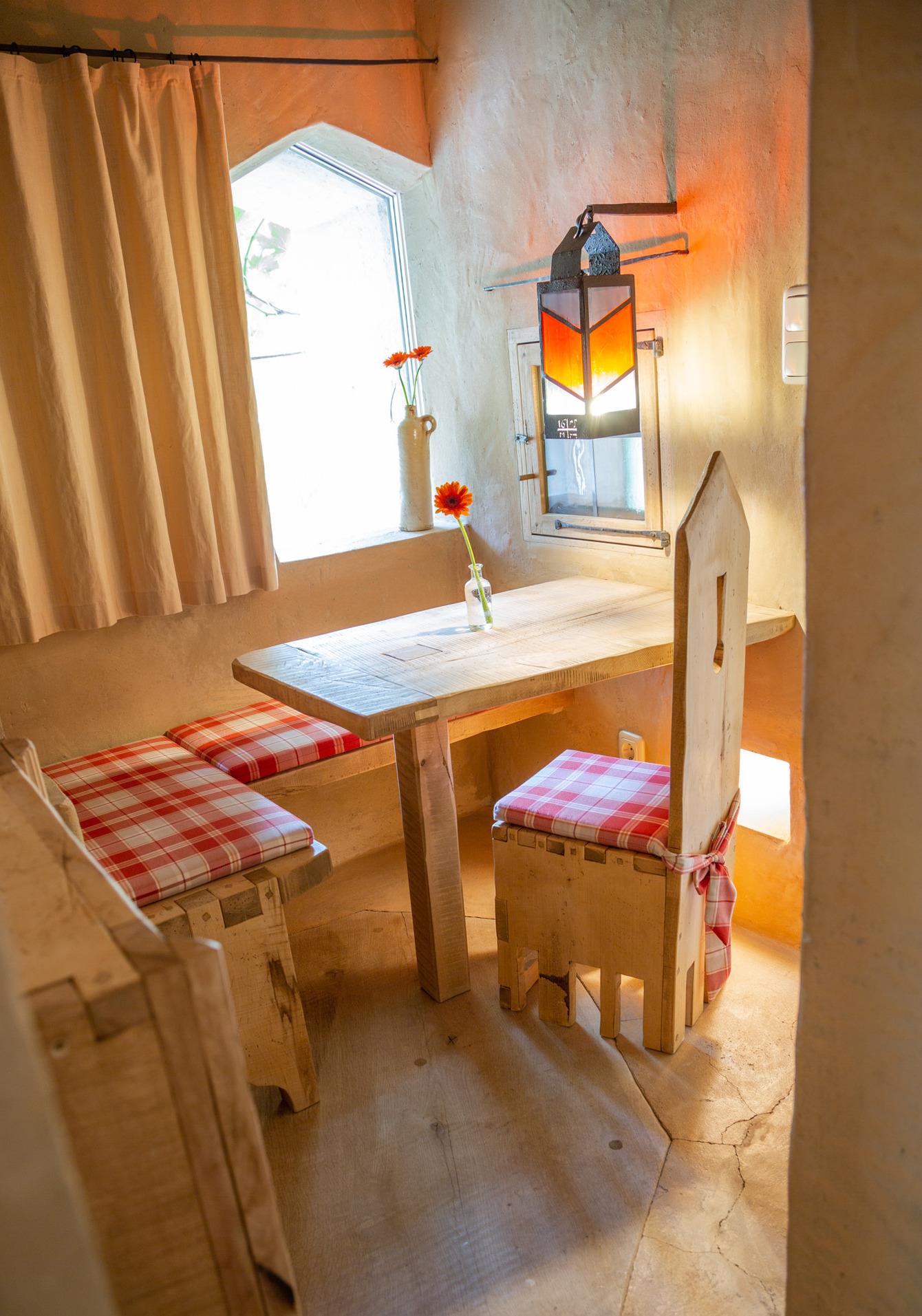 In einer Gewölbekuppel befindet sich auf zwei Ebenen das Reich der kleinen Gäste. Mit Sitzecke, Buffet und Kachelofen im kindgerechten Maßstab, Geheimgang und zwei Schlafhöhlen ist es ein spannender Raum zum Spielen und Schlafen.
