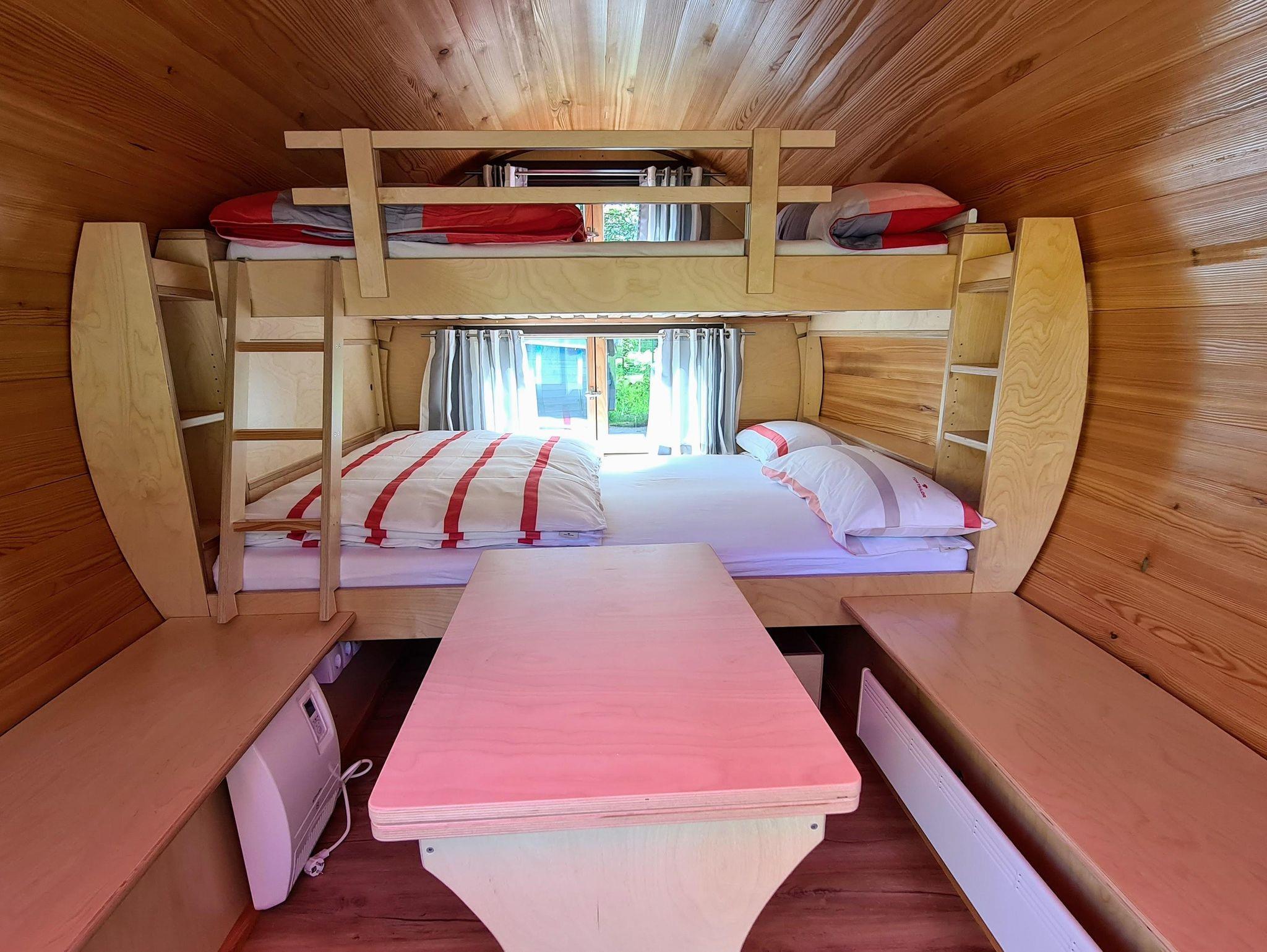 Die Schlaffässer sind mit je zwei Betten mit 1,40 x 2 m bzw. 1,20 x 2 m Liegefläche ausgestattet und bieten Platz für bis zu zwei Erwachsene und zwei Kinder.