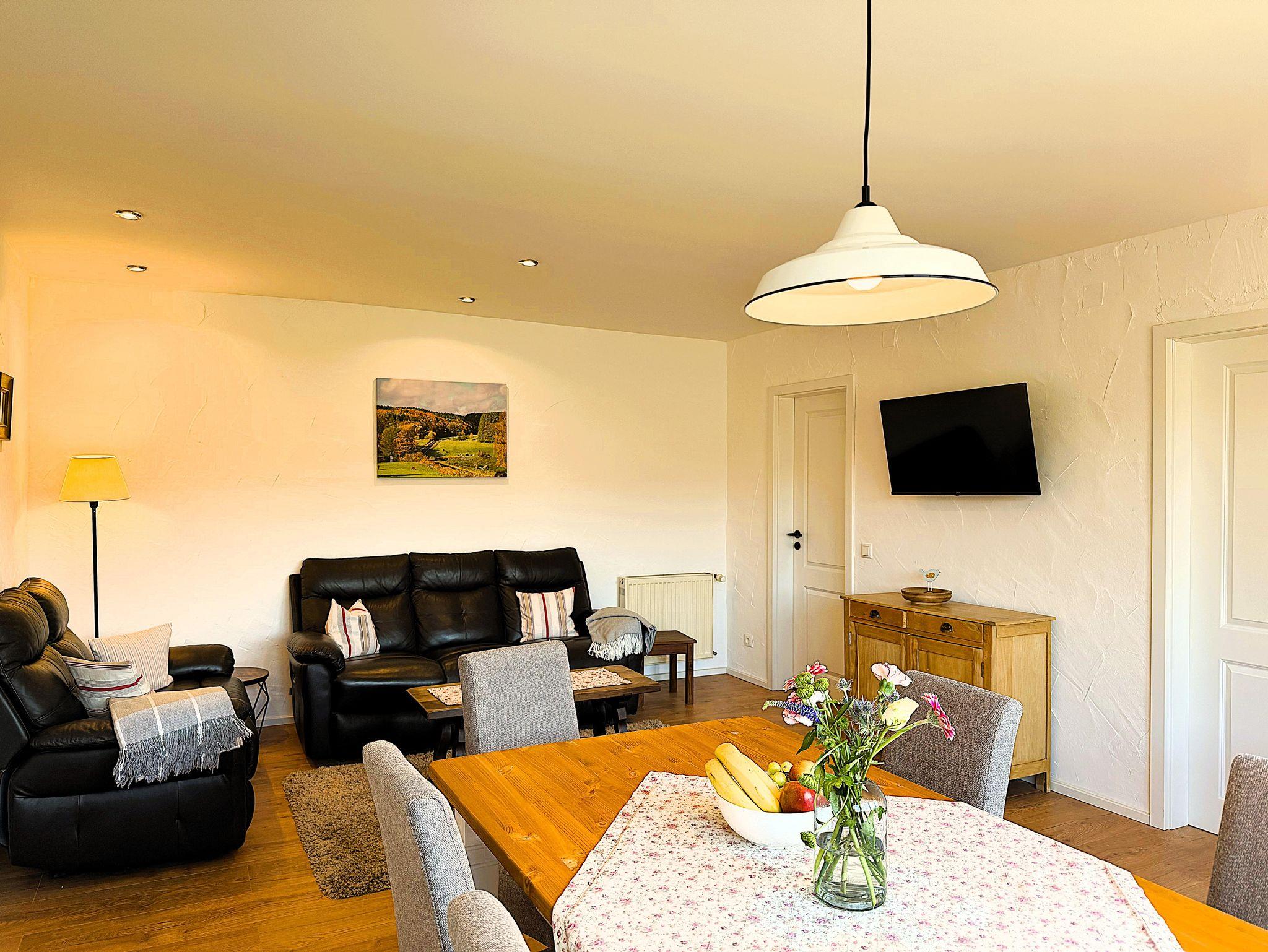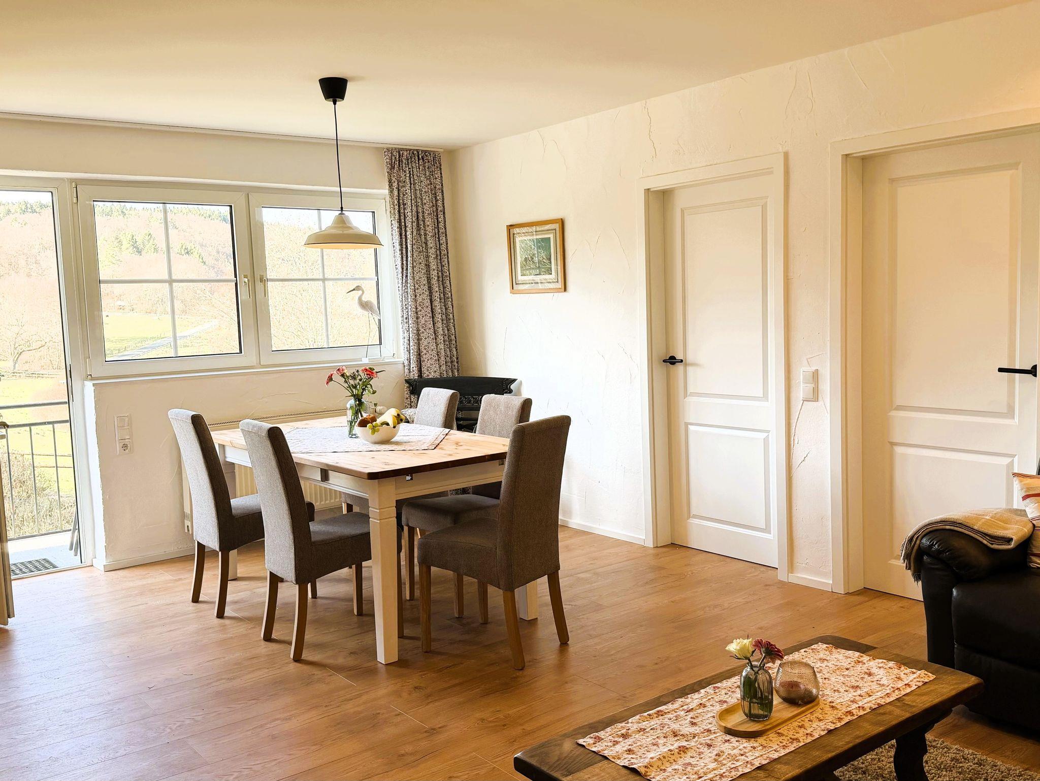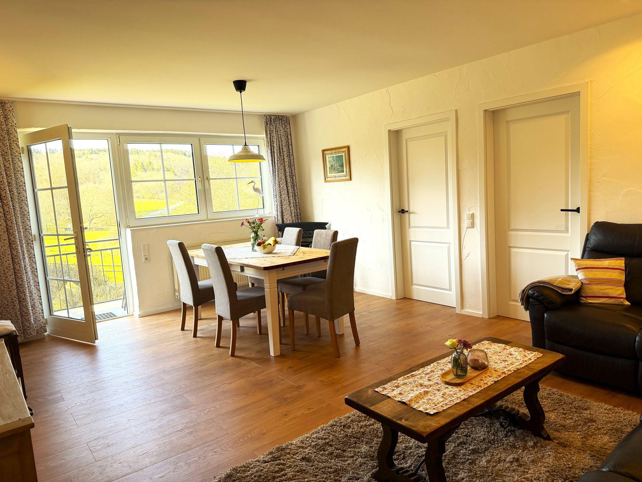 Wunderschöne Ferienwohnung mit einem tollen Blick in ein Wiesental und auf einen ehemaligen Vulkan. Die Ferienwohnung ist ca. 70 m² groß mit einem Schlafzimmer mit Doppelbett, einem 3-Bett-Zimmer (mit Etagenbett), einem Wohnzimmer mit Audio-System und Sat-TV, einer separaten und komplett ausgestatteten Küche und einem Badezimmer mit Dusche und WC. Babybett auf Nachfrage. Fahrräder können am Hofglände abgestellt werden. Auf dem Balkon kannst Du die Aussicht genießen und im Obstgarten auf der Liegewiese relaxen.