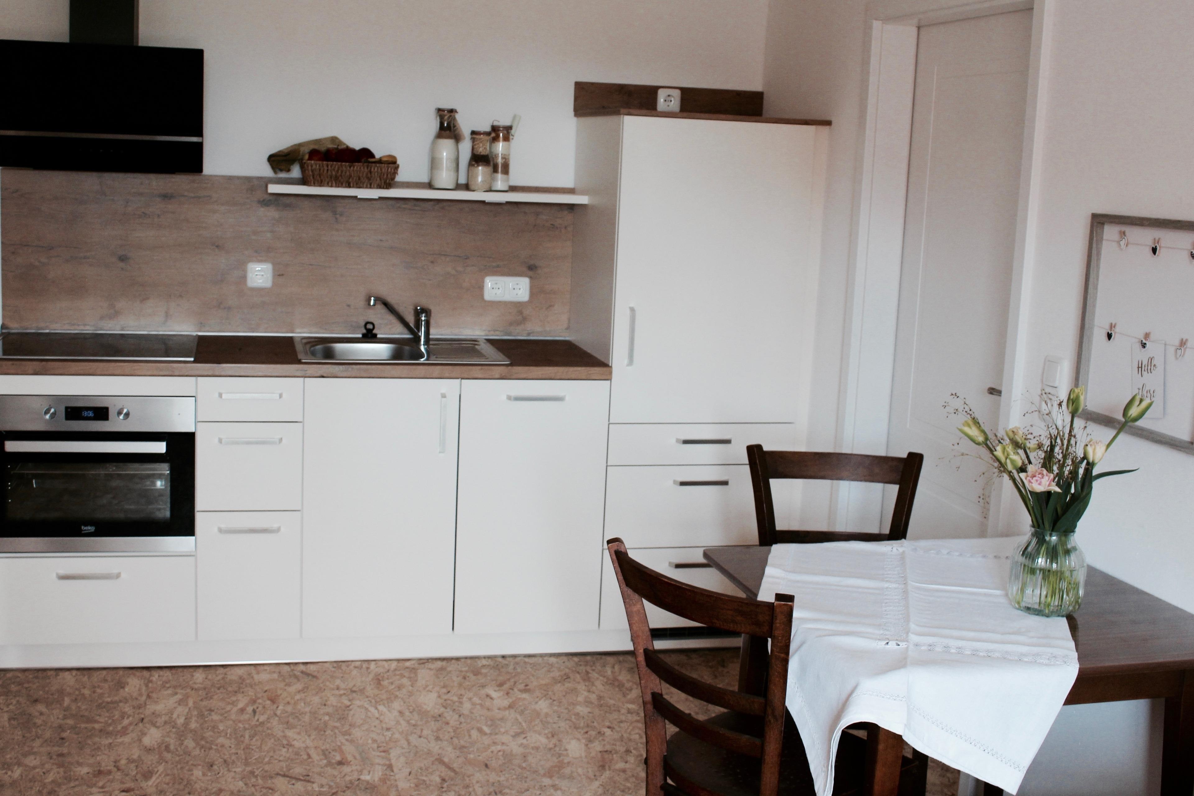 Das Ferienappartement Rosel bietet Platz für bis zu drei Personen und eignet sich damit ideal für kleine Familien. Es befindet sich im 1. Obergeschoss des Landhauses Weserbergland und hat eine hübsche Wohnküche mit Essbereich und Ecksofa mit Schlaffunktion. Die Küche verfügt über eine voll ausgestattete Küchenzeile mit 4-Plattenherd, Backofen, Kühlschrank mit Gefrierfach und Geschirrspülmaschine.