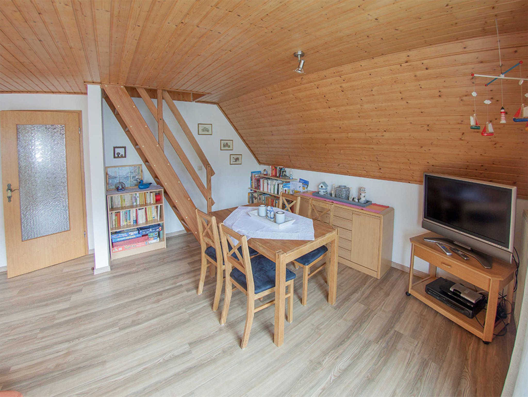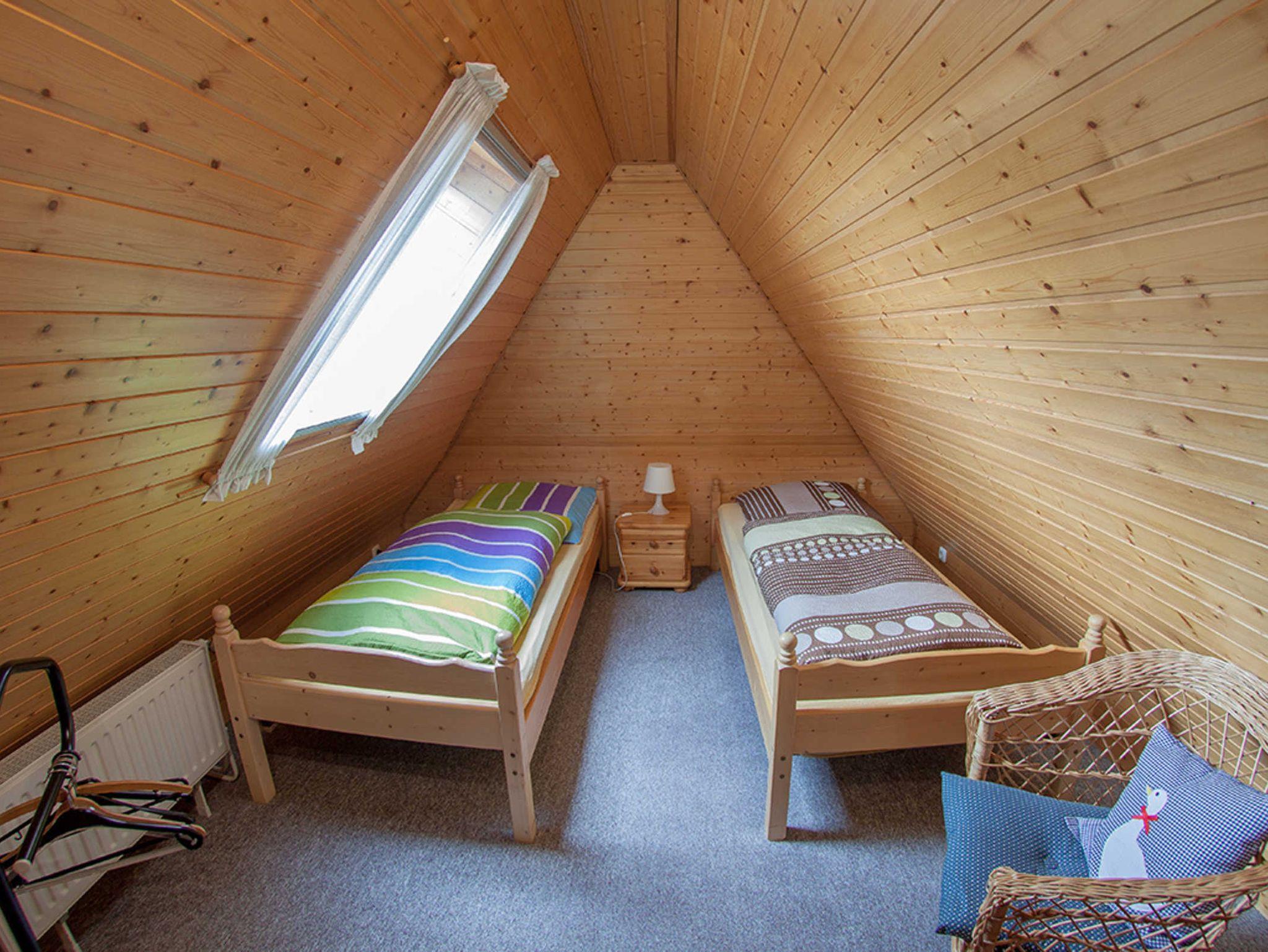 Vom Wohnzimmer aus gelangen Sie über eine Holztreppe ins gemütlich ausgebaute Dachgeschoss mit weiteren zwei Schlafräumen mit je zwei Einzelbetten. Im oberen Schlafbereich bieten wir zusätzlich einen Flachbild-Fernseher und einen DVD-Player.