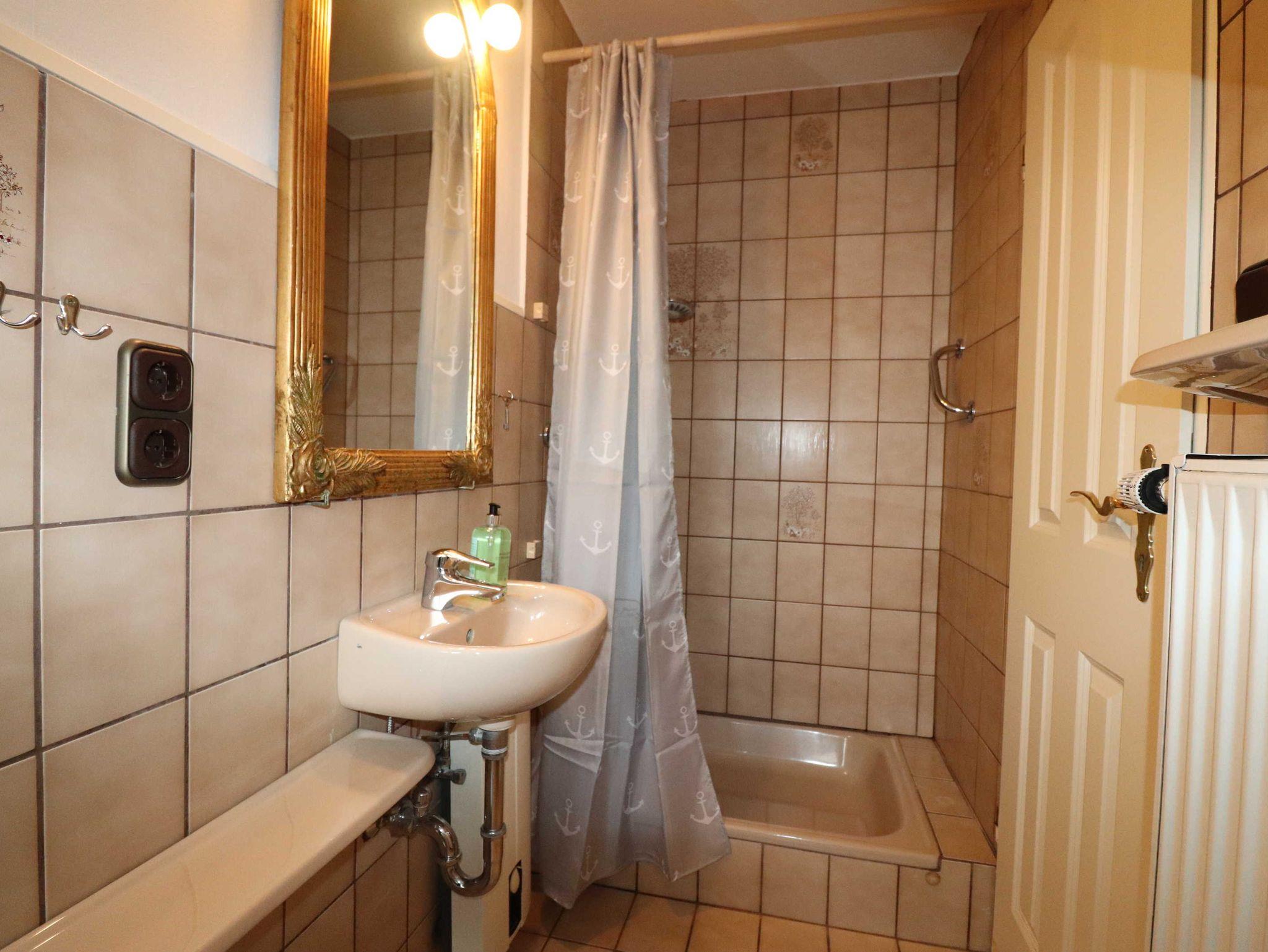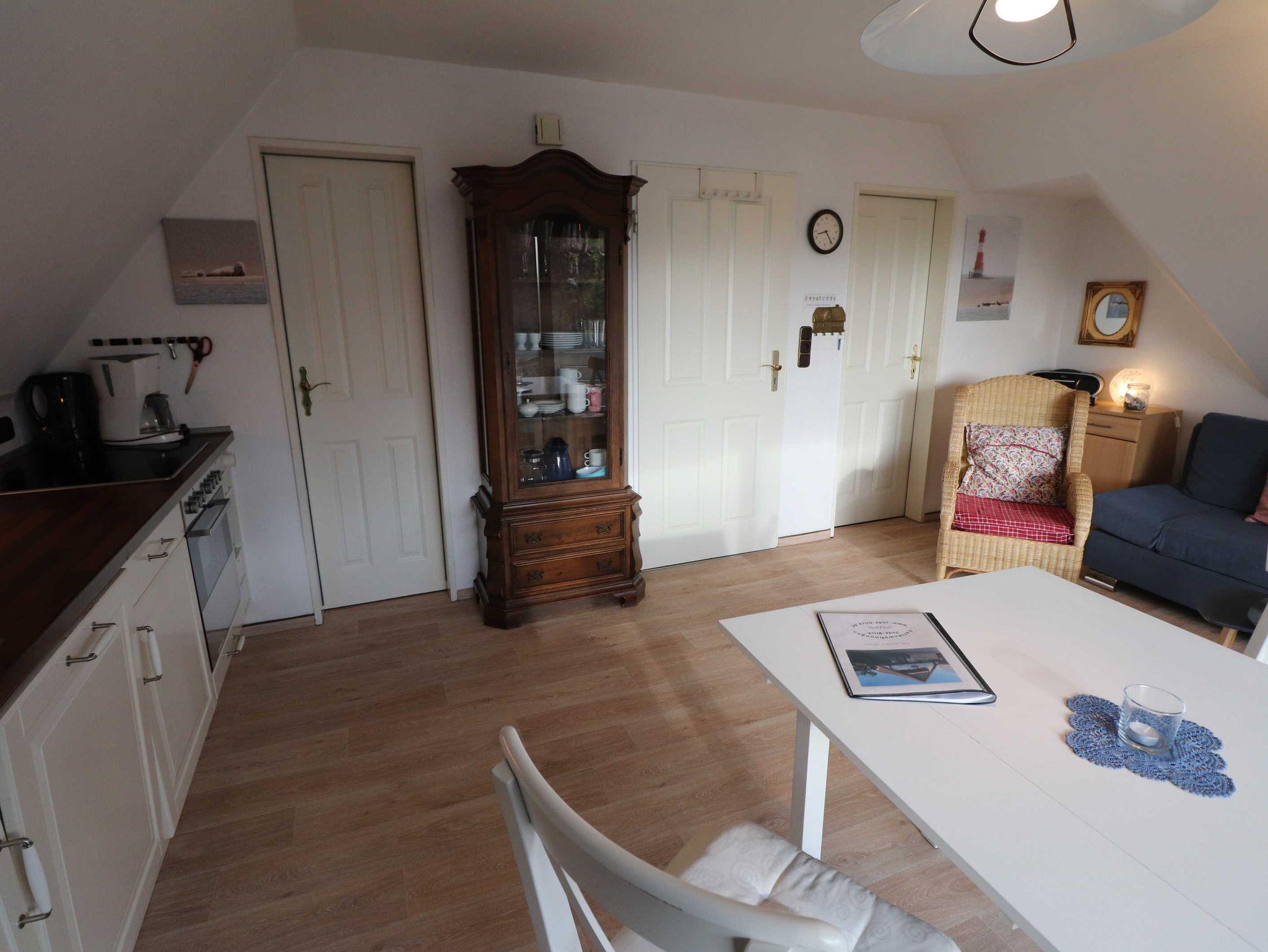 Unsere Wohnung im Obergeschoss rechts ist ca. 39m² groß. Aus dem großen Fenster im Wohn-/Esszimmer sowie vom davor liegenden Balkon haben Sie den Jadebusen im