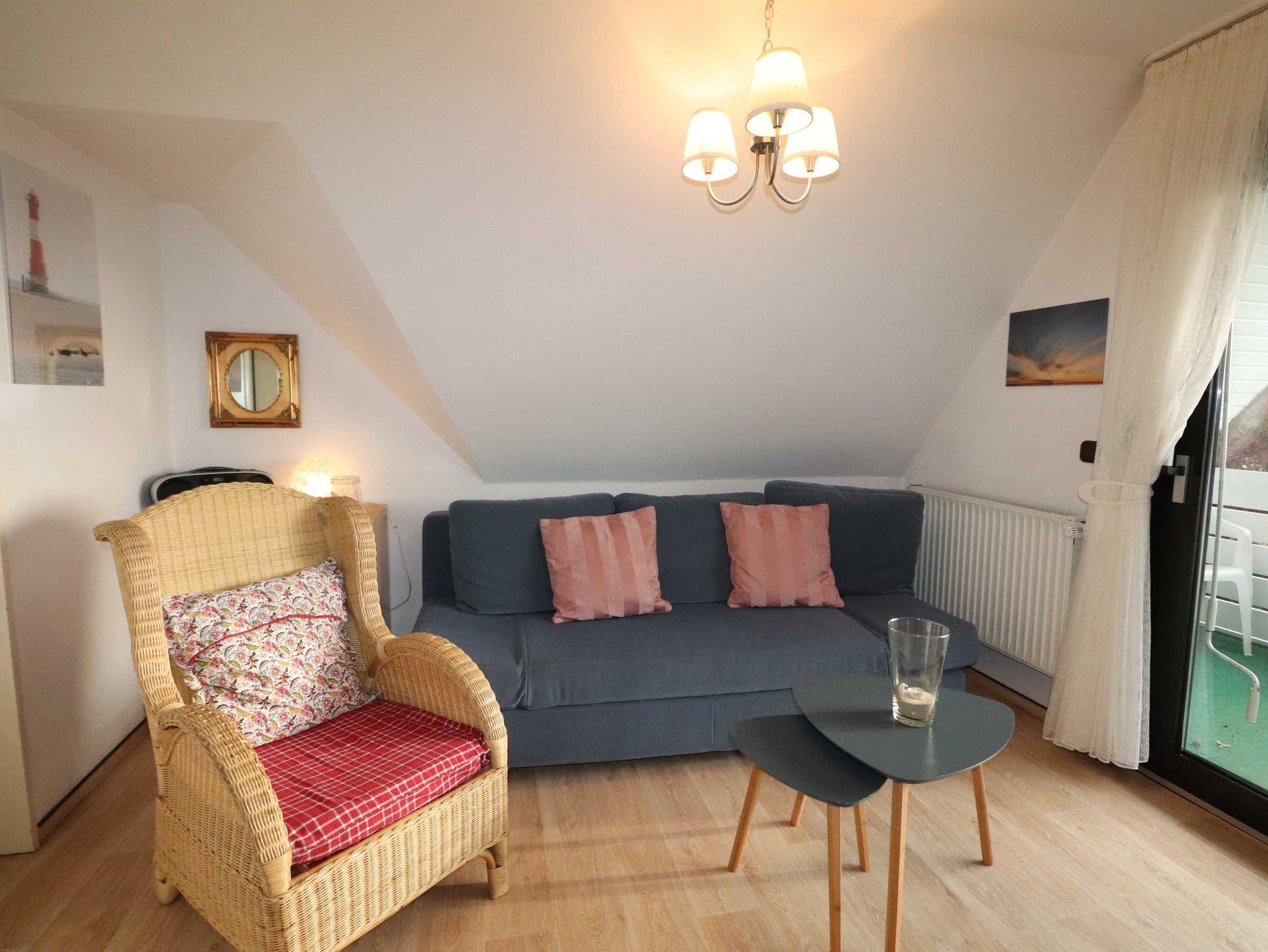 Die Wohnung ist etwa 39m² groß und verfügt über eine moderne technische Ausstattung, neben einem Radio mit CD-Laufwerk steht Ihnen ein moderner Flachbildfernseher mit Satellitenempfang zur Verfügung. Die voll ausgestattete Küche bietet neben einer Mikrowelle, einem Kühlschrank und einer Kaffeemaschine auch einen Geschirrspüler, so dass Sie in Ihrem Urlaub auf keinen Komfort verzichten müssen. Für weitere Gäste lässt sich das Sofa im Wohnzimmer zu einem vollwertigen Doppelbett ausklappen, so dass insgesamt bis zu vier Personen in unserer Wohnung im Obergeschoss rechts Platz finden.