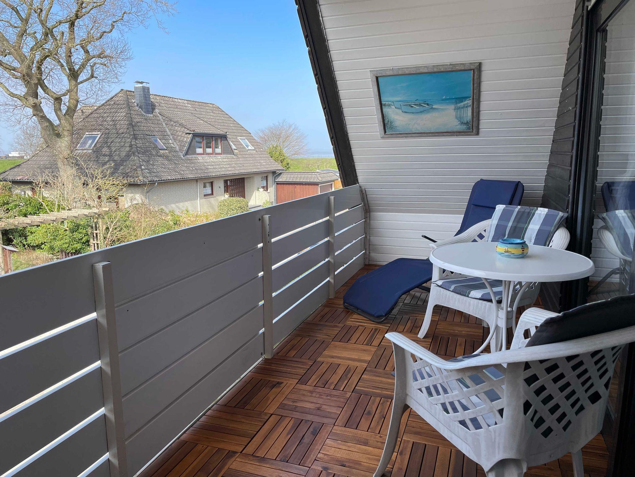 Unsere Wohnung im Obergeschoss rechts bietet den Blick auf den Jadebusen aus dem Wohnzimmer sowie vom Balkon aus und verfügt neben einem Wohn-/Esszimmer mit Küchenzeile über ein Duschbad sowie ein Schlafzimmer mit zwei Einzelbetten, die zu einem Doppelbett zusammengeschoben werden können.