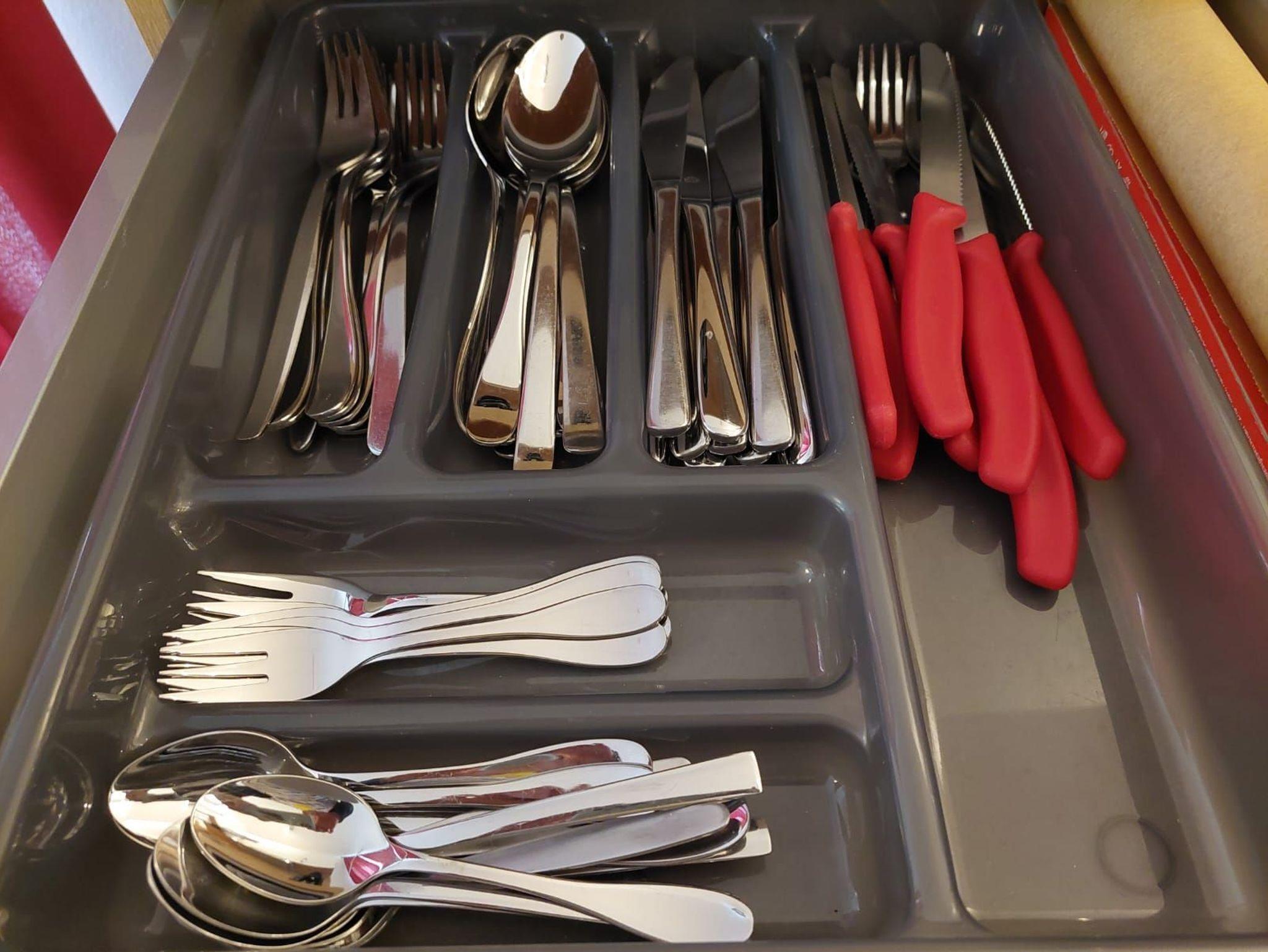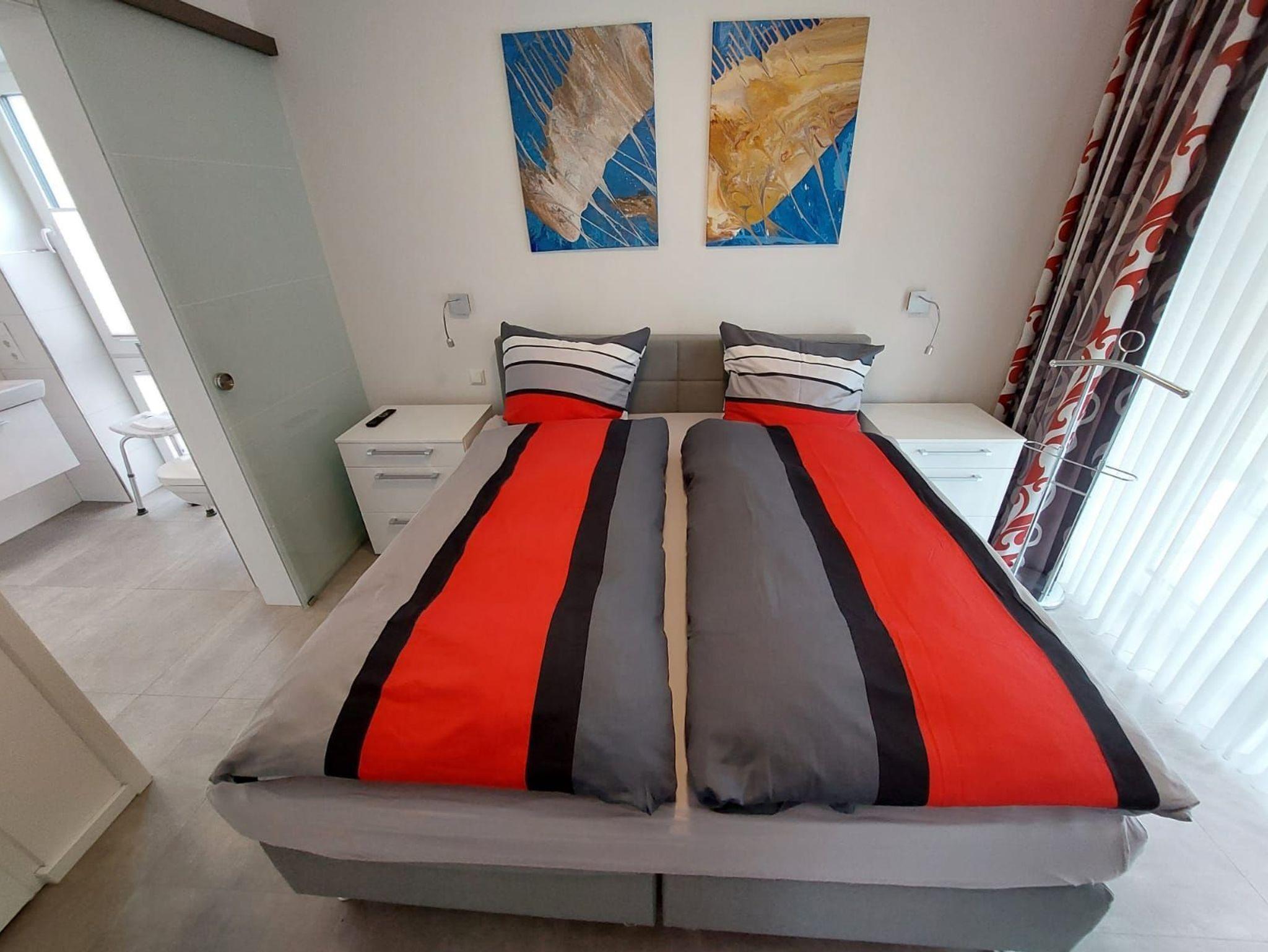 Der Einbauschrank sowie die großen Nachtschränke bieten reichlich Platz zur Unterbringung der mitgebrachten Kleidung.