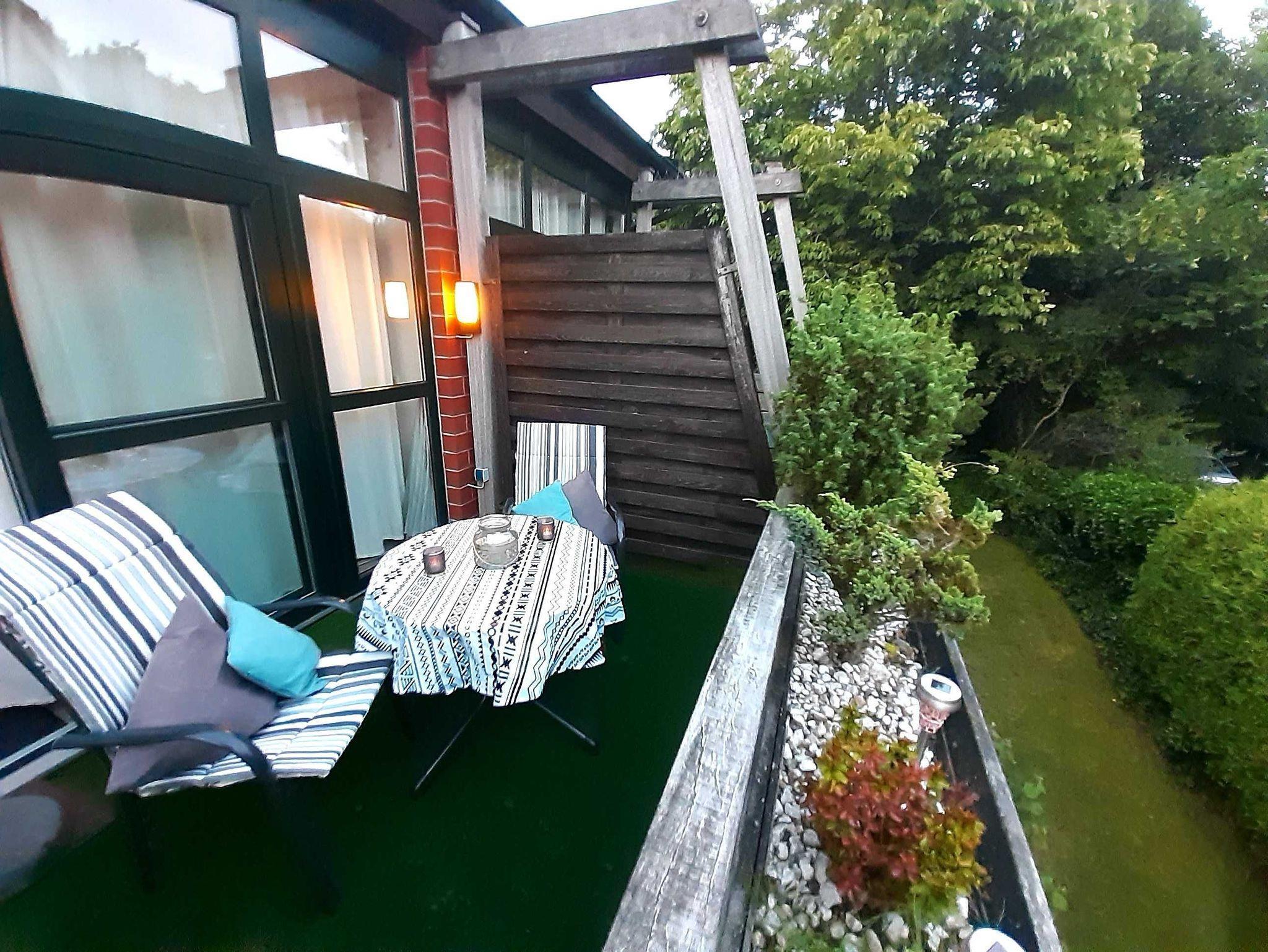 Auf dem dazugehörigen Balkon lässt sich wunderbar die Sonne genießen. Ein Sonnenschirm steht selbstverständlich auch zur Verfügung.