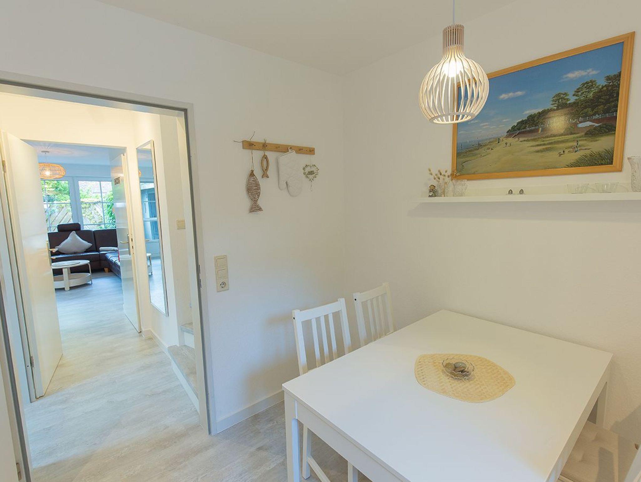 Von der Haustür aus gelangen Sie in einen kleinen Flur, wo Schuhe und Jacken schnell verstaut werden können. Hier befindet sich auch das Gäste-WC. Die gemütlich eingerichtete Küche bietet genügend Platz zum Klönen und Kochen und hat alles, um den Urlaub genießen zu können. Vom geräumigen Wohnzimmer haben Sie die Möglichkeit, auf der großen Terrasse zu entspannen. Die dortige Goldulme ist ein zusätzlicher Blickfang. Der angrenzende große Dachunterstand bietet zudem viel Platz für z.B. Fahrräder oder einfach für einen Aufenthalt im Schatten (oder um bei Schietwetter im Freien zu sitzen).