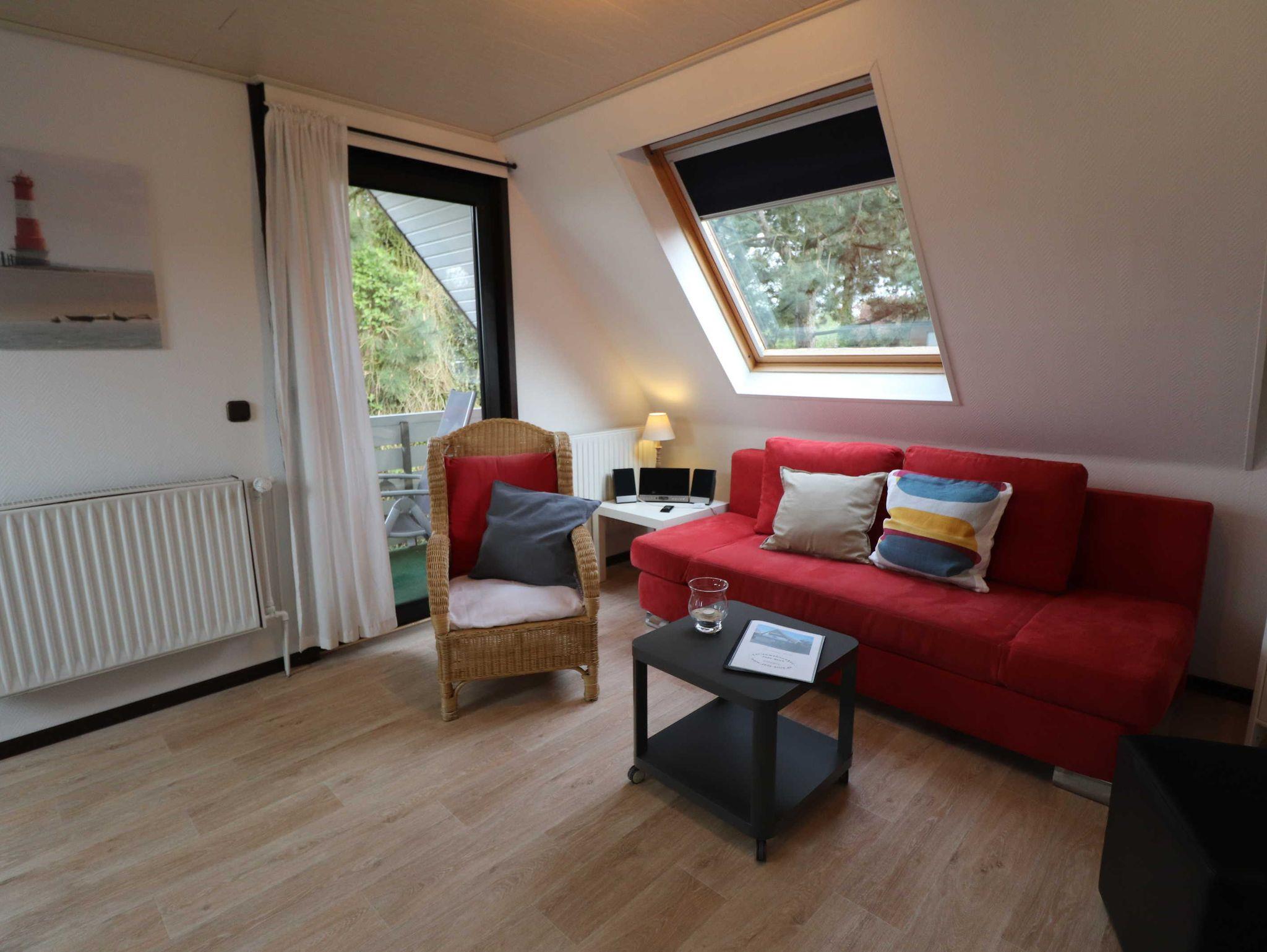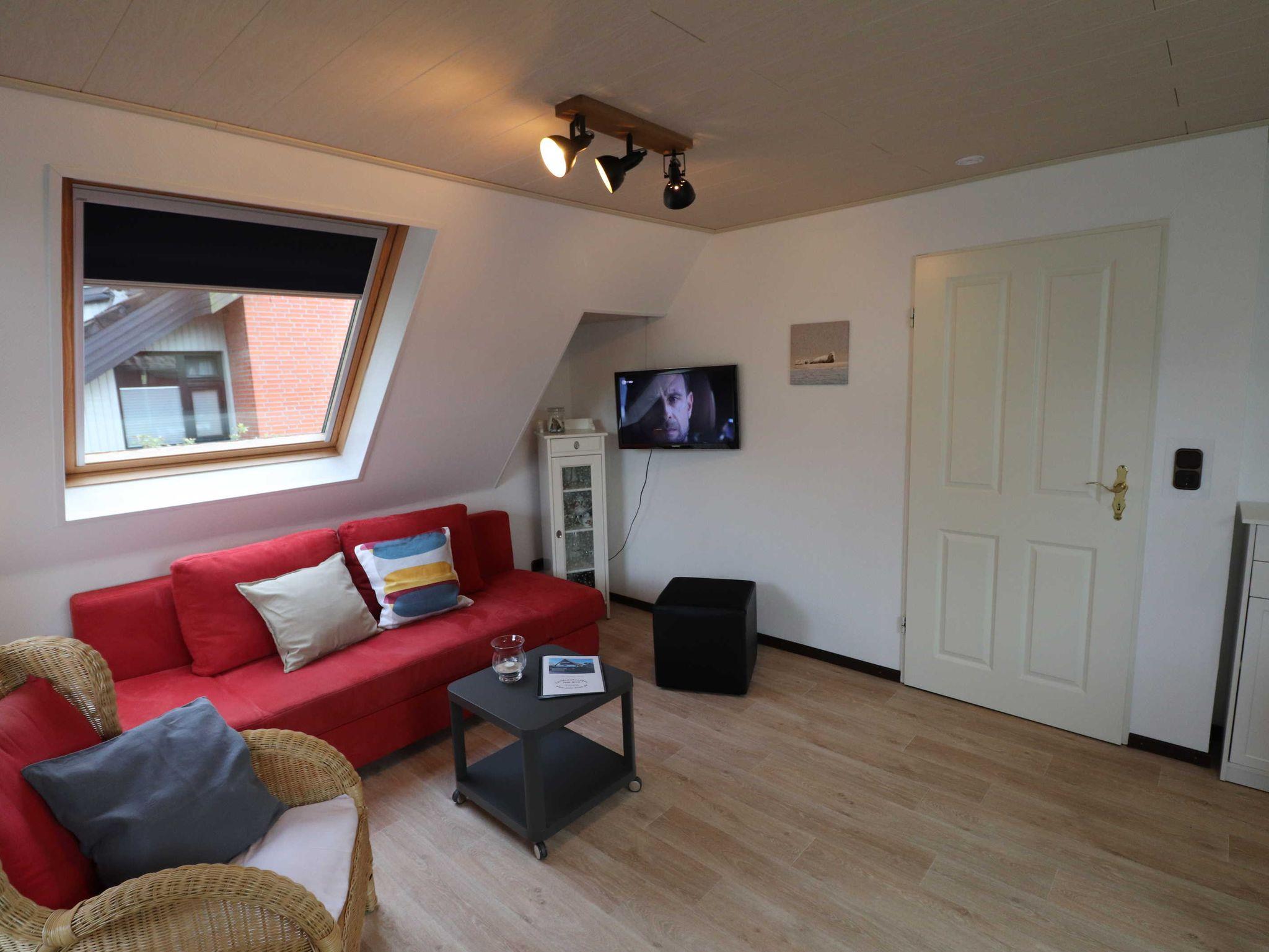 Die etwa 39m² große Wohnung im Obergeschoss links bietet den Blick auf den Jadebusen aus dem Dachfenster an der Küchenzeile. Auch in dieser Wohnung gibt es neben dem Wohn-/Esszimmer mit Küchenzeile ein Schlafzimmer mit zwei Einzelbetten (90 cm x 2,00m), das Badezimmer dieser Wohnung ist mit einer Badewanne ausgestattet. Die Wohnung verfügt über eine moderne technische Ausstattung: neben einem Radio mit CD-Laufwerk steht Ihnen ein moderner Flachbildfernseher mit Satellitenempfang zur Verfügung. Die voll ausgestattete Küche bietet neben einer Mikrowelle, einem Kühlschrank und einer Kaffeemaschine auch einen Geschirrspüler, so dass Sie in Ihrem Urlaub auf keinen Komfort verzichten müssen. Für weitere Gäste lässt sich das Sofa im Wohnzimmer zu einem vollwertigen Doppelbett ausklappen, so dass insgesamt bis zu vier Personen in unserer Wohnung im Obergeschoss links Platz finden.