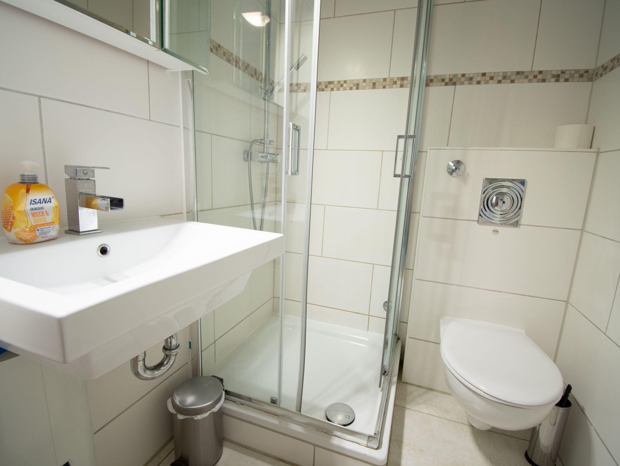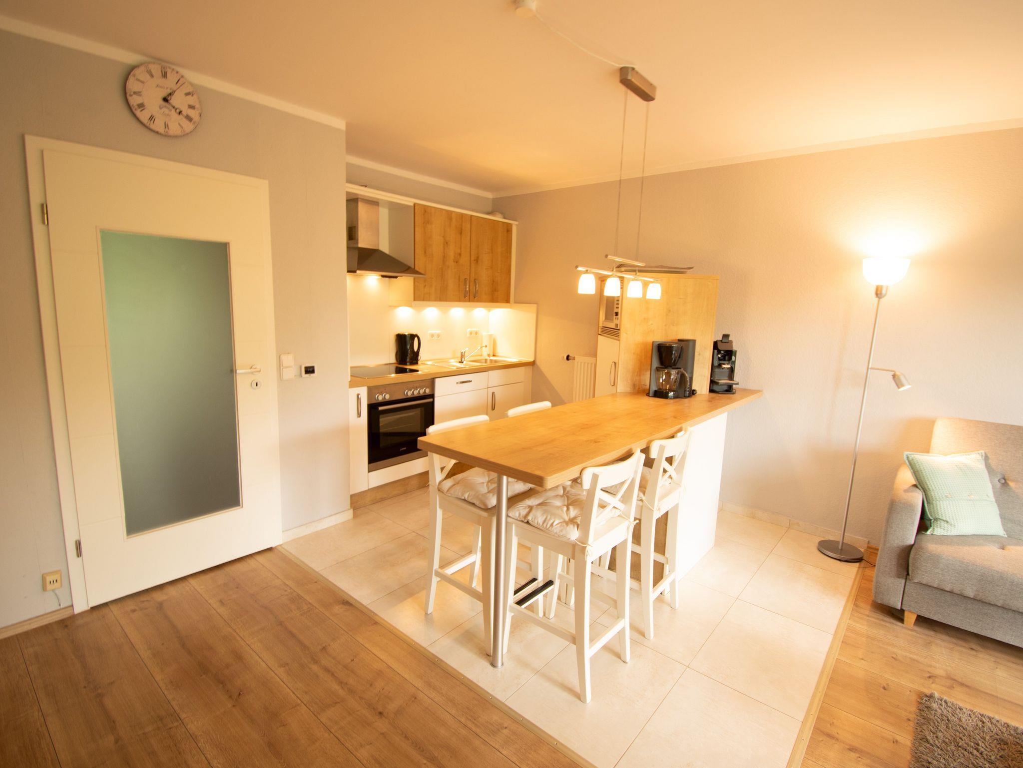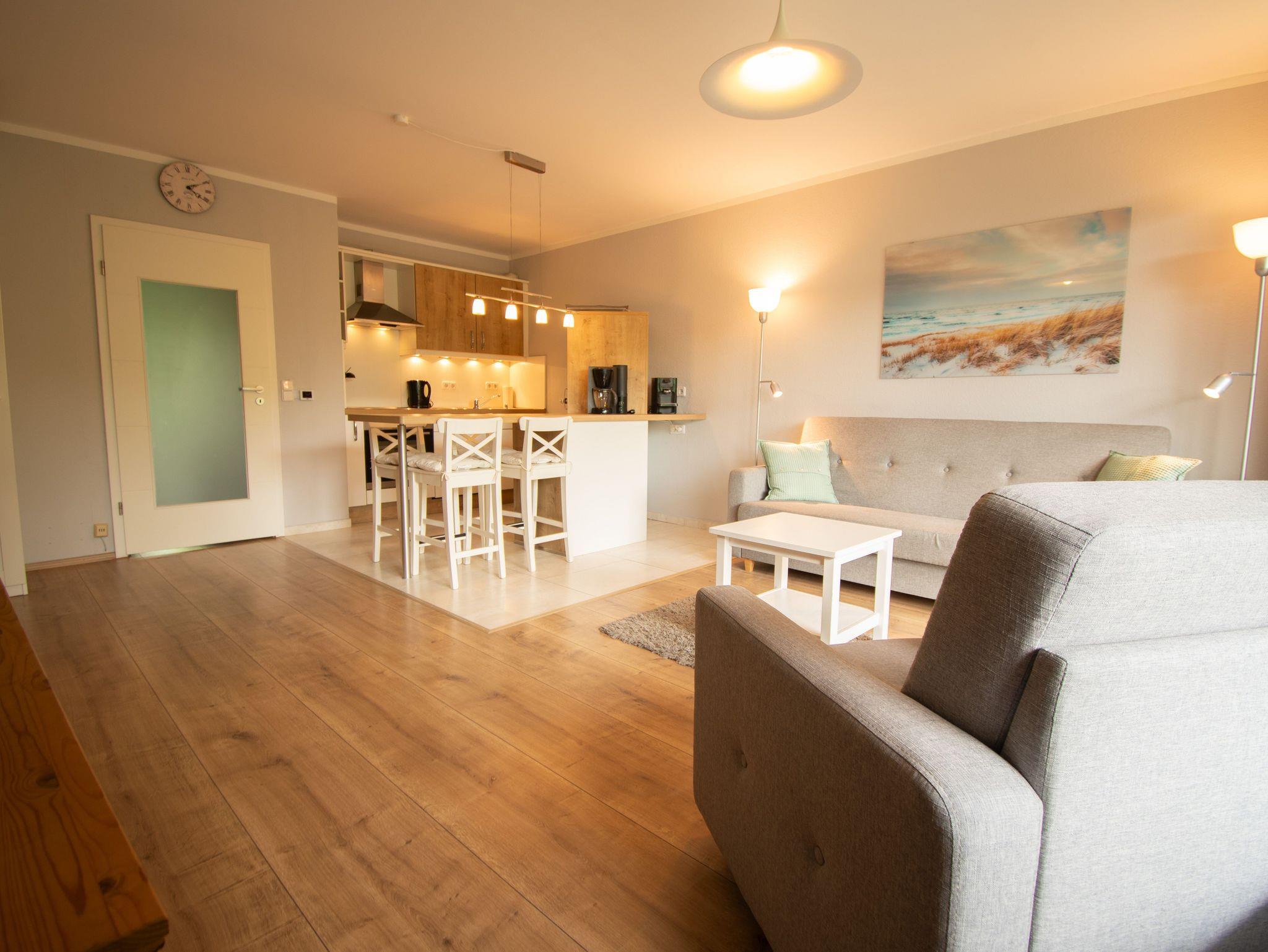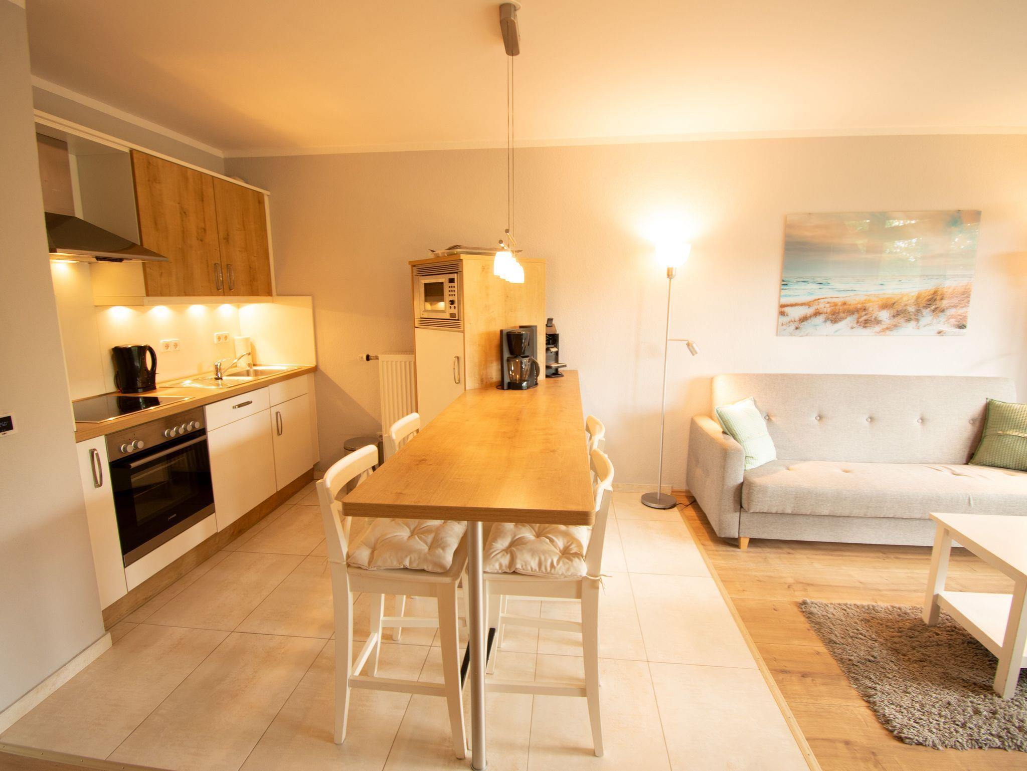 Moin Moin in unserer schicken Wohnung Watt´n Blick auf der zweiten Etage in einem Mehrparteienhaus im Herzen von Dangast. Hier verbringen Sie ihren Urlaub sehr ruhig in einer reinen Wohnstraße und doch strandnah. Durch den großzügigen Flurbereich gelangen Sie ins Wohn/Esszimmer mit Küchenzeile und gegenüber einem Theken-Essplatz. Hier befindet sich auch der schicke Wohnbereich mit Ausgang zum sichtgeschützten großen Balkon mit Mobiliar und Blick ins Grüne. Genießen Sie die frische friesische Luft. Die Wohnung hat zwei Schlafräume - der erste ist ausgestattet mit Boxspringdoppelbett und Kleiderschrank, der zweite bietet ein Tandembett - unten ausziehbar . Das schicke Duschbad hat einen geräumigen Waschplatz mit - einer kleinen - Duschkabine aber einem flachem Einstieg.